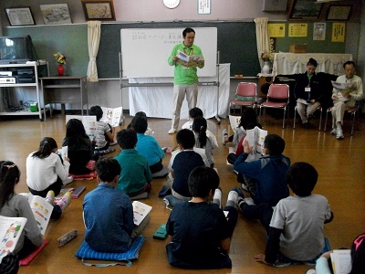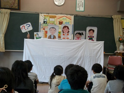 玉川小学校では、授業の一環として毎年4年生を対象に開催し、我々も小学生でも解りやすいように「紙人形劇 ごろうじいちゃん」を行なったりと工夫しています。