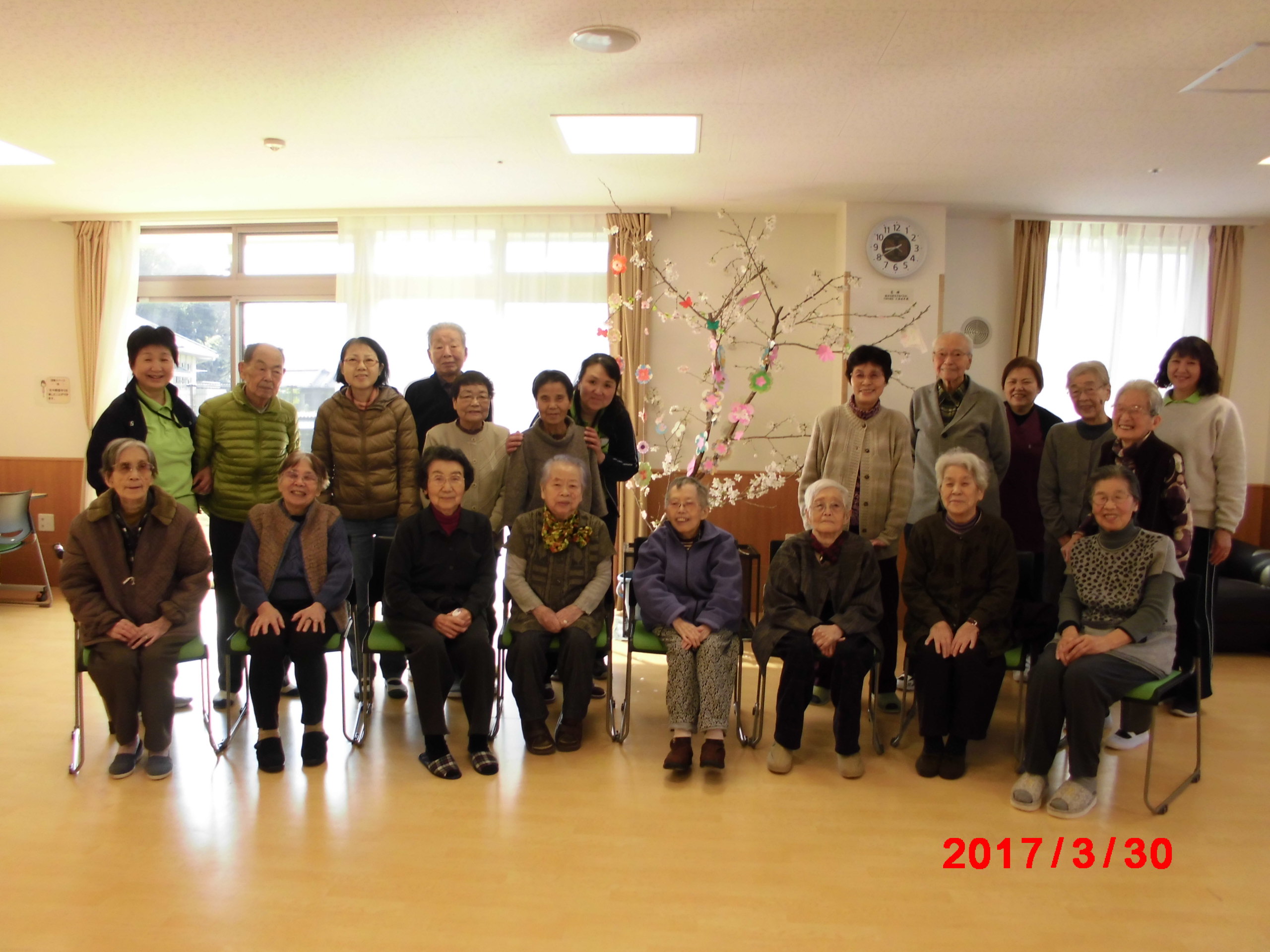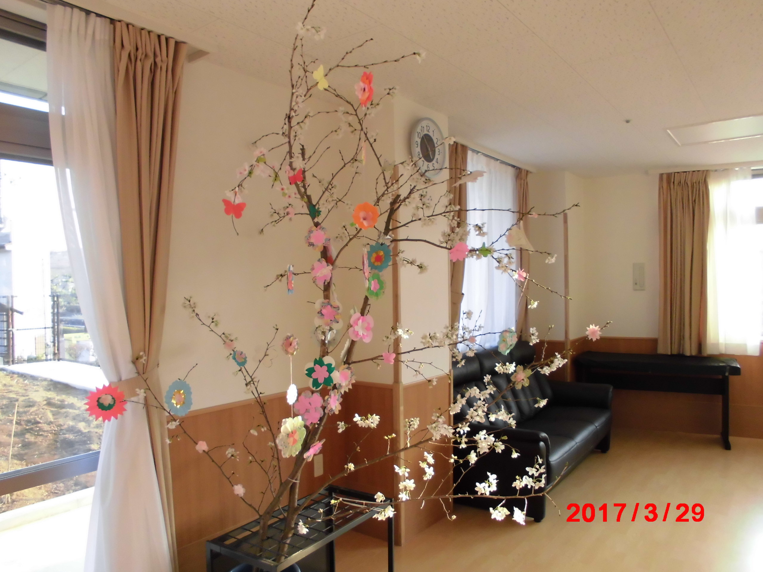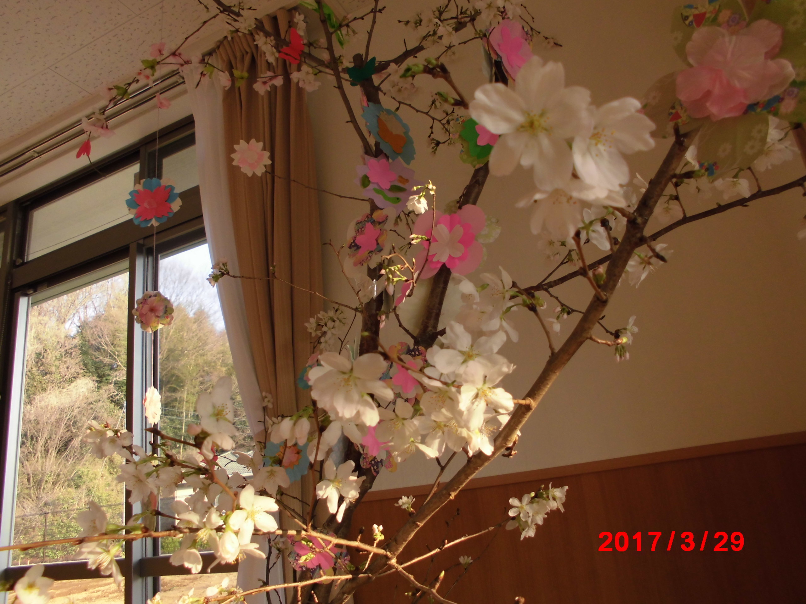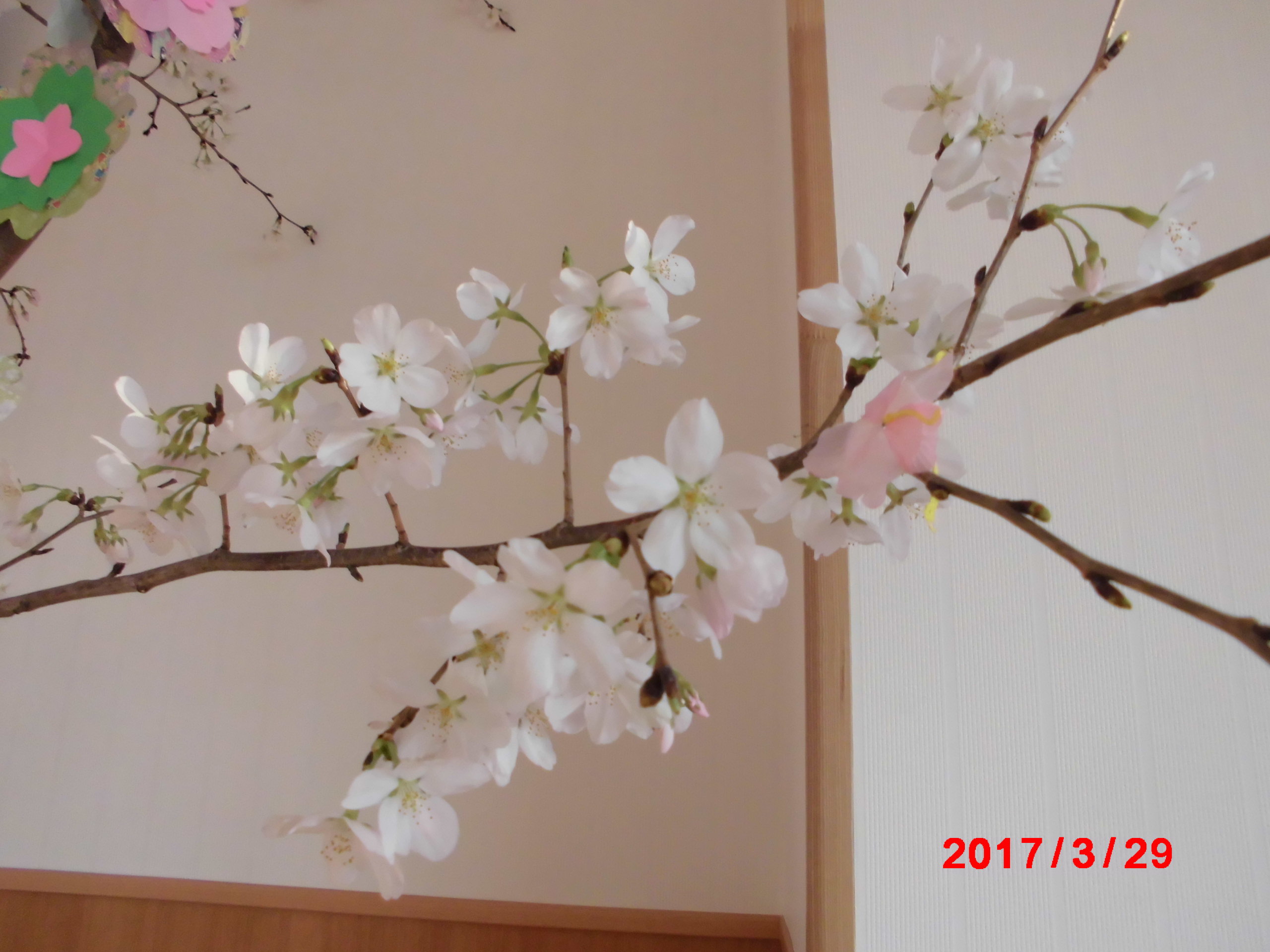 まだ、つぼみが固い桜の枝に紙で花をつくり飾りましたが数日後には本物の花で満開となりました。 まさか、咲くとは思いませんでしたので皆さんビックリです。 みんなの笑顔も満開です。 4月7日は屋上でお花見昼食会を予定しています。楽しみです。