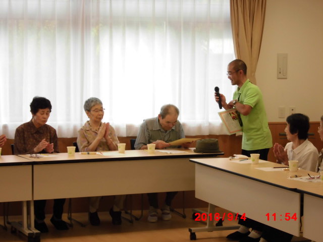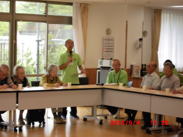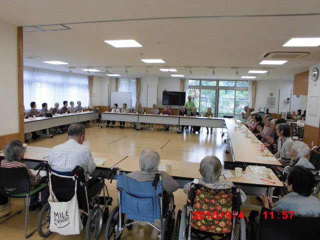 小町山グリーンホームでは、毎月第1火曜日に入居者様と職員での意見交換、翌月の行事外出の計画、 当月の行事外出の参加希望の確認、当月の誕生者へ誕生カードをお渡しする等の「お茶会」を 1階地域交流スペースにて開催しております。毎回大勢の方が参加して下さり、お茶を飲みながら 和やかな雰囲気で行っております。 9/4は開催以来最多41名の入居者様に参加していただき、賑わっておりました。