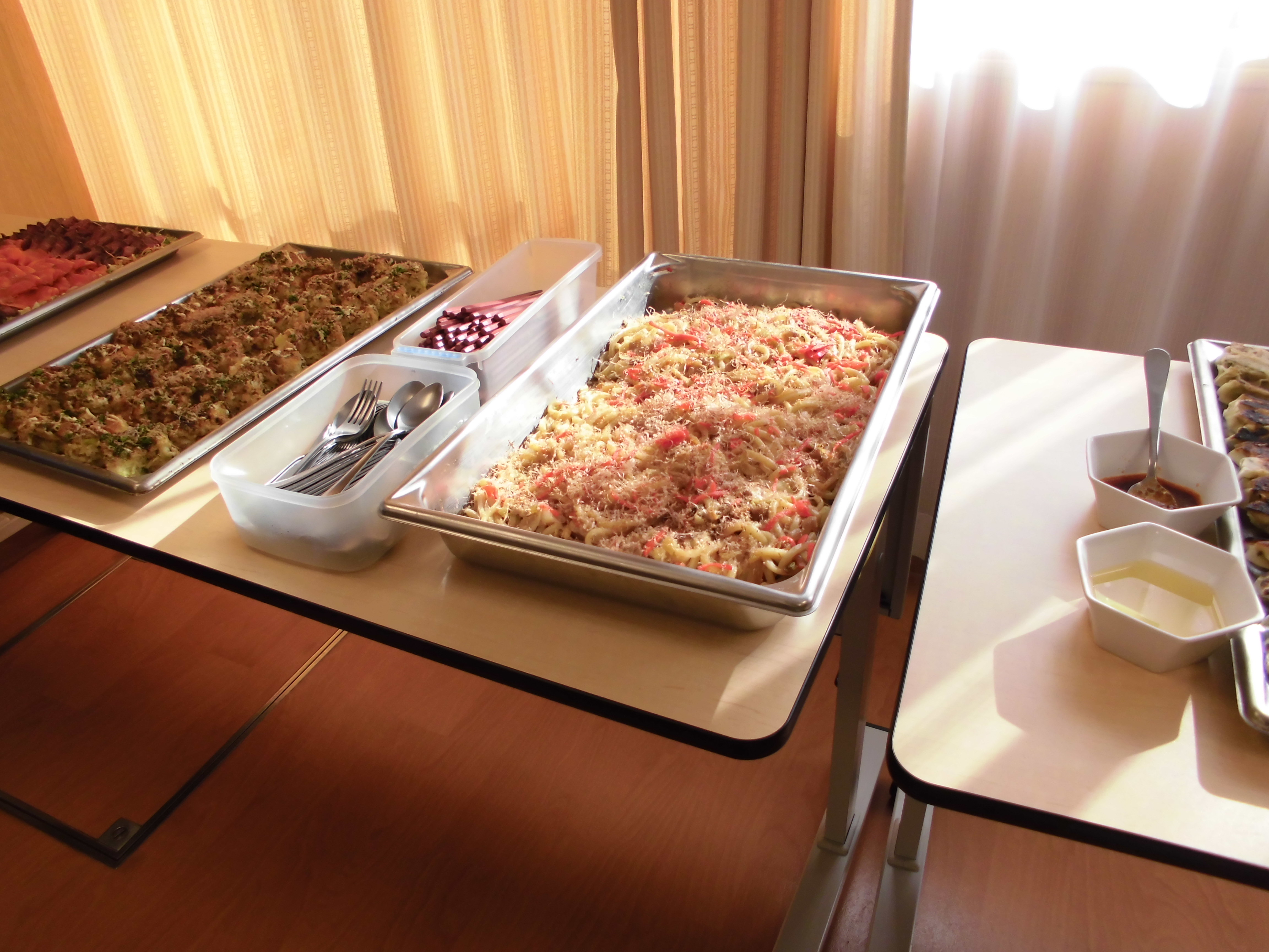 唐揚げ、卵焼き、お好み焼き、焼うどん、ローストビーフ、スモークサーモン、