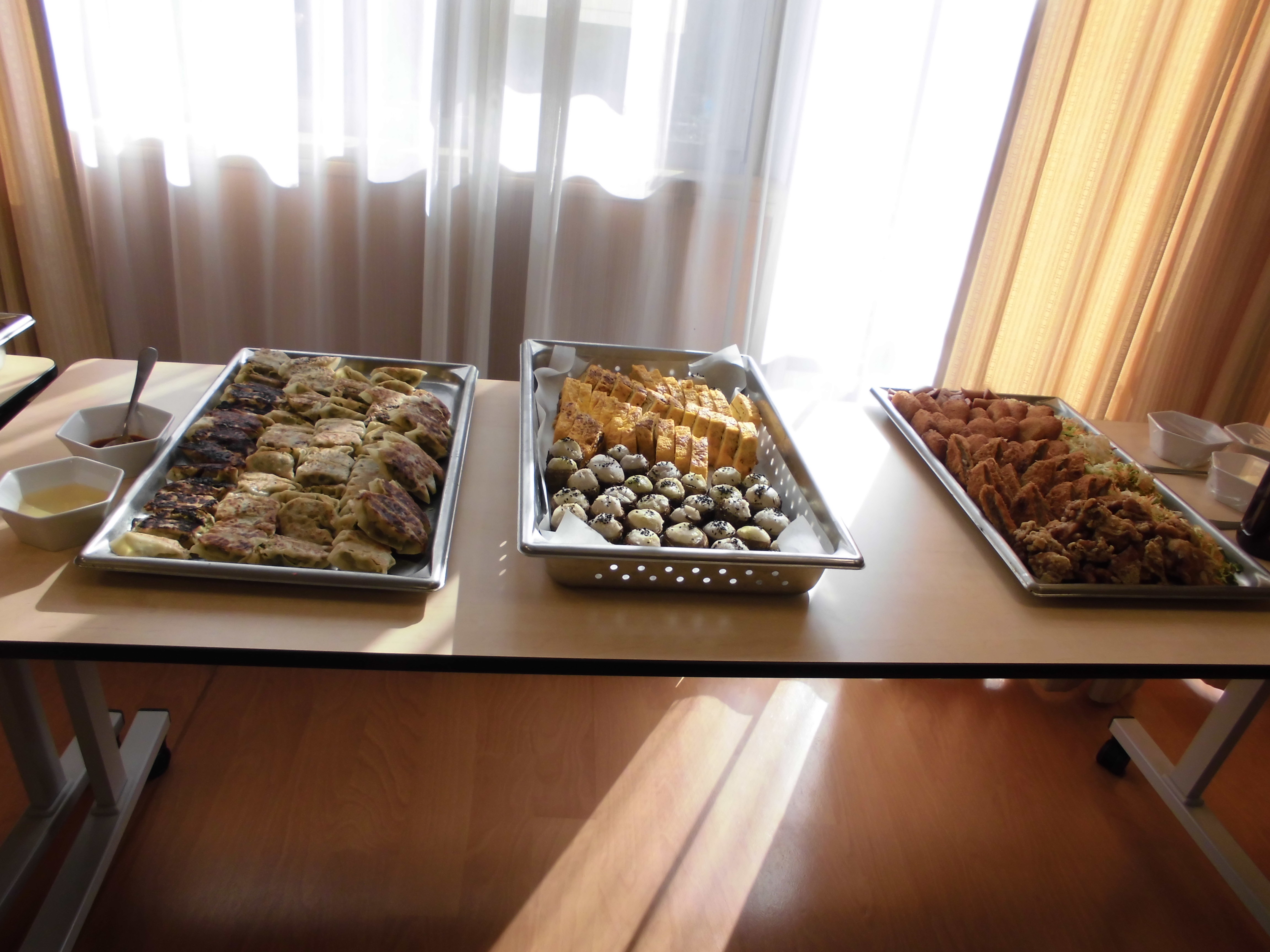 炊き込みご飯、豚汁、里芋、餃子、サラダ、スイートポテト。