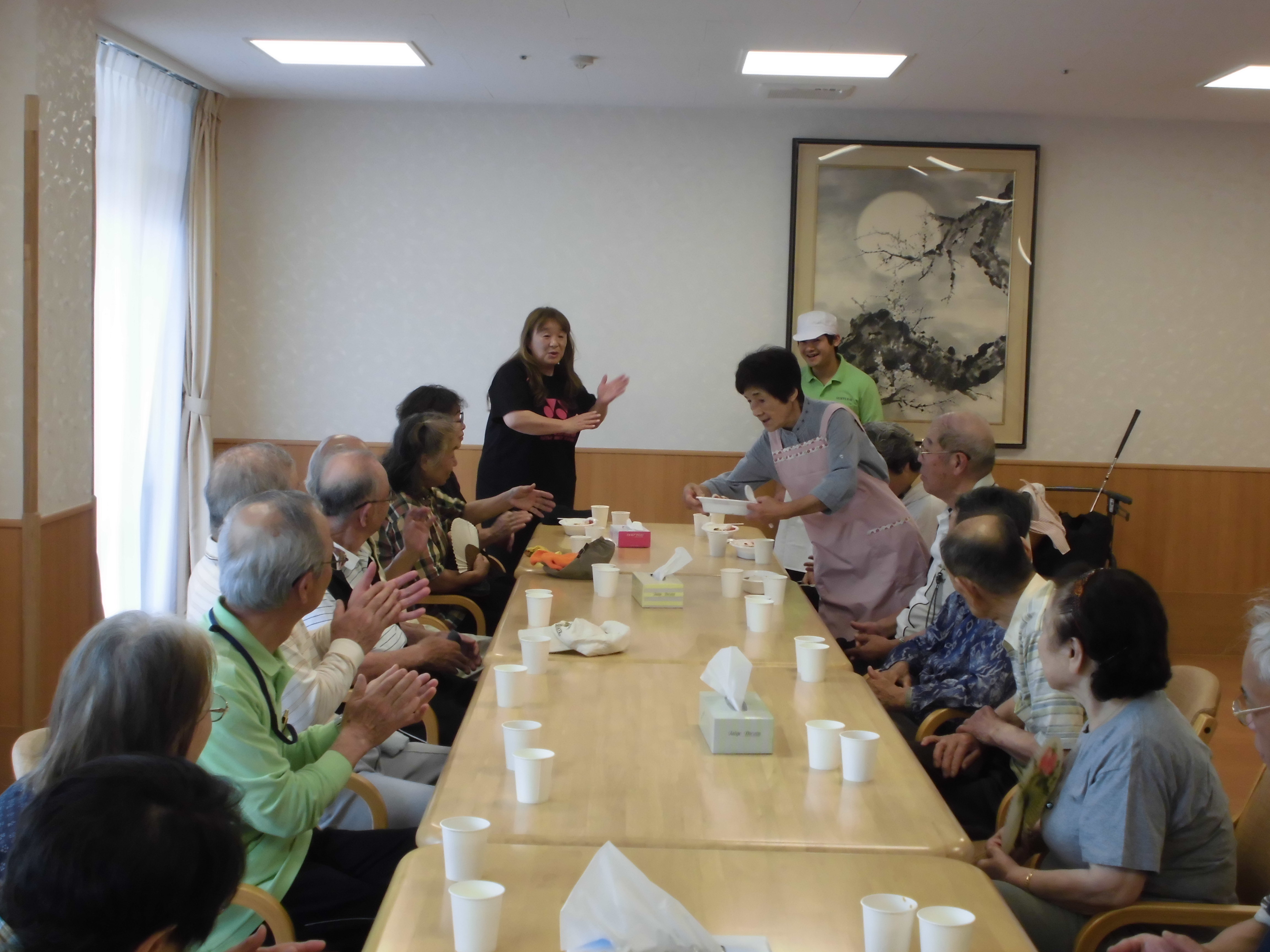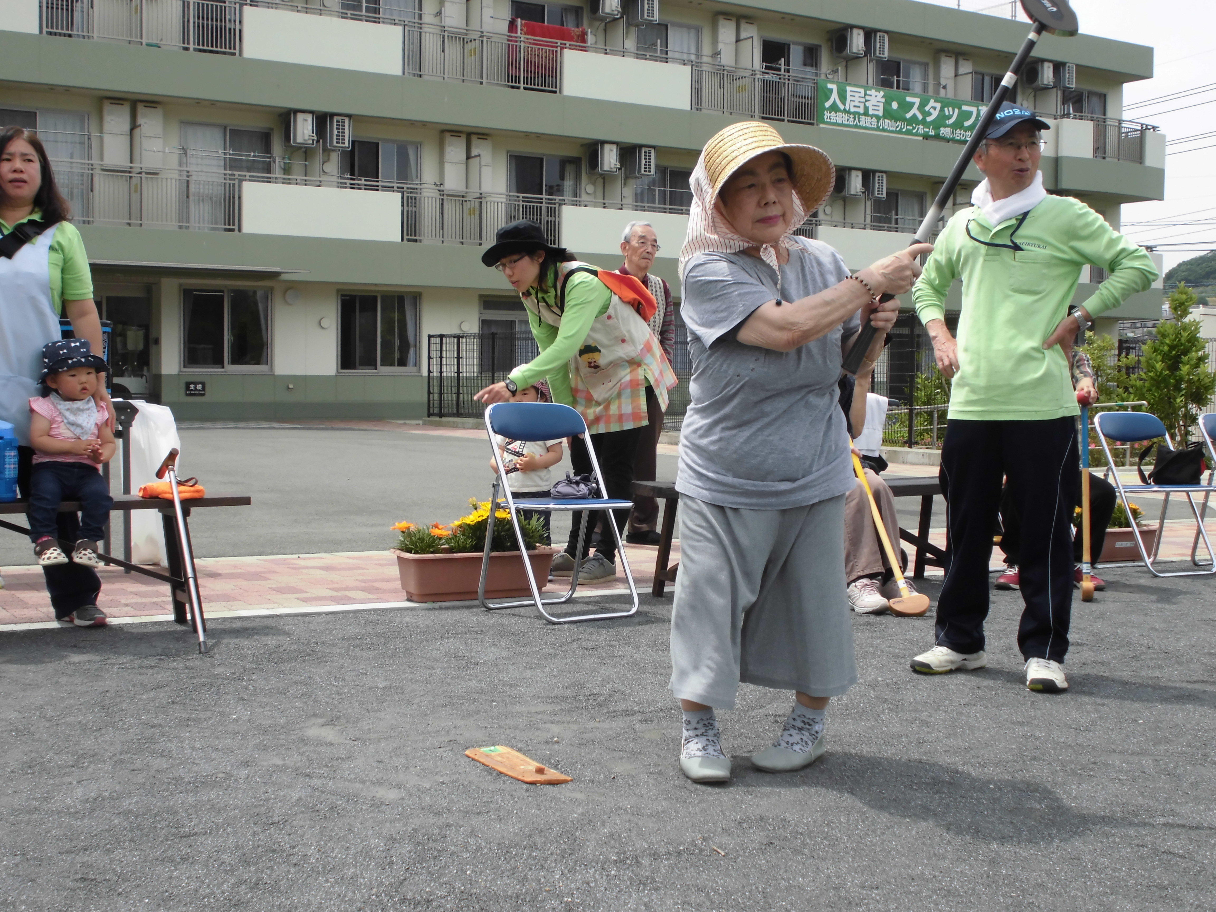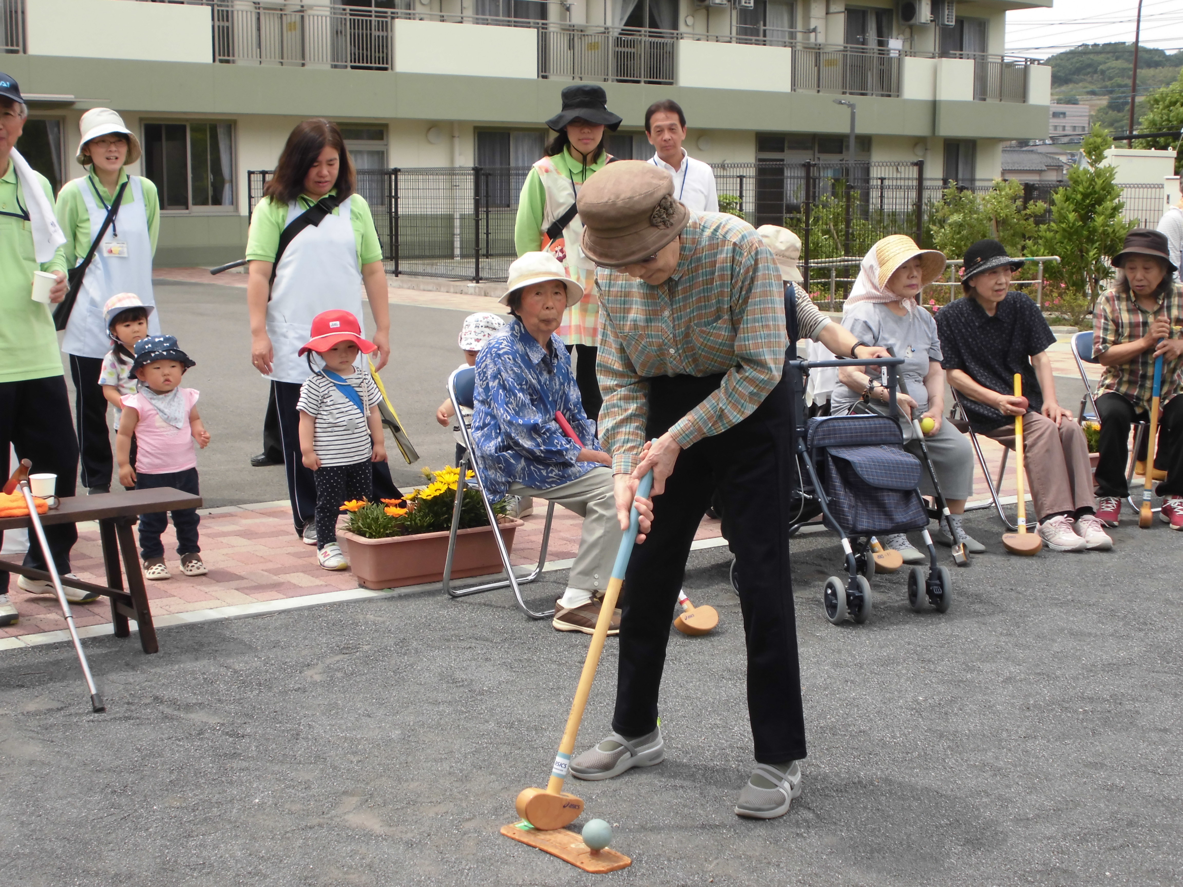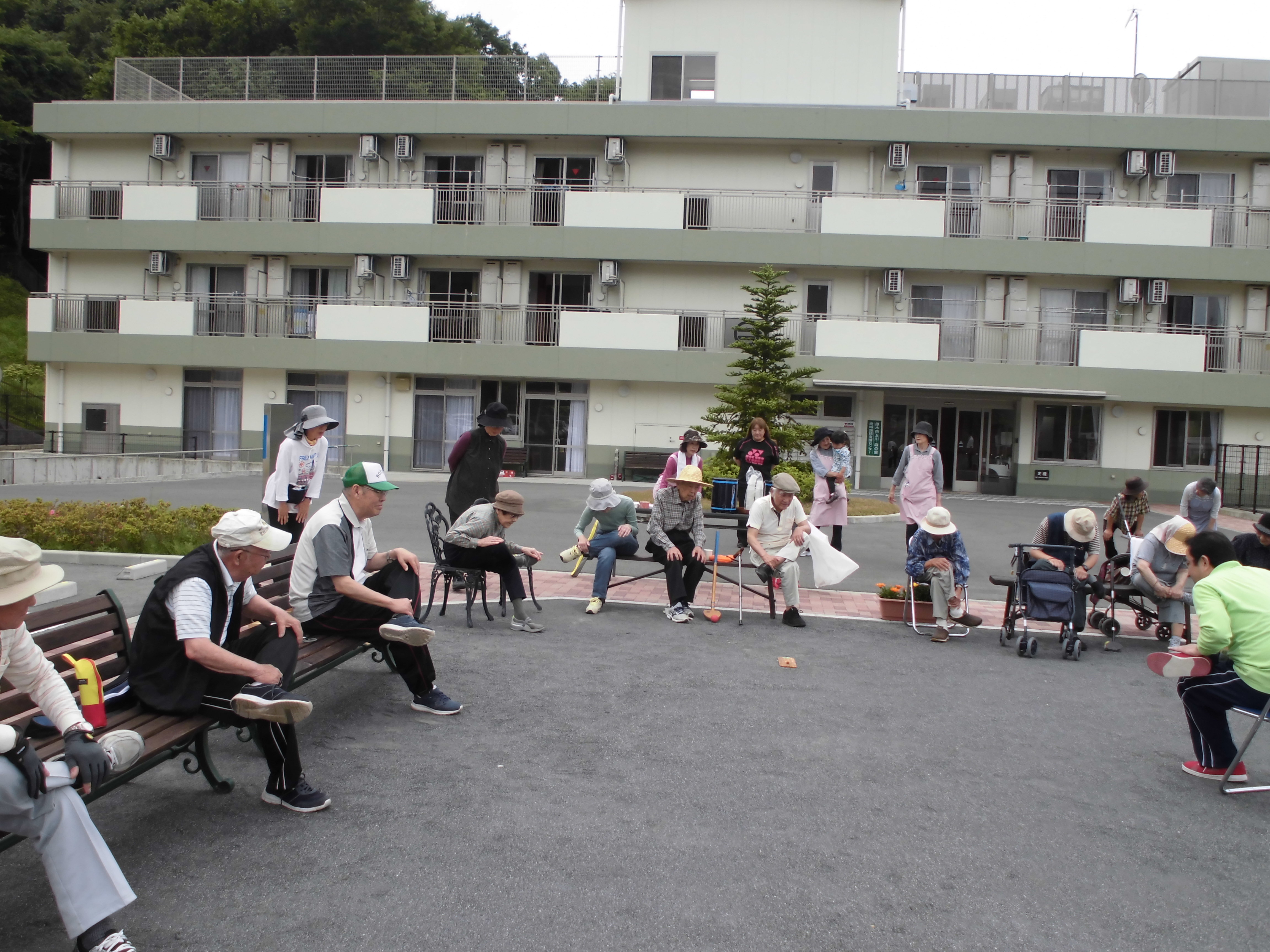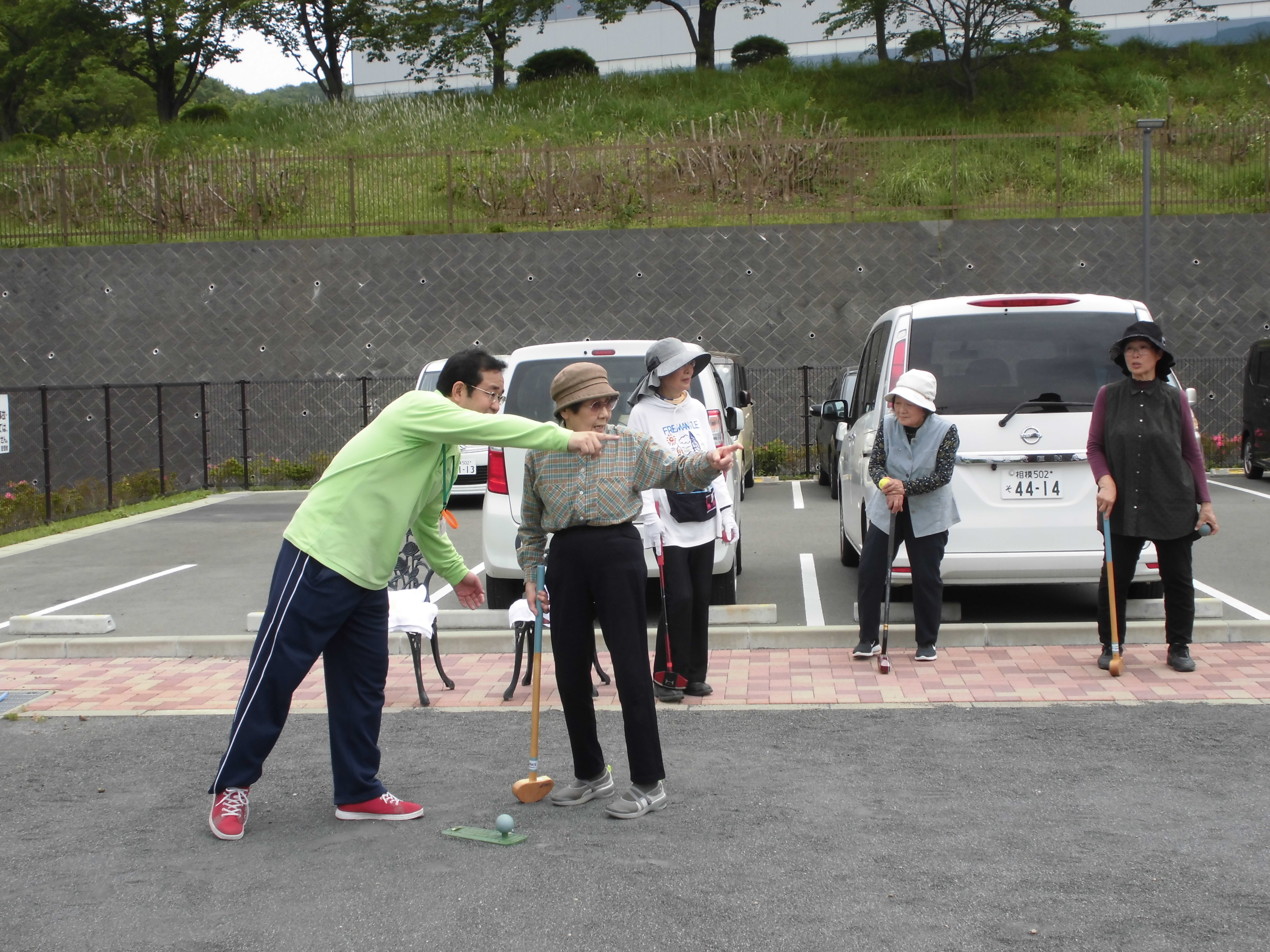 5/17(木)10時よりミニデイサービスに参加し、グランドゴルフを行いました。 とても暑い日でしたが、皆さん張り切って楽しまれておりました。 昼食のカレーも美味しくいただきました。 地域の皆様とも交流を図ることができ、 充実した1 日でした。