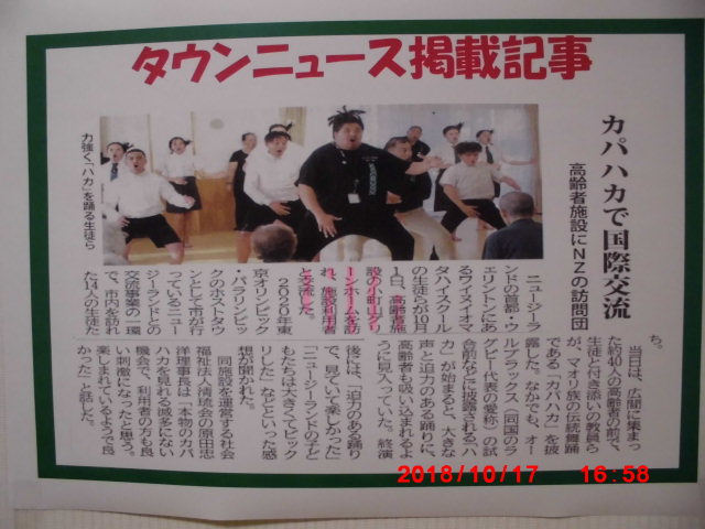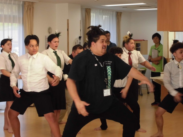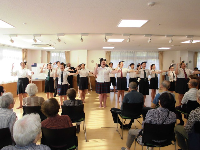 2020年東京オリンピック・パラリンピックのホストタウンとして厚木市が行っているニュージーランドとの交流事業の一環で、10月1日(月)ニュージーランドのワイヌイオマタハイスクール14名の生徒によりカパハカ(マオリ族の伝統舞踊)を披露して下さいました。迫力ある踊りを見て、入居者の皆様喜ばれておりました。 慰問の様子はタウンニュースにも掲載されました。