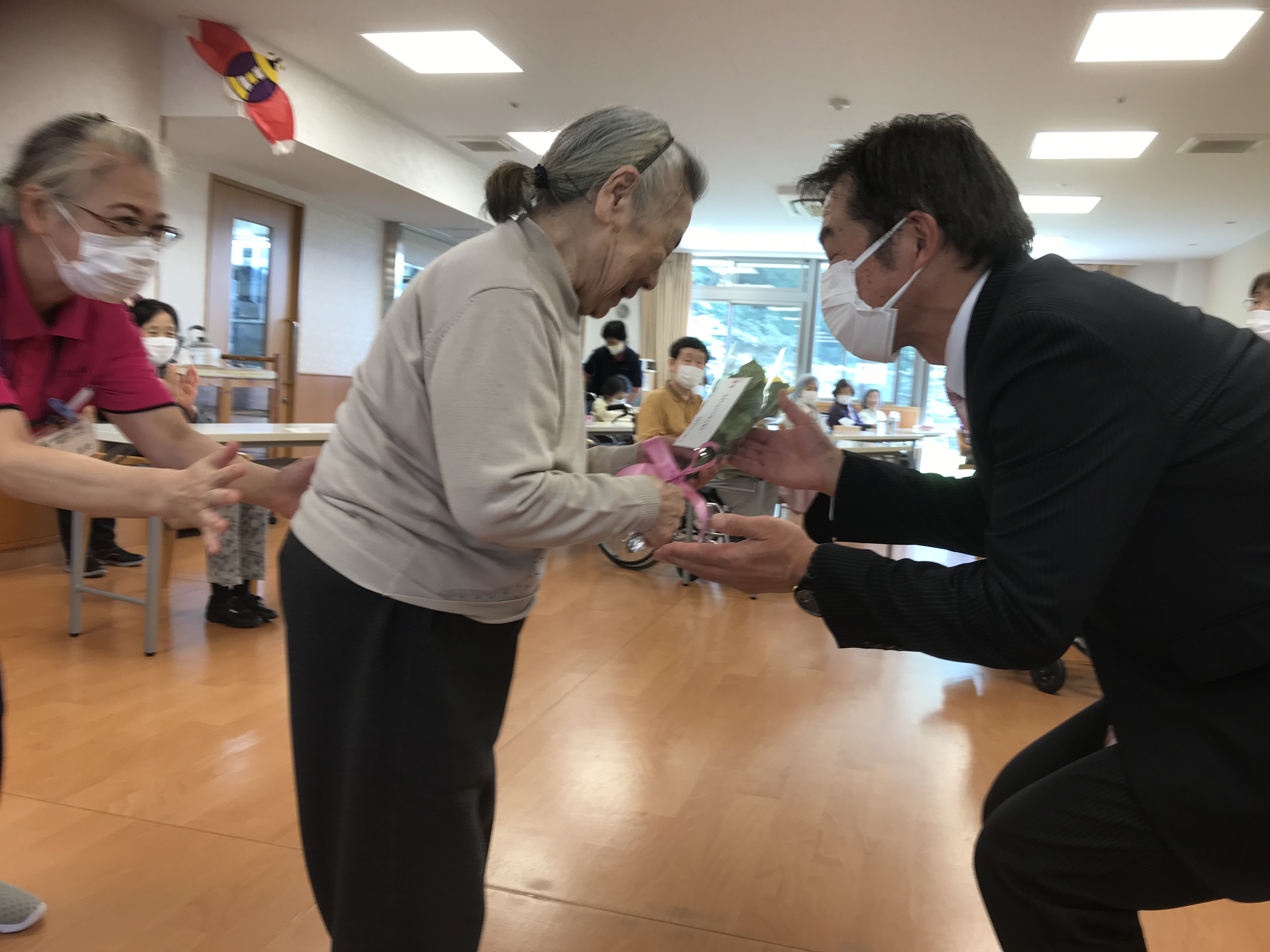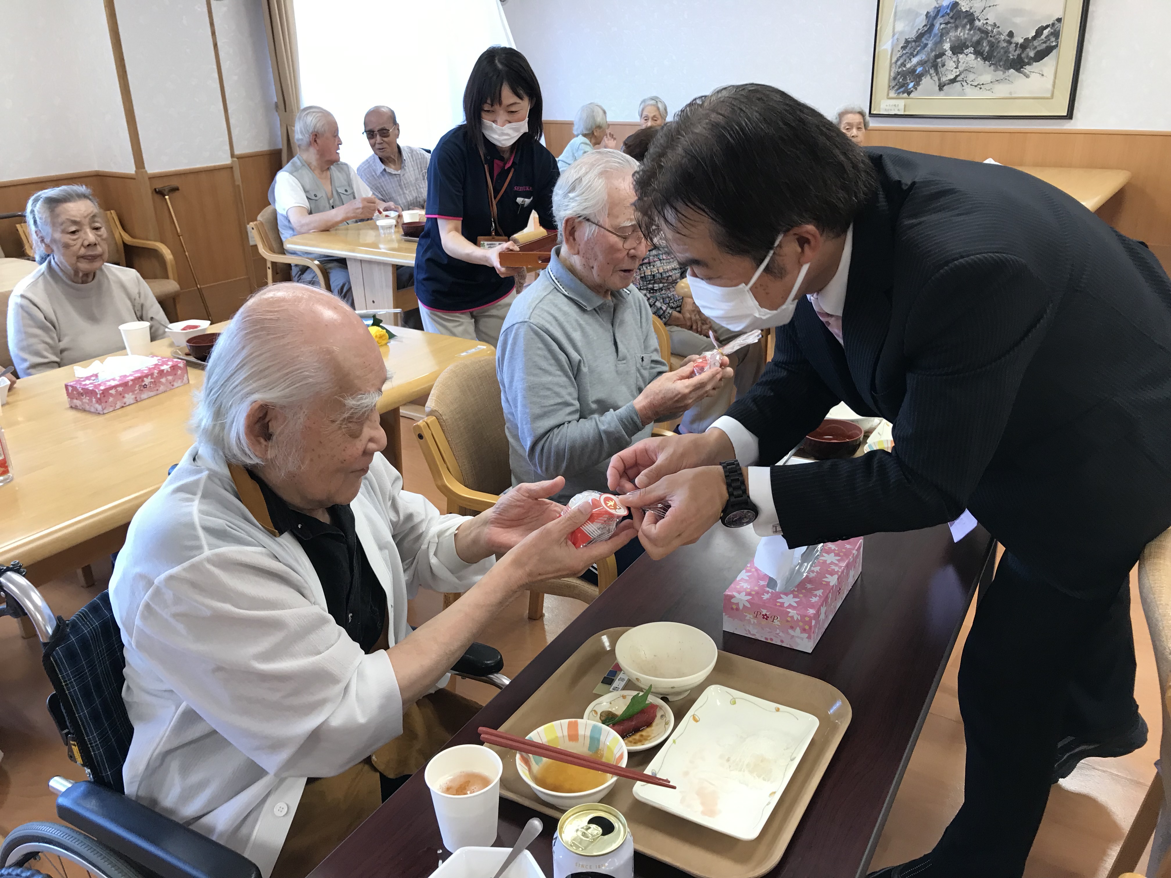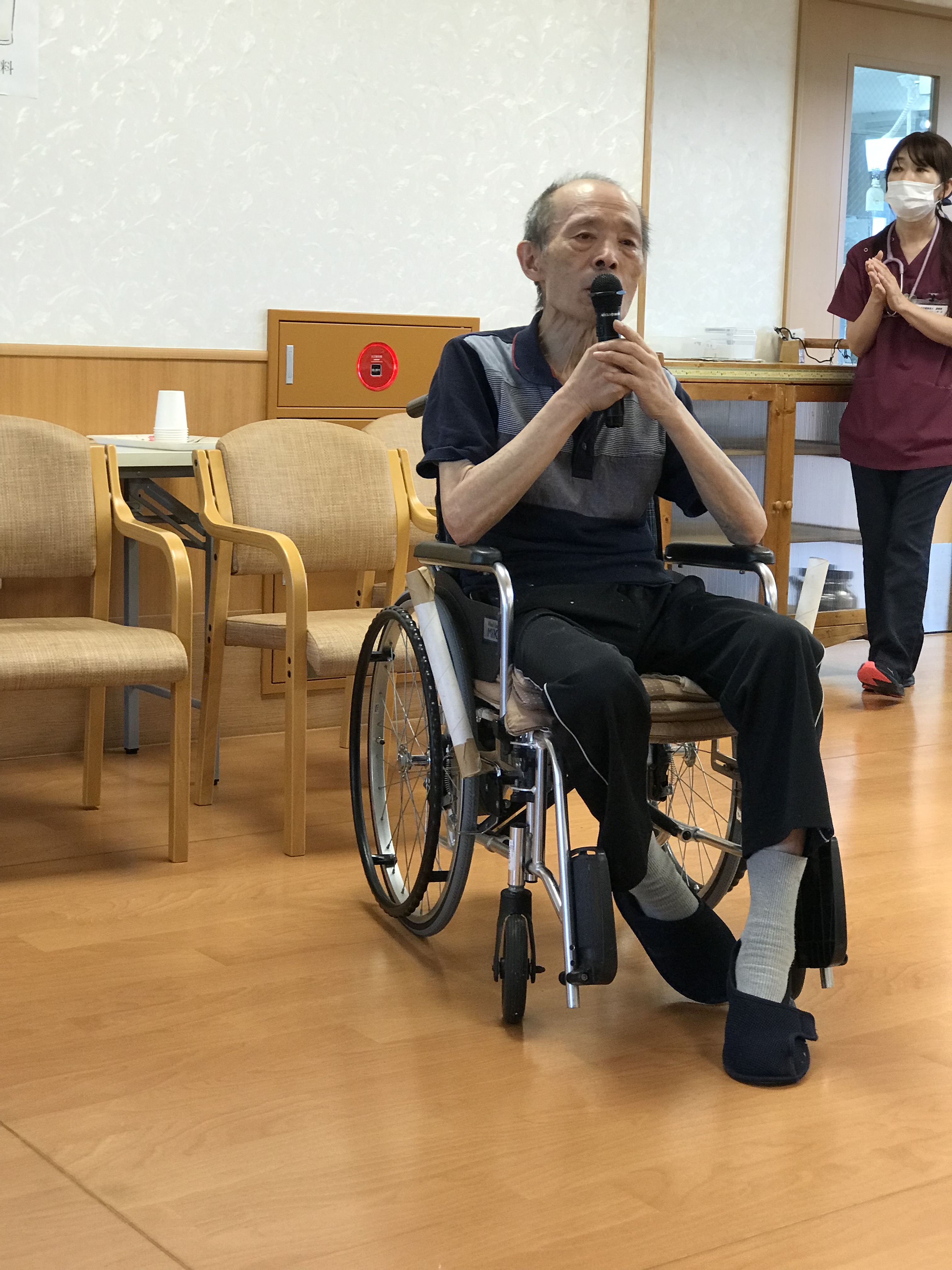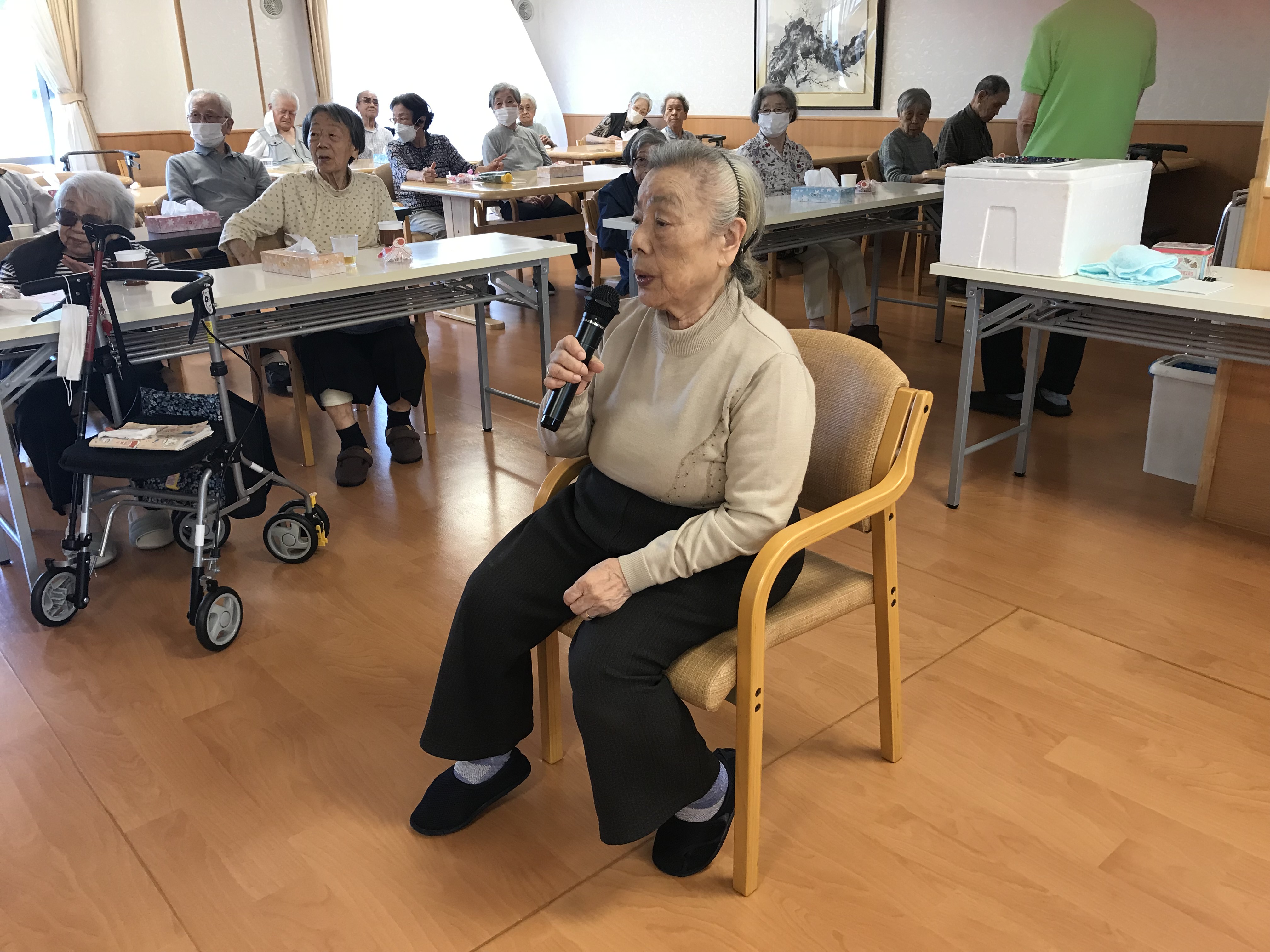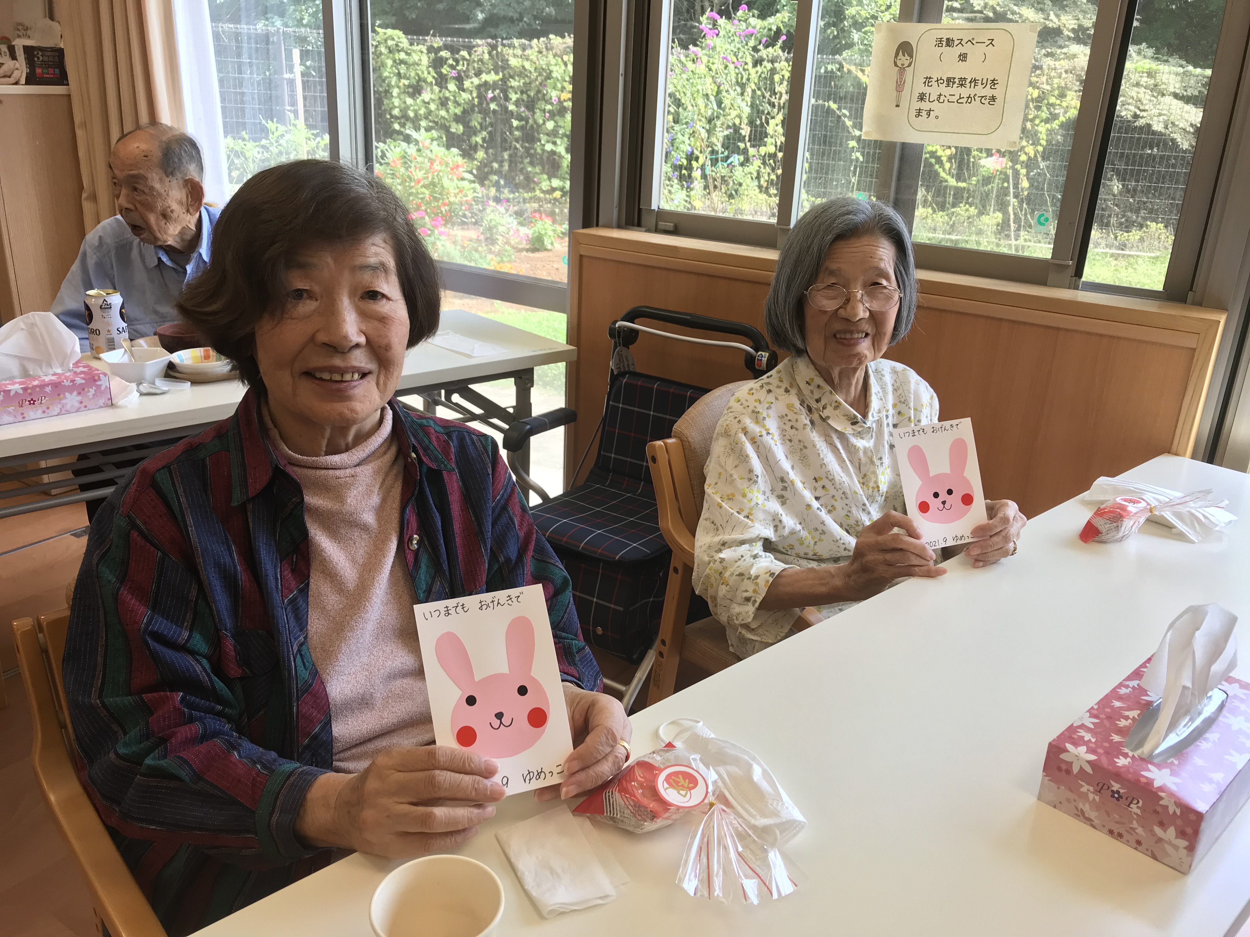 令和3年9月15日 小町山グリーンホームでは、敬老会が開催されました。 カードは、託児所(ゆめっこ)のお子様たちと先生が一生懸命作ってくれました。 お酒も飲みながら楽しい時間を過ごしました。 食後あとは、カラオケ大会です。 これからも小町山グリーンホームで楽しくお過ごしください。