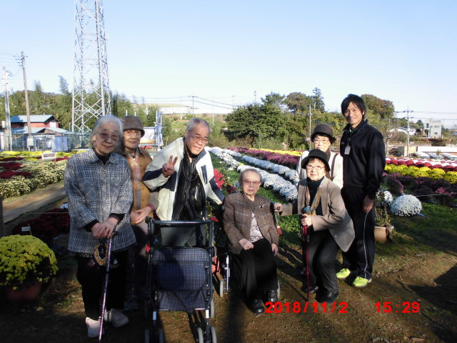 11月1日~2日の2日間にかけて17名の入居者様と共に、飯山ざる菊の見学に 行ってまいりました。 5千本のざる菊が満開で、入居者の方は散策をしながら喜ばれておりました。 健康に気を付け、また来年も行きたいというお言葉もいただいております。