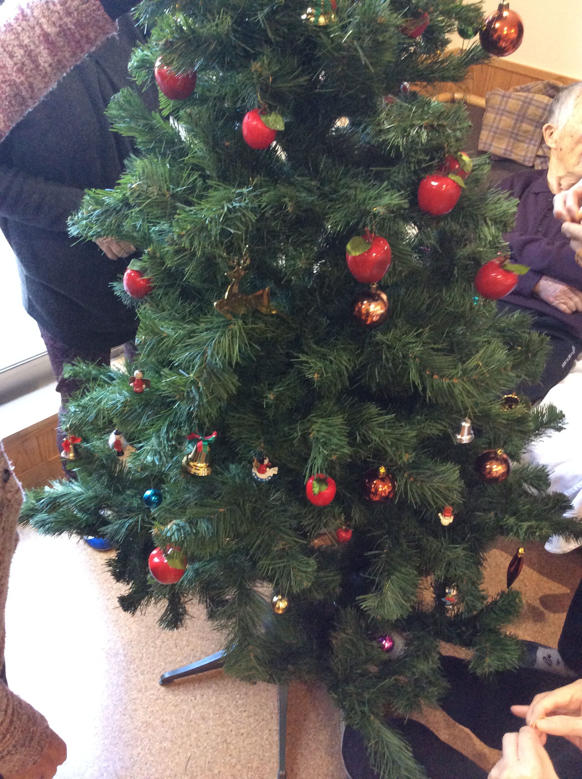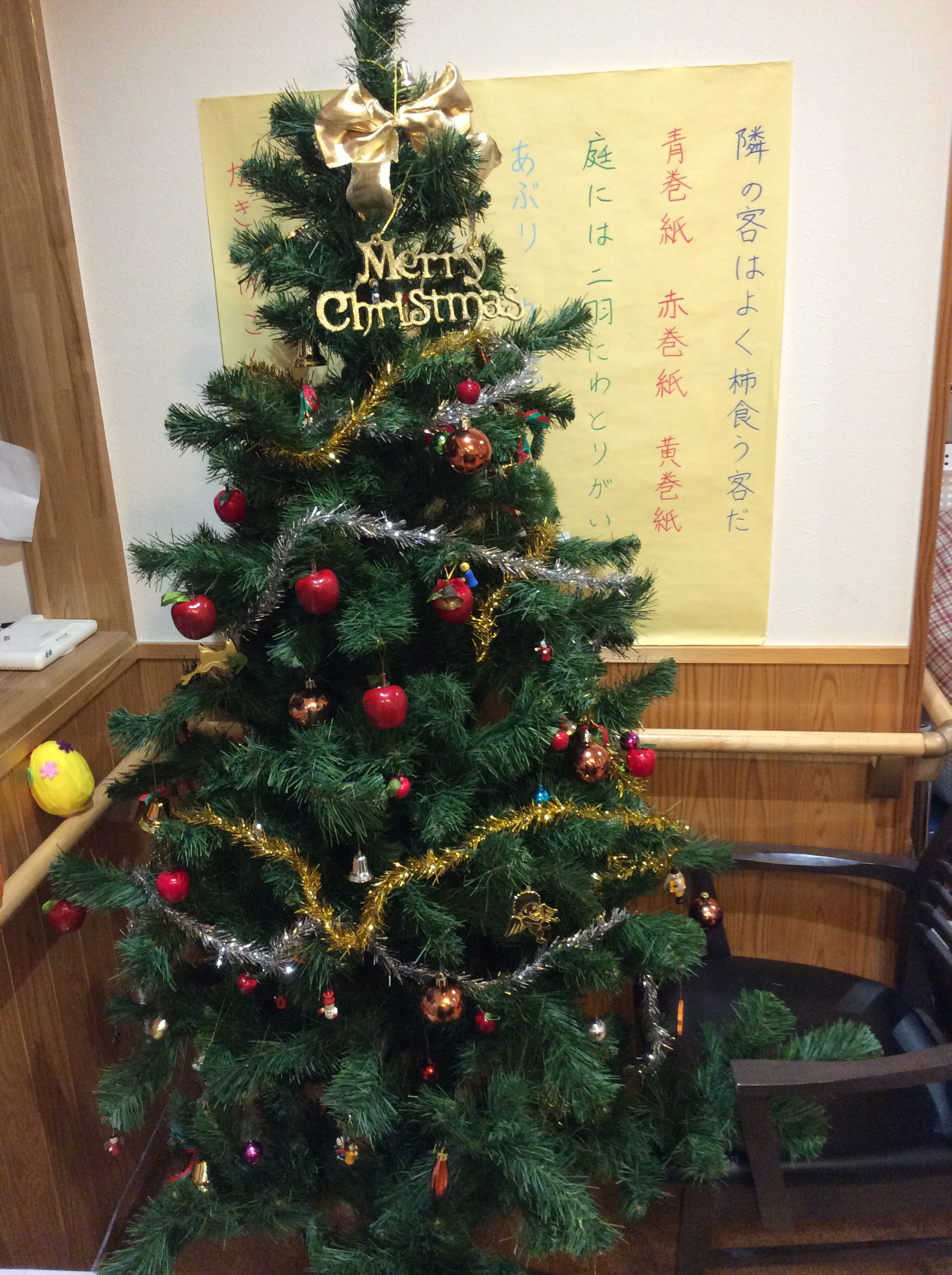 12月2日 金曜日 今日はとてもいいお天気♪ しかし最近は、外は空気が冷たくて、めっきり寒くなりましたねぇ。 今日は寒がりな職員と、寒がりなご利用者様でクリスマスツリーの飾り付けをしました。 小さな天使の飾りや大きなりんごの飾りを、順番に付けていただきました。 意外と大きなツリーなので、飾りもいっぱい! 1時間くらいかかって出来上がったツリー☆ 今年も楽しいクリスマスを迎えられますように💛
