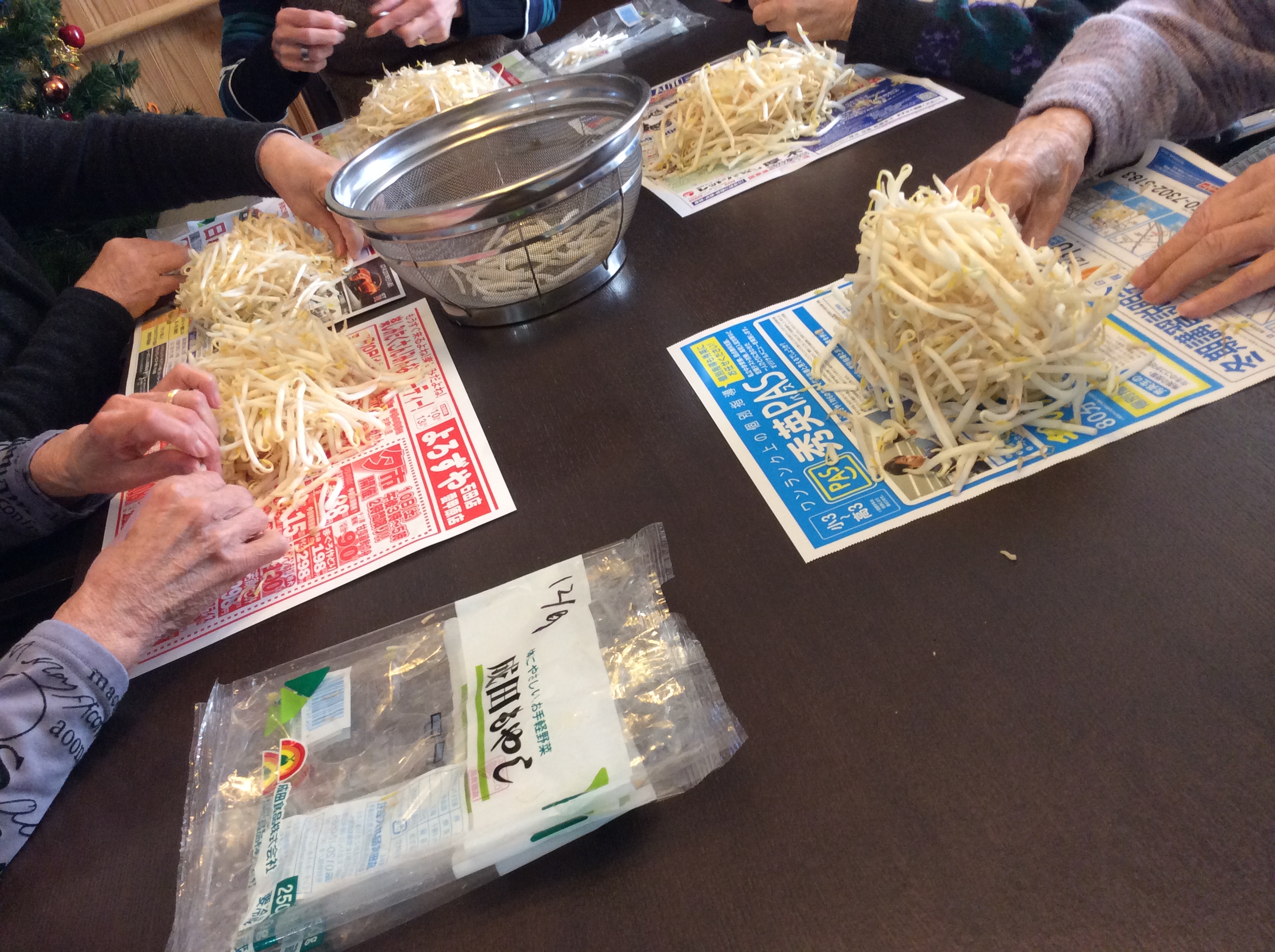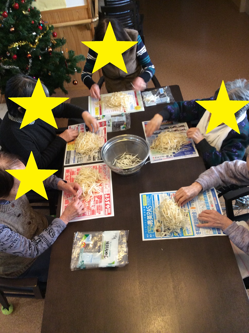 12月11日 日曜日 ガラスから差し込む光がとても暖かくて 気持ちよさそうにみなさんウトウトしちゃう今日この頃な愛甲です。 日曜は爪切ったり、ひげそったりまったり過ごします。 ・・・・って、のんびりしてるとさぁ大変! 今日の夕飯のメニューのおかずに「もやしと人参のつゆ和え」というのがあるんですが、さすが18人分にもなりますと、もやし5袋、約1250gも使うんです。 せっせ、せっせともやしのひげを取って頂きます。 手先を使う事で生活リハビリになります。 手にも脳にもいい運動ですね♪