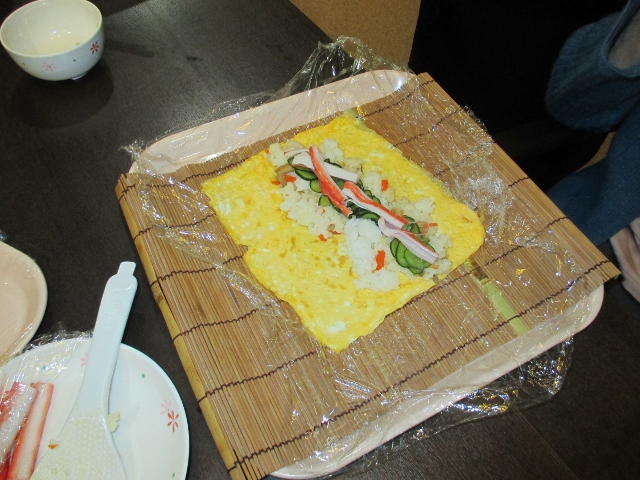 愛甲の恵方巻はご飯は五目御飯で、中身はカニカマと塩もみきゅうりです。
