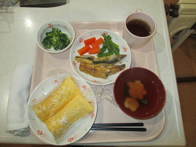 おかずはいわしの蒲焼と付け合せに人参、ししとう、和え物は菜の花のマヨネーズ和えです。