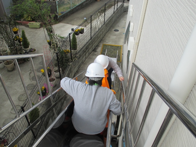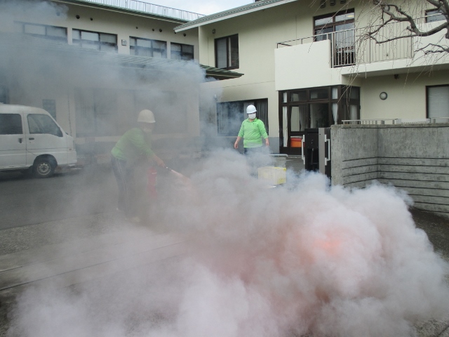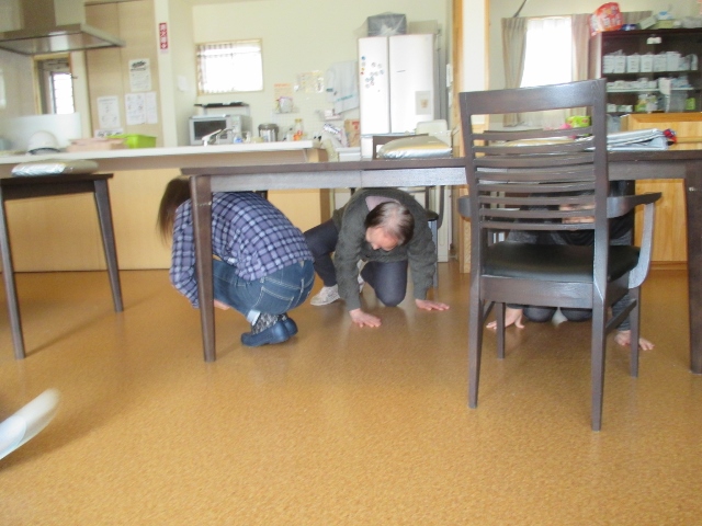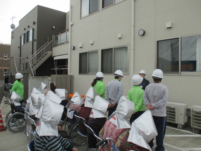 3月24日(金曜日) 今日は愛甲の防災訓練の日です! 選ばれた職員は玉川にて消火器訓練です。 風向きが自分に向かってくると「ゴホゴホッ」 実際の火事はもっとすごい煙のはずっ! これも訓練!がんばれ~! まず、地震の時は物が落ちてくる事を想定して お決まりのテーブルの下へ隠れよう!! 2階の方は台所の裏にある滑り台から避難します。 職員がご利用者を毛布で包み抱えてすべり降ります。 全員整列!! 点呼を行い無事を確認します!!