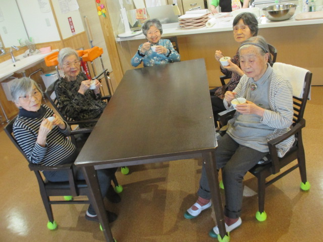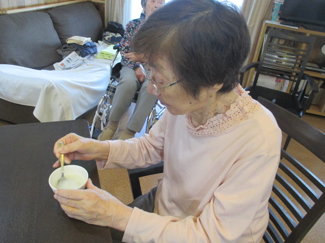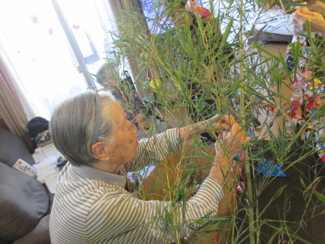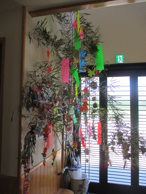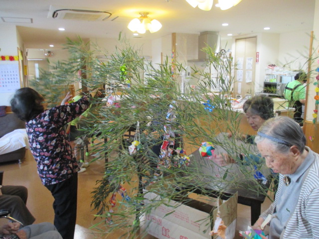 今日は七夕に向け飾りつけ。 この日のために作っておいた数々のお飾りと、今年のお願い事を書いた短冊を みなさんと飾りつけしました。 玄関に立派な七夕飾りを設置することができました。 みなさん汗だくになりながら飾り付けを行ってくれたので、 今日のおやつは急遽かき氷にしました。 ひんやりと、美味しく涼をとることができました。