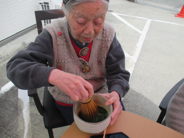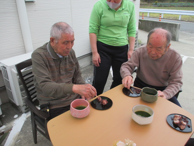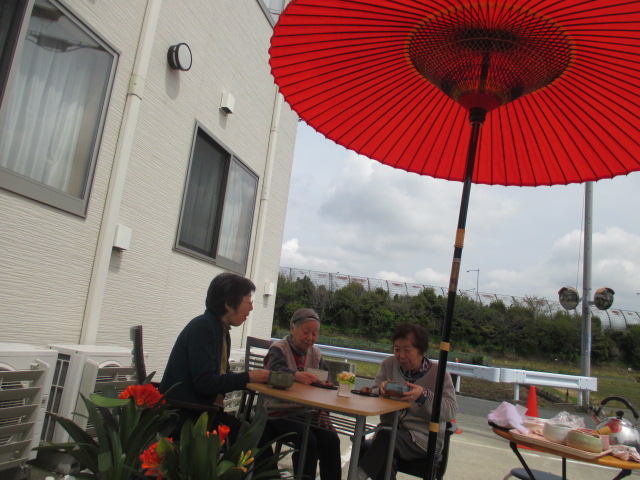 愛甲グリーンホーム横スペースに 野点傘をセッティング。 『春のお茶会』を開催しました。 主菓子には、手作りのお団子をご用意させていただき、 みなさんとお抹茶を嗜みました。 外で春の暖かさを感じ、 みなさん一服されながらおしゃべりを楽しんでいました。