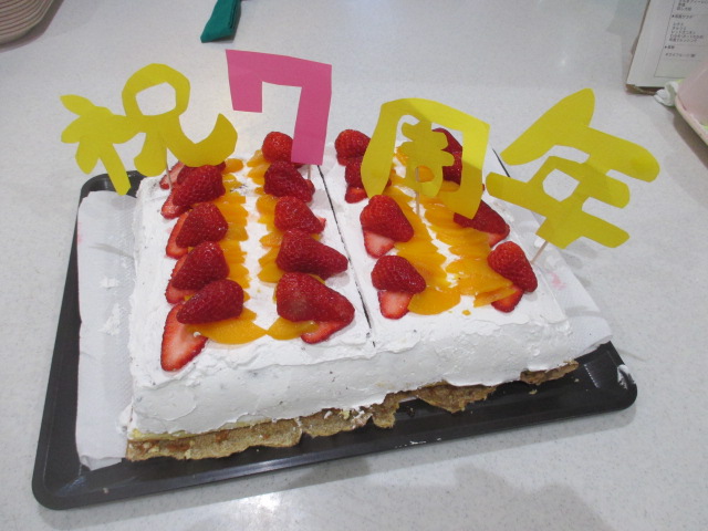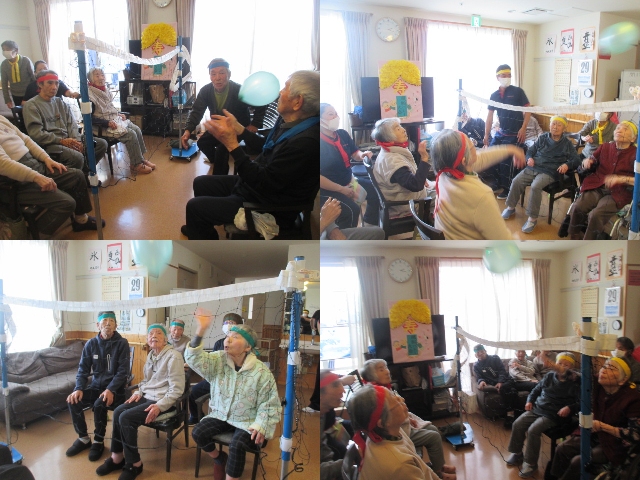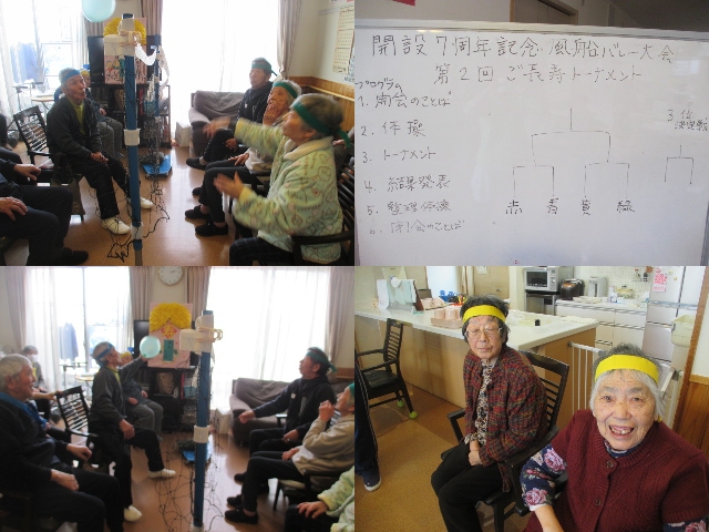 愛甲グリーンホームは、3月1日で開設7周年となりました。 皆さまのご支援に感謝いたします。 そこで開設記念と題しまして、 風船バレー大会 ご長寿トーナメントを開催いたしました。 皆さん頭にハチマキをしめて、元気に参加されました。 皆さん、よく腕も上がり、大きな声が出ています! ラリーが続いて、とても白熱な試合でした。 良い運動をしたあとは、職員の手作りケーキを食べました。 楽しいイベントとなりました♪