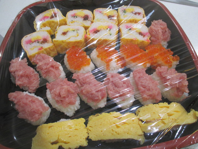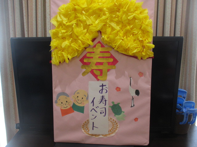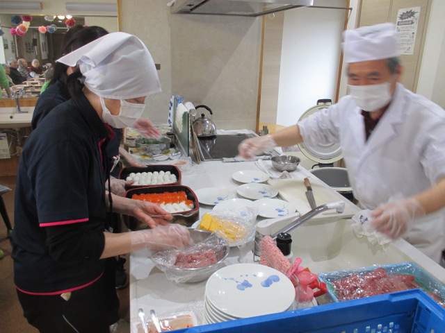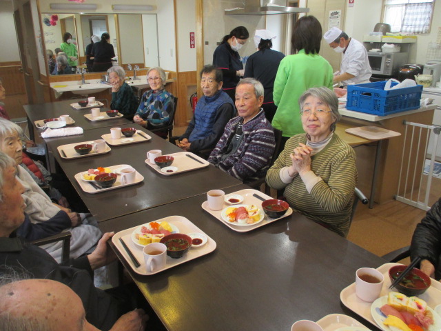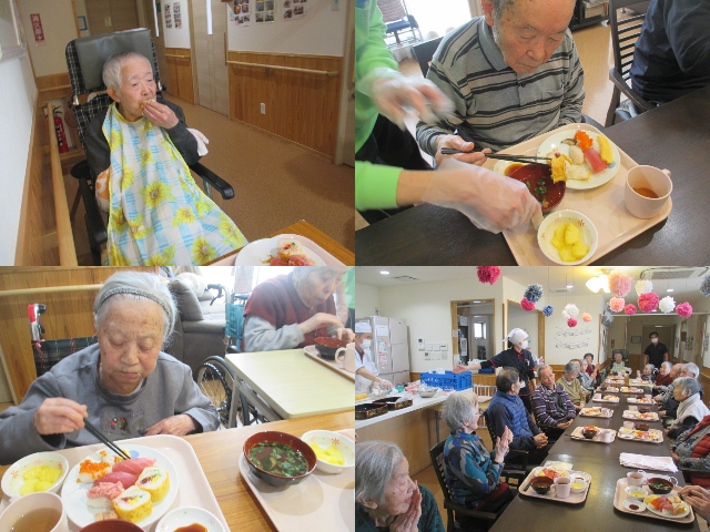 3月12日(金)、 玉川グリーンホーム栄養課の職員さんが来所され、 お寿司イベントが開催されました。 毎年楽しみにしているイベントの一つです。 美味しそうですね! みなさんも笑顔です♪ みなさん、沢山召し上がられていました♪
