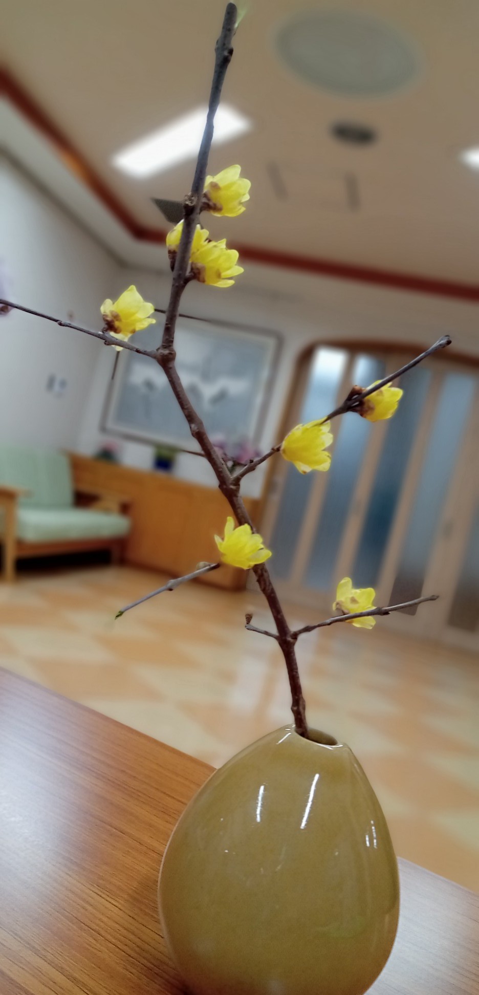 玉川グリーンホームです。 立春を前に、施設の蝋梅が見頃を迎え良い香りが漂っています! 梅は切らぬ馬鹿とも言われますし(梅は古い枝を切った方がそこから新しい枝が生えるので)、一輪挿しに入れ皆さんにも楽しんで頂いています。 まだ暫くは楽しめそうです!! まだまだ寒さも厳しいものがありますが、近づく春の便りを待ちわびながら楽しく過ごして行きたいです!!