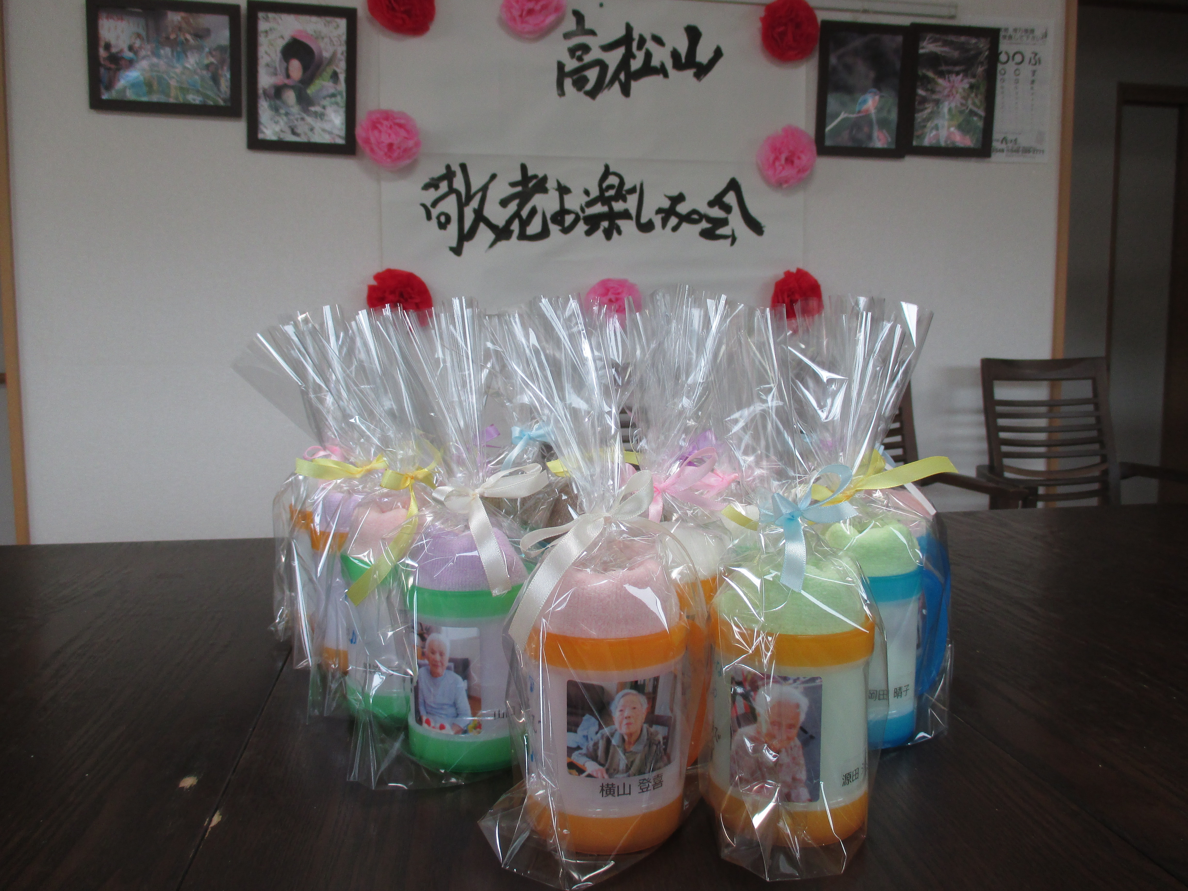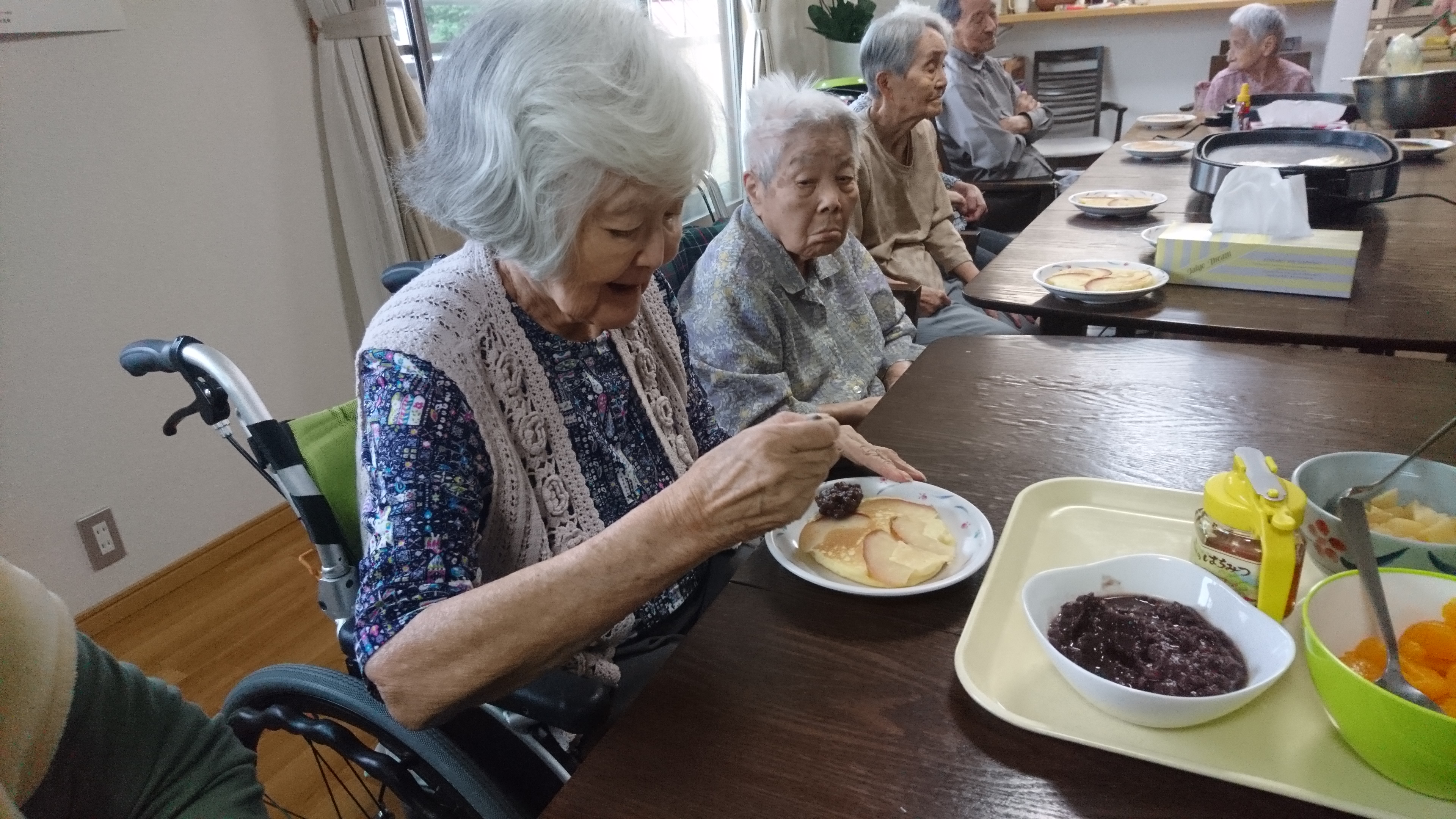 高松山グリーンホームでは9月17日(日)に『敬老お楽しみ会』と 題して「ホットケーキづくり」を行いました。 出来上がったホットケーキに好きなものをトッピングして皆様、美味しくいただきました。 普段はあまり召し上がらない方も「もう一枚」と喜んでいらっしゃいました。 そして、職員からのメッセージ入り『マグカップ』をプレゼントさせていただきました。 皆様、いつまでもお元気でお過ごしください。