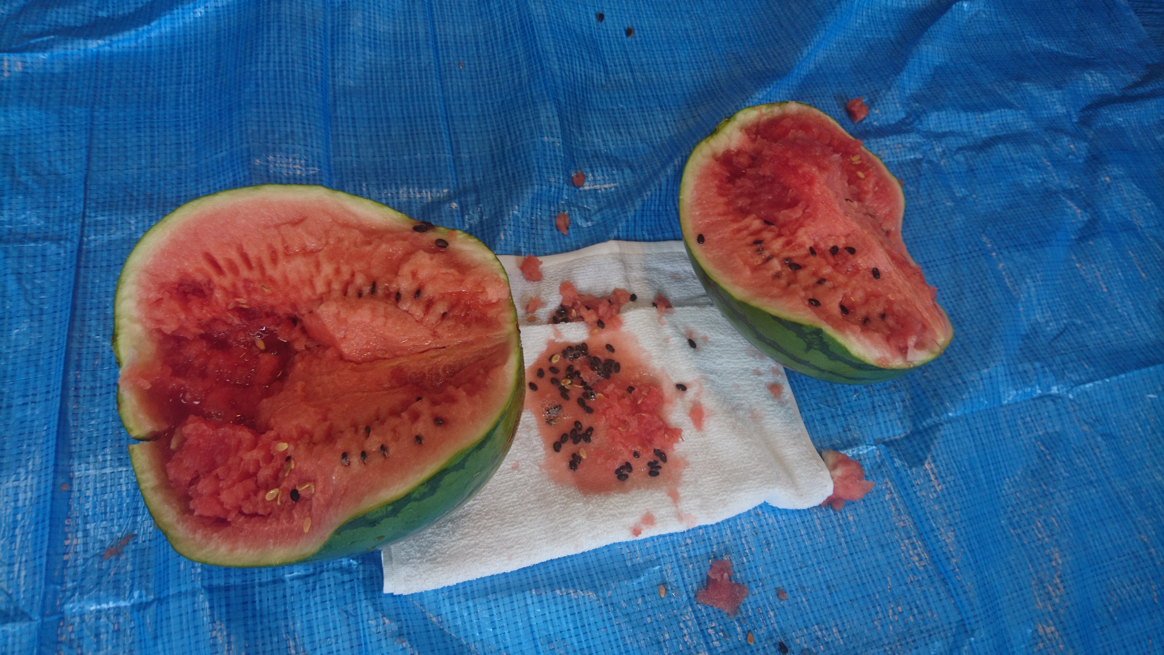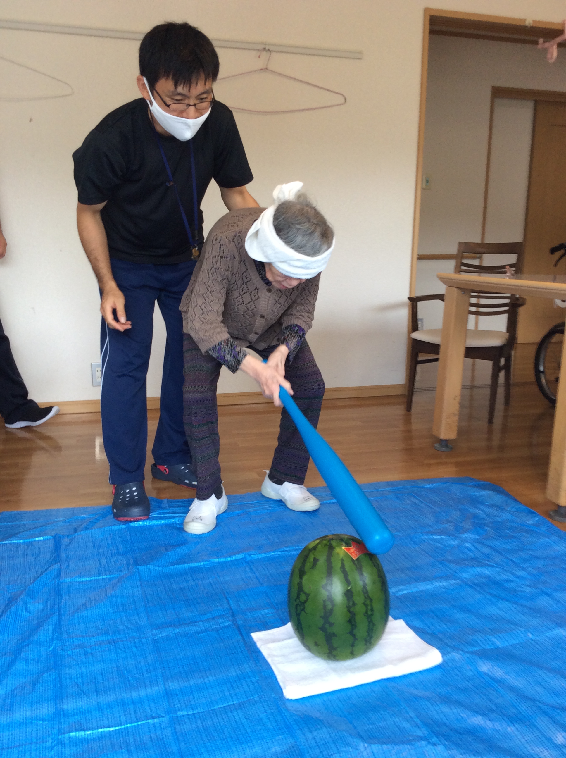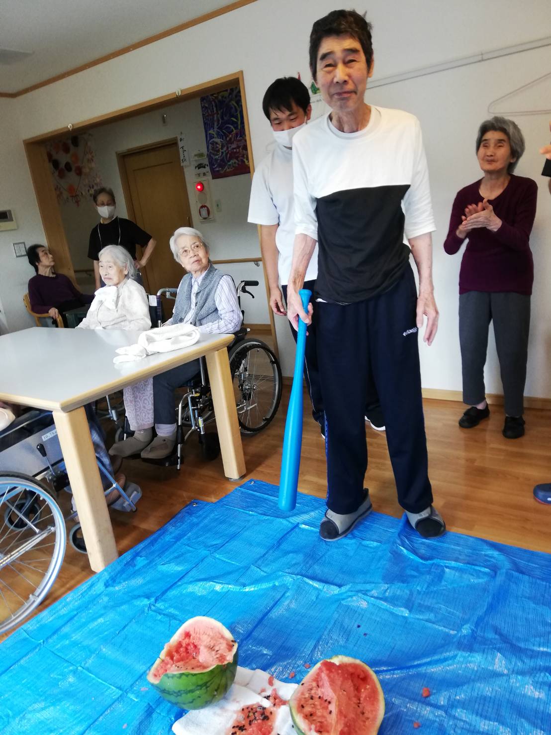 最後にスイカ割りを行い、見事に割れたスイカをおやつで召し上がっていただきました。
