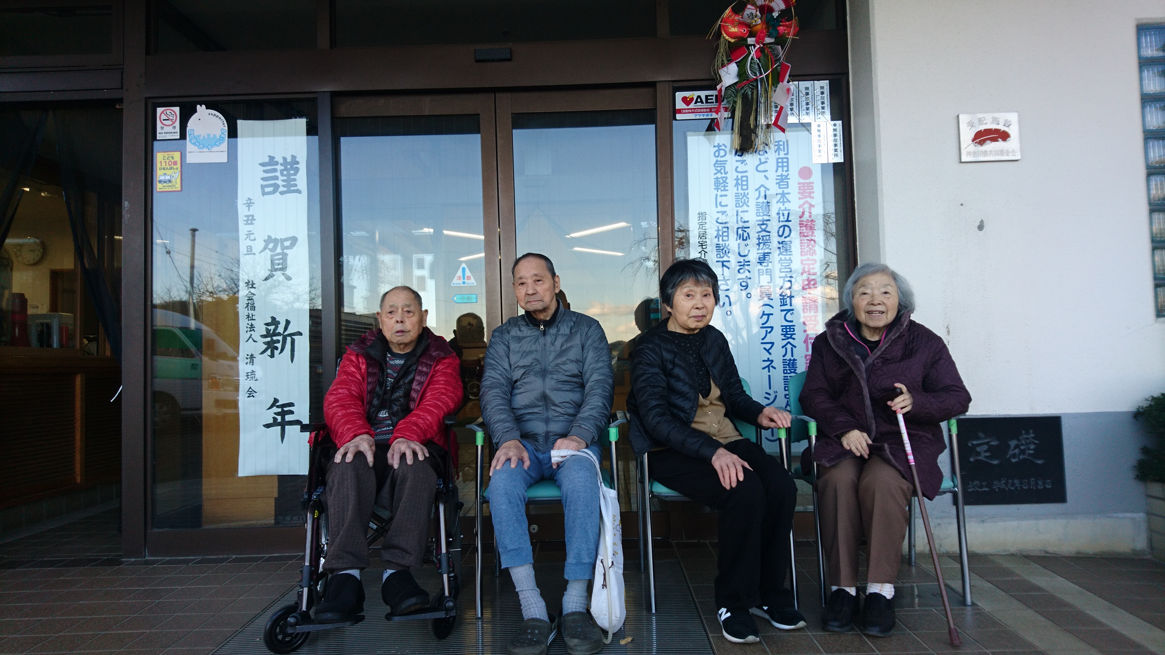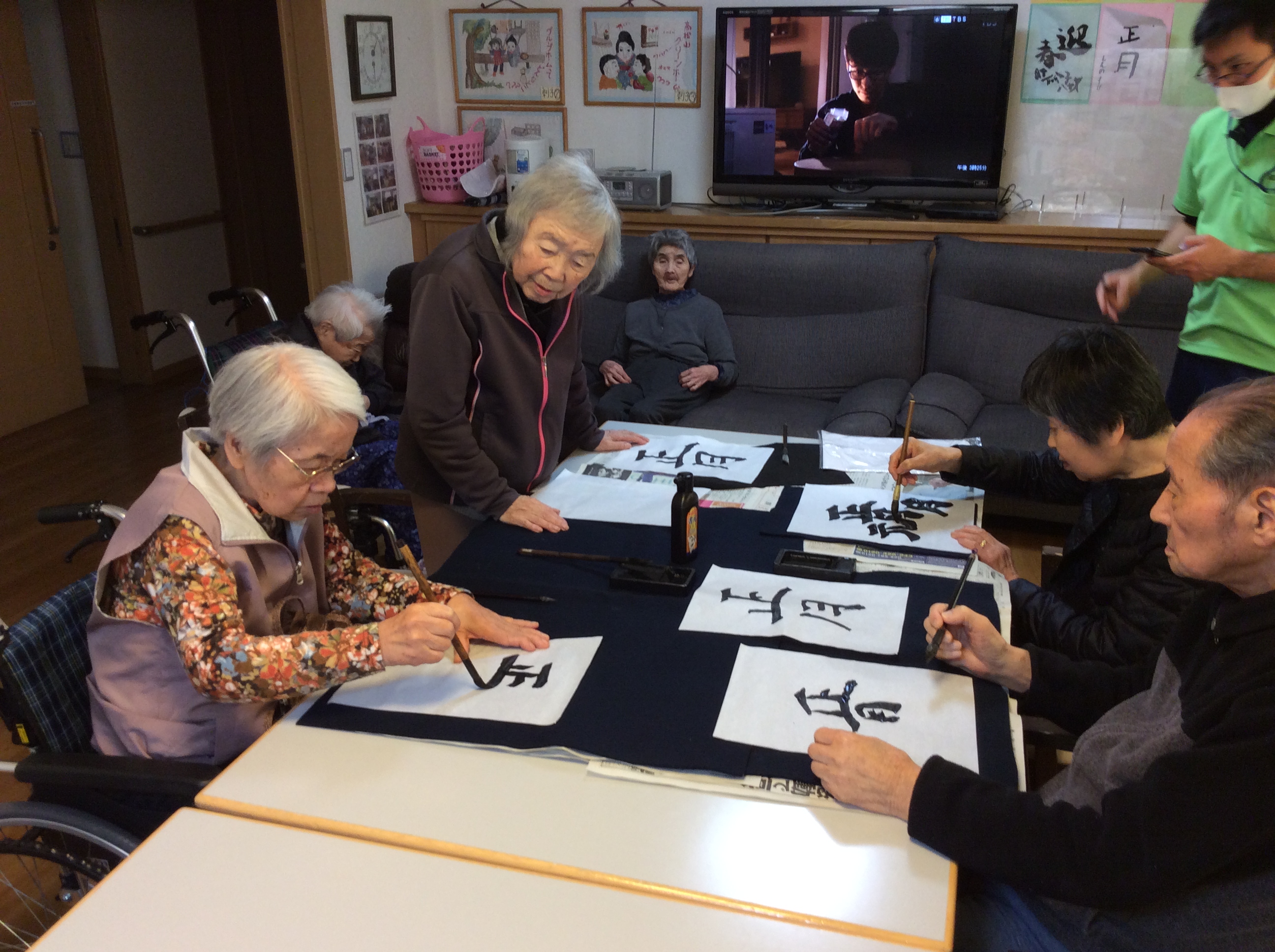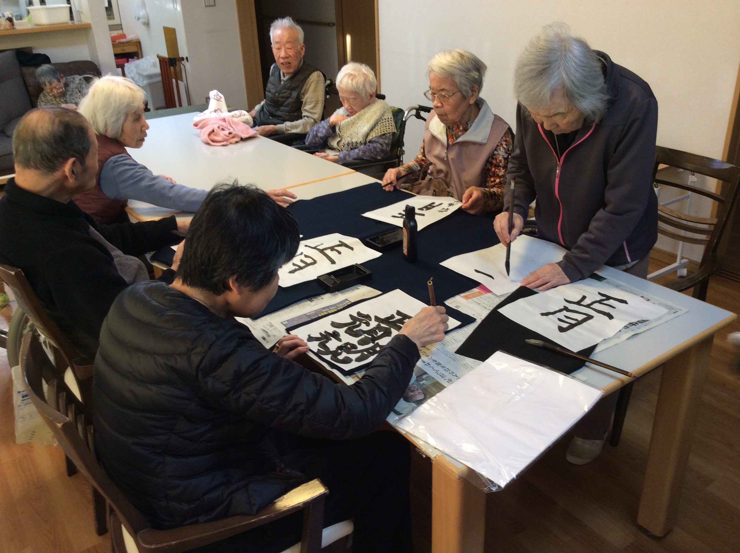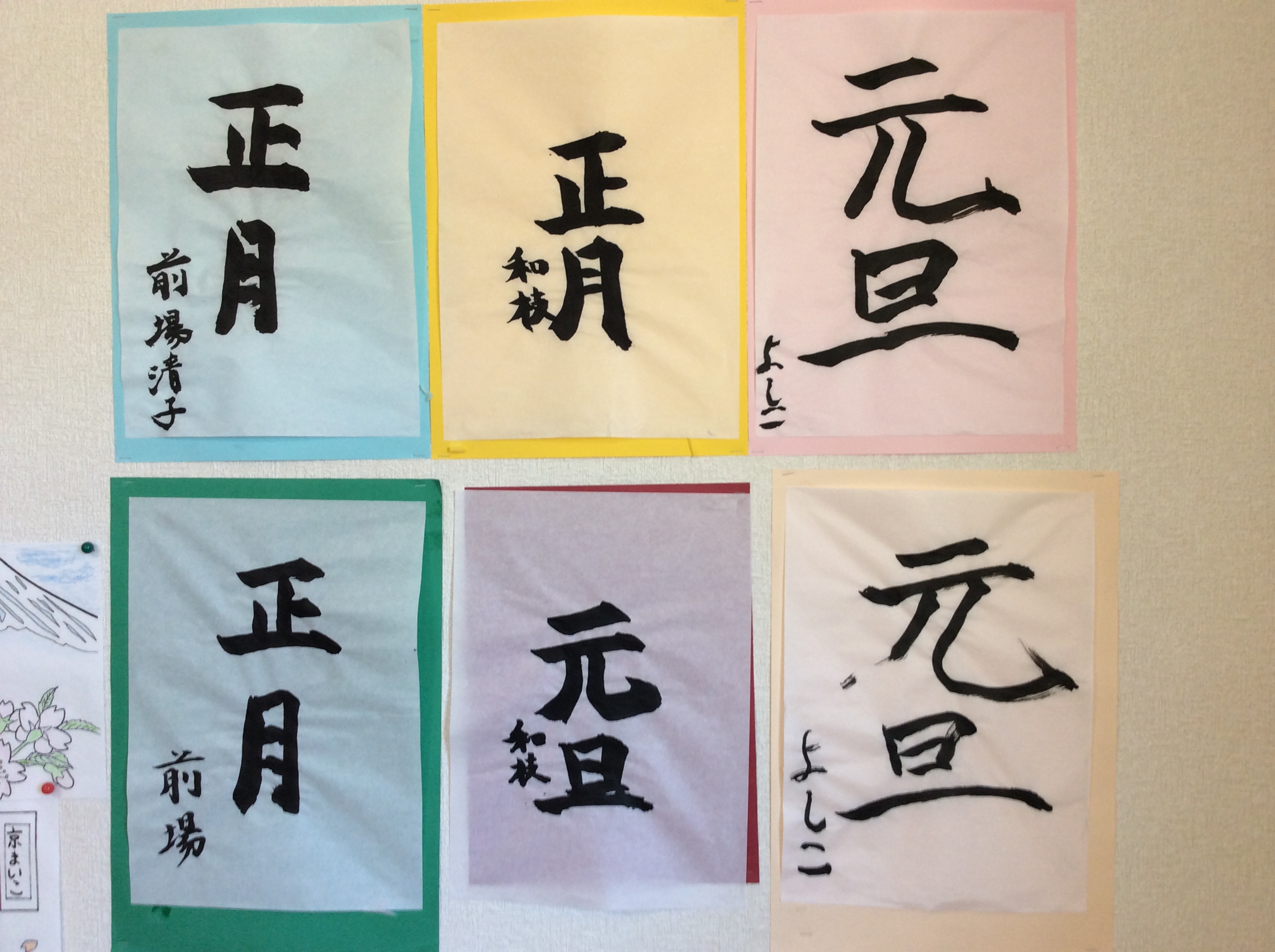 新年明けましておめでとうございます。 1月1日は、数日前から準備を行い、とても豪華な「祝い膳」が 出来上がりました。普段の食事に比べるとボリューム満点で 食べ残してもおかしくない量ですが、皆様、ほとんど残さずに 召し上がって頂きました。 そして午後からは書初めを行いました。 「久しぶりに書いたので上手く書けない」と言う方もいらっしゃいました。 1月2日は、小野神社へ初詣に出掛け、その後、玉川グリーンホームへ 新年のご挨拶に行ってきました。 本年もどうぞよろしくお願い致します。