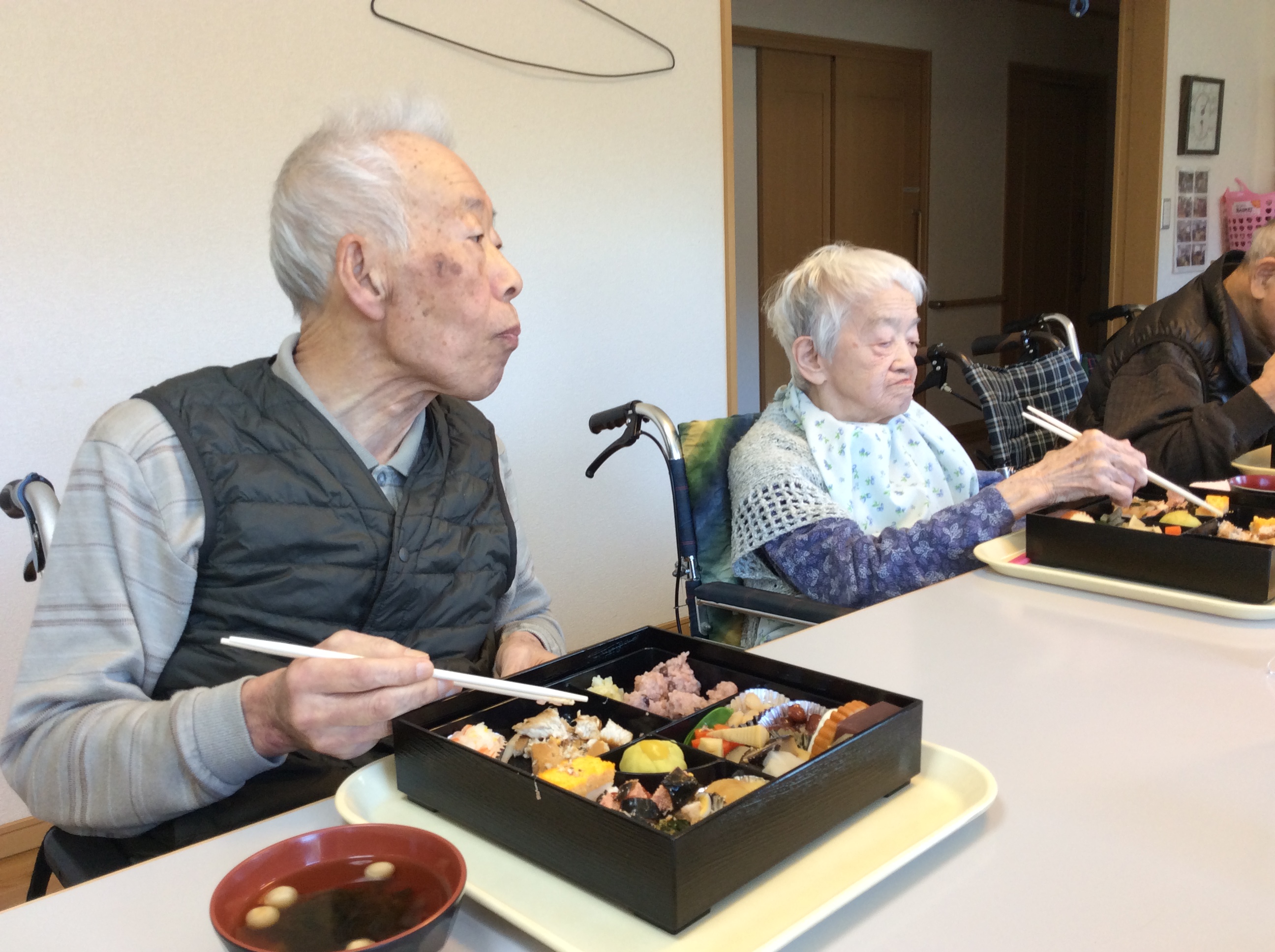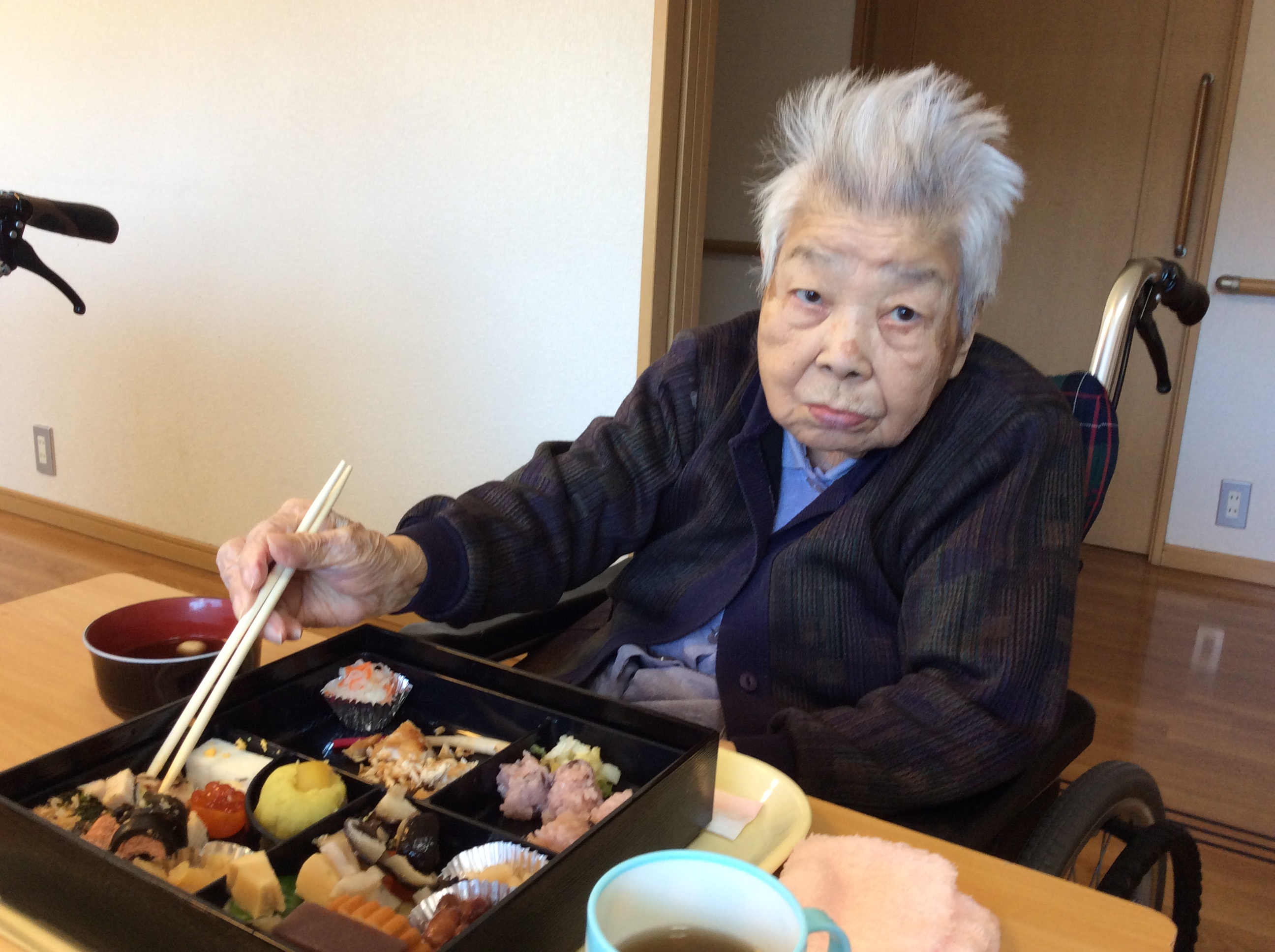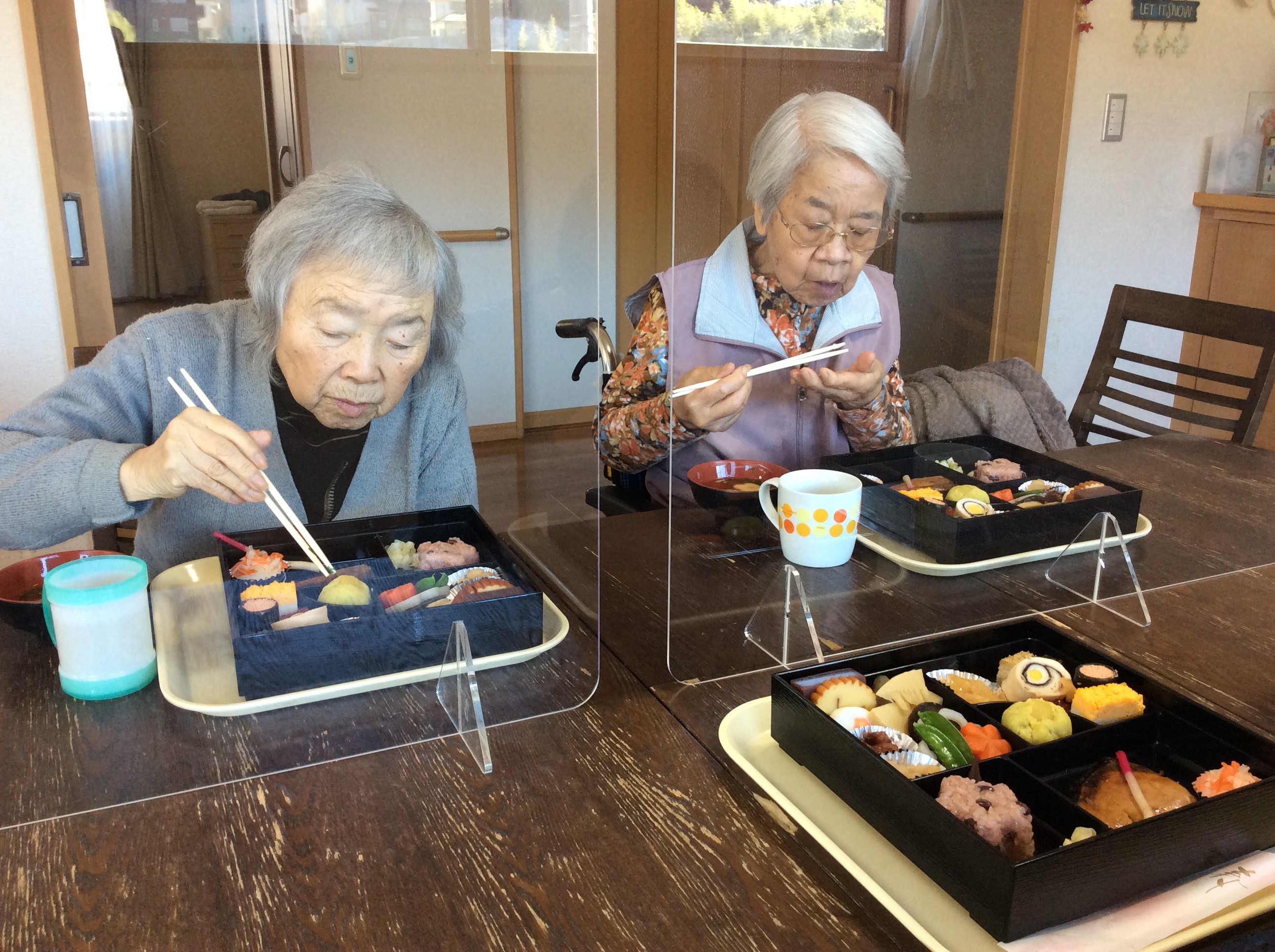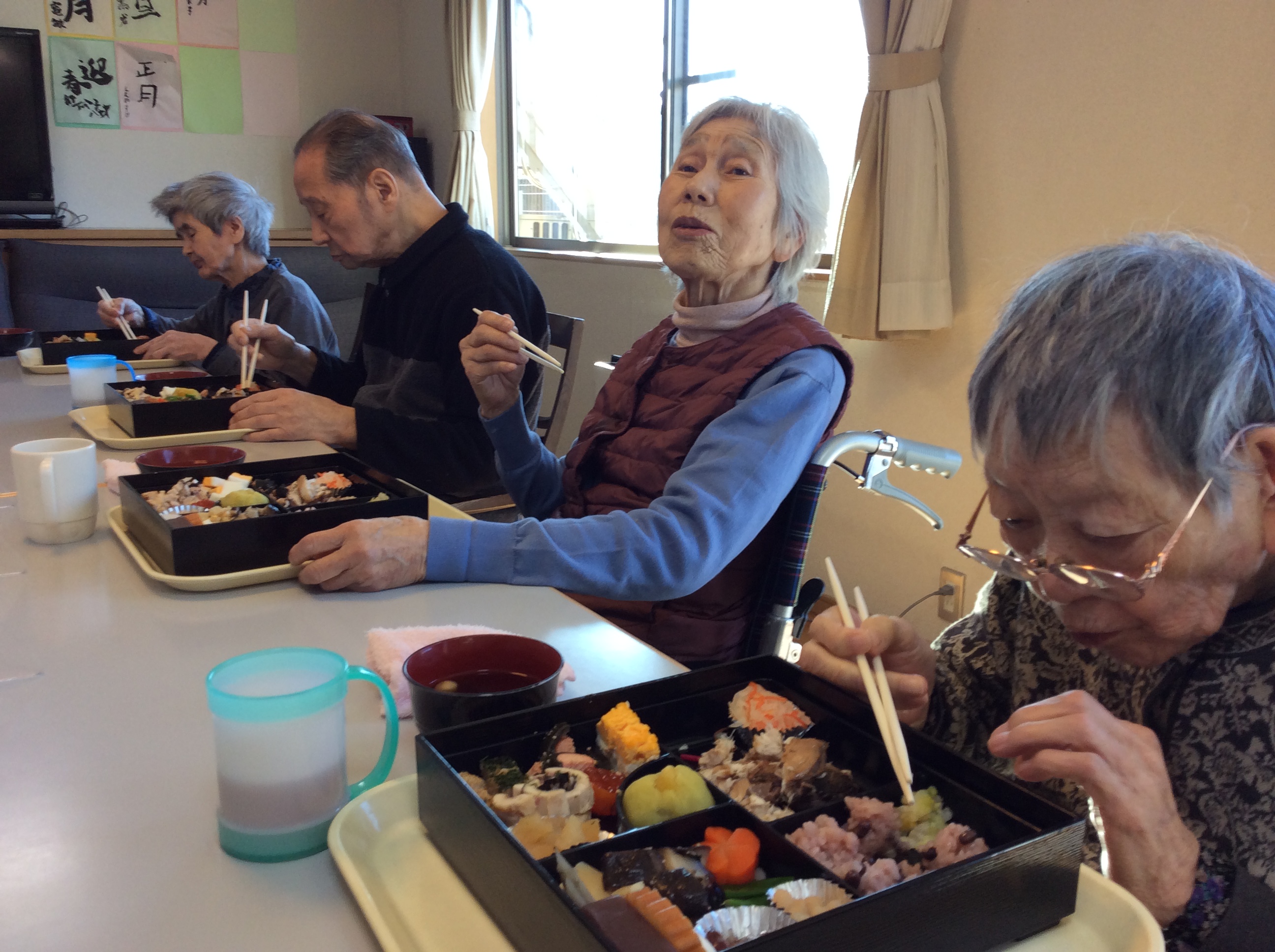 新年明けましておめでとうございます。 1月1日は、数日前から準備を行い、とても豪華な「祝い膳」が 出来上がりました。普段の食事に比べるとボリューム満点で 食べ残してもおかしくない量ですが、皆様、ほとんど残さずに 召し上がって頂きました。 そして午後からは書初めを行いました。 「久しぶりに書いたので上手く書けない」と言う方もいらっしゃいました。 1月2日は、小野神社へ初詣に出掛け、その後、玉川グリーンホームへ 新年のご挨拶に行ってきました。 本年もどうぞよろしくお願い致します。