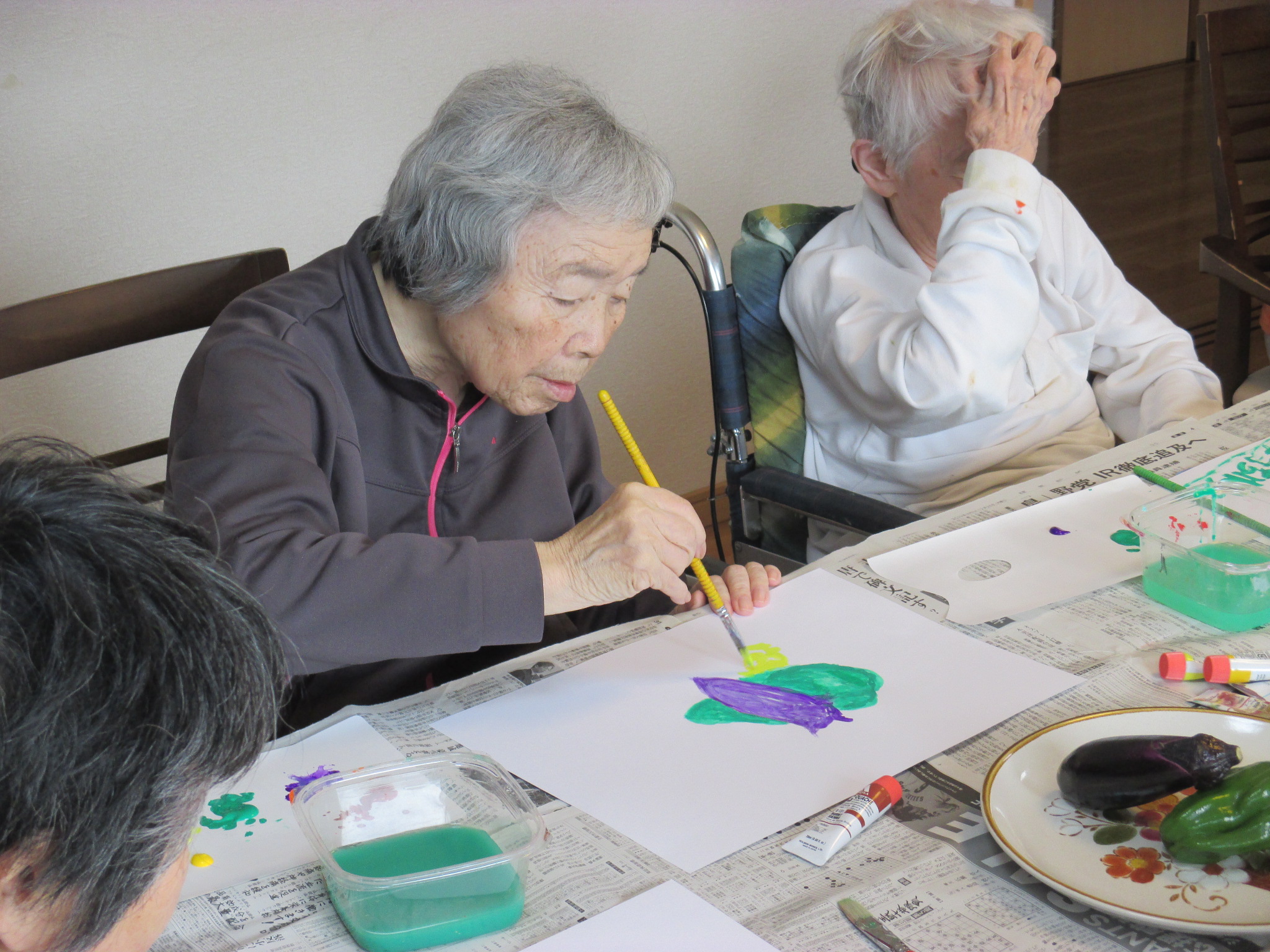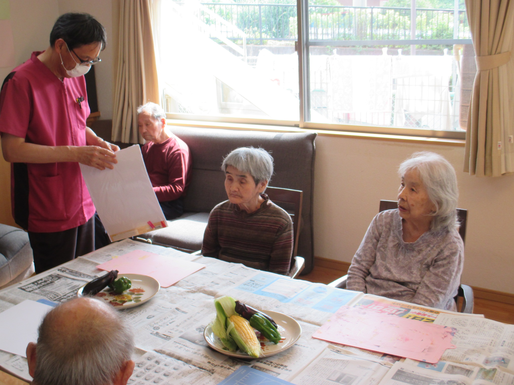 月に1度行われていました、落合医院の片山先生指導による臨床絵画ですが、 新型コロナウイルス感染症の影響で、2月以降、活動を自粛していましたが この度、約4ヶ月ぶりに再開をいたしました。 今回は、『夏野菜を描く』ということで、トウモロコシ、ナス、ピーマンを題材に アクリル絵の具を使って自由に描いていただきました。 それぞれ個性のある素晴らしい作品が出来上がりました。