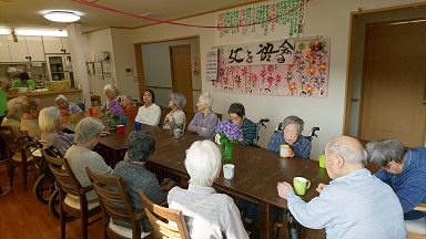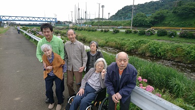 梅雨の真っ只中ではありますが、高松山の皆様は元気に暮らしております。 6月7日(木)は、地域のミニデイサービスに参加して来ました。この日は地域包括支援センターの職員さんによる介護予防クイズやコグニサイズが行われ、頭と身体の体操をしてきました。 6月17日(日)は、午前中に飯山あやめの里、玉川河川敷のあじさいを観て、その帰りに買い物をして来ました。 午後からは「父を語る会」を行い、お父さんの思い出話を聞きながらビールやジュースで乾杯し、手作りのおやつを召し上がっていただきました。