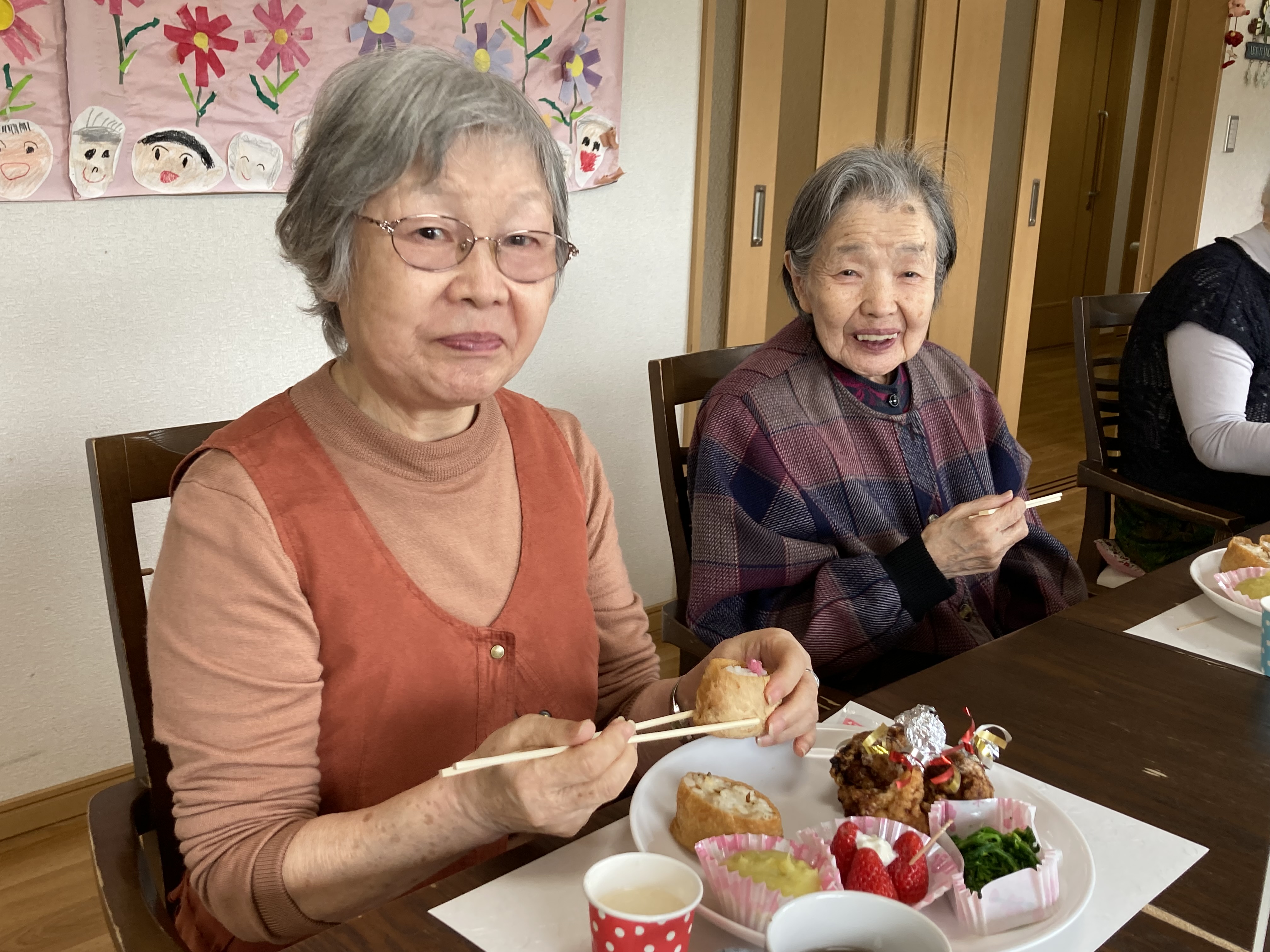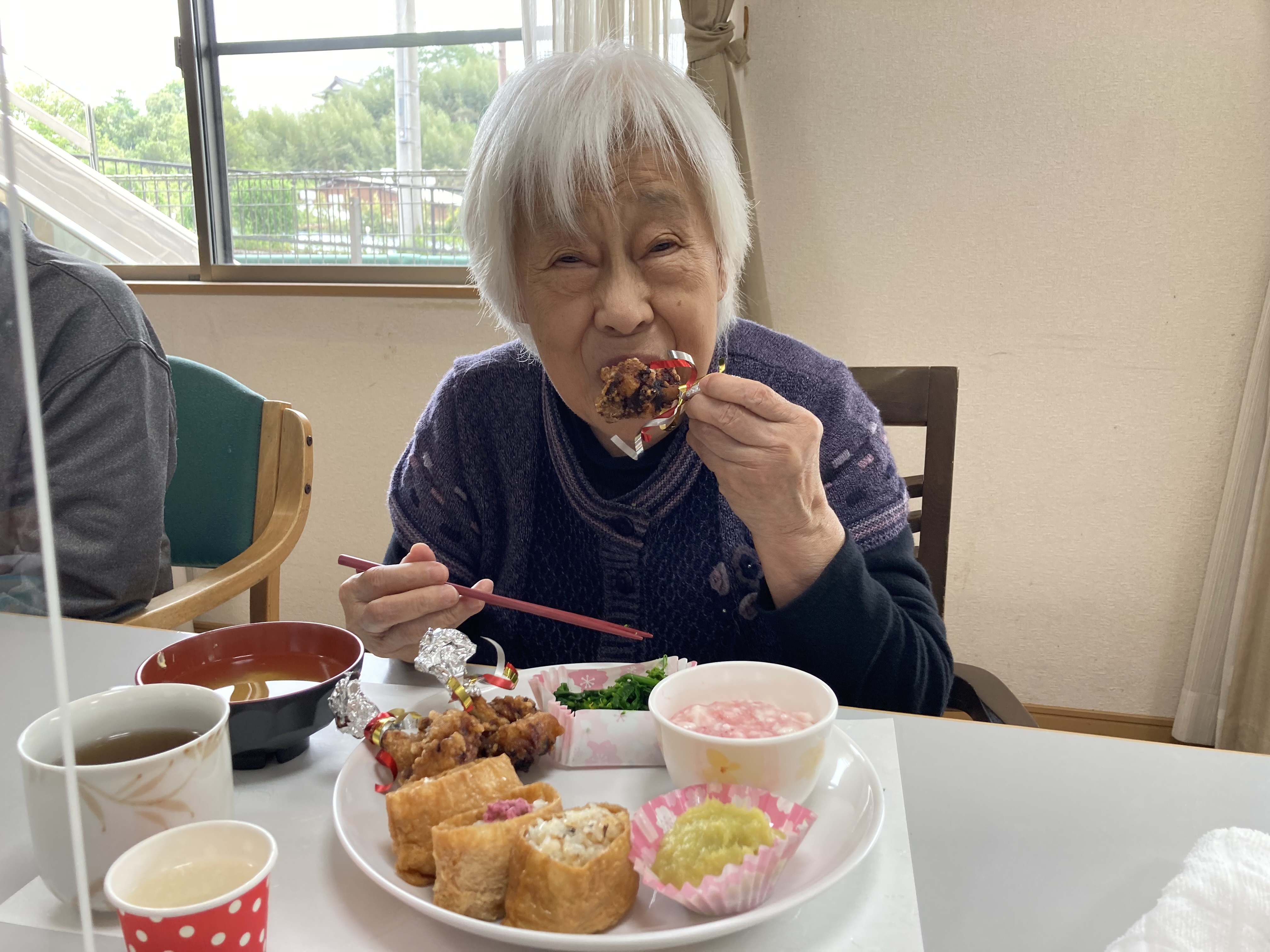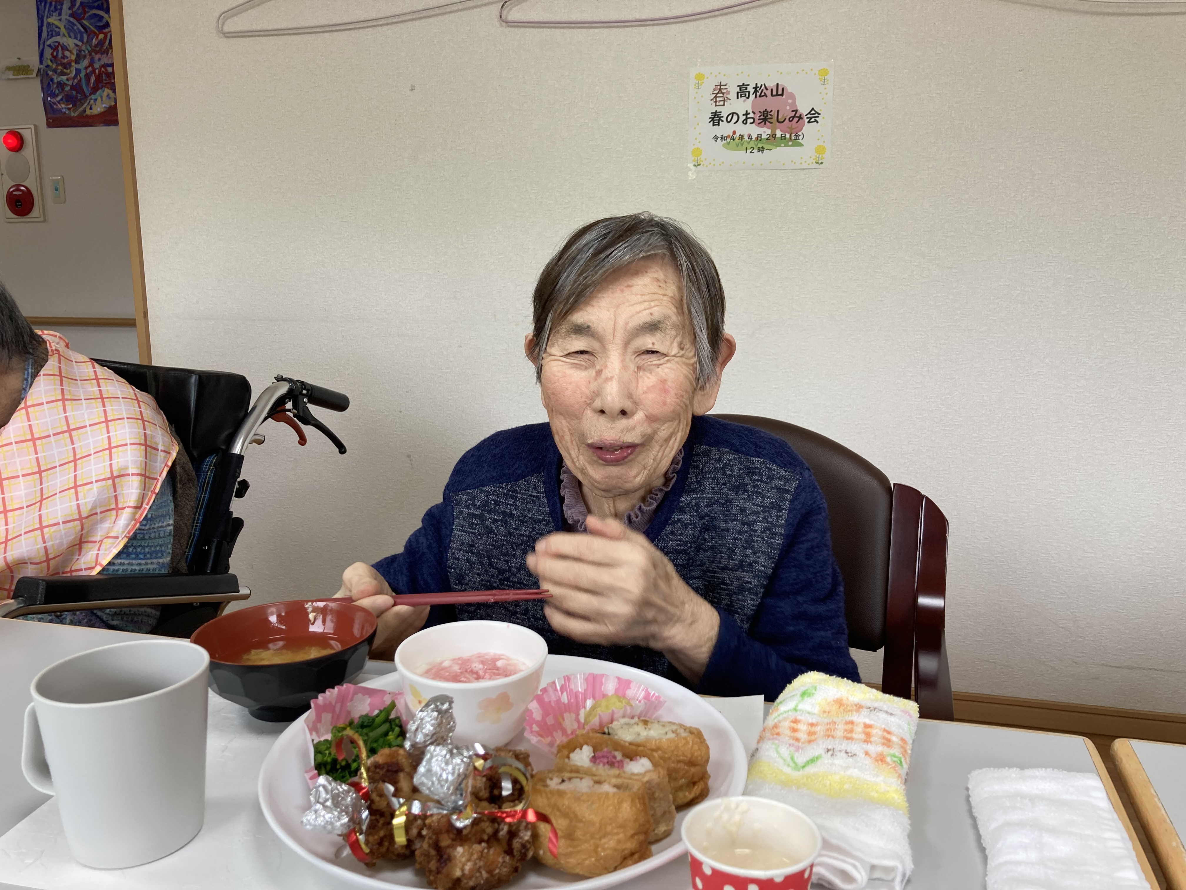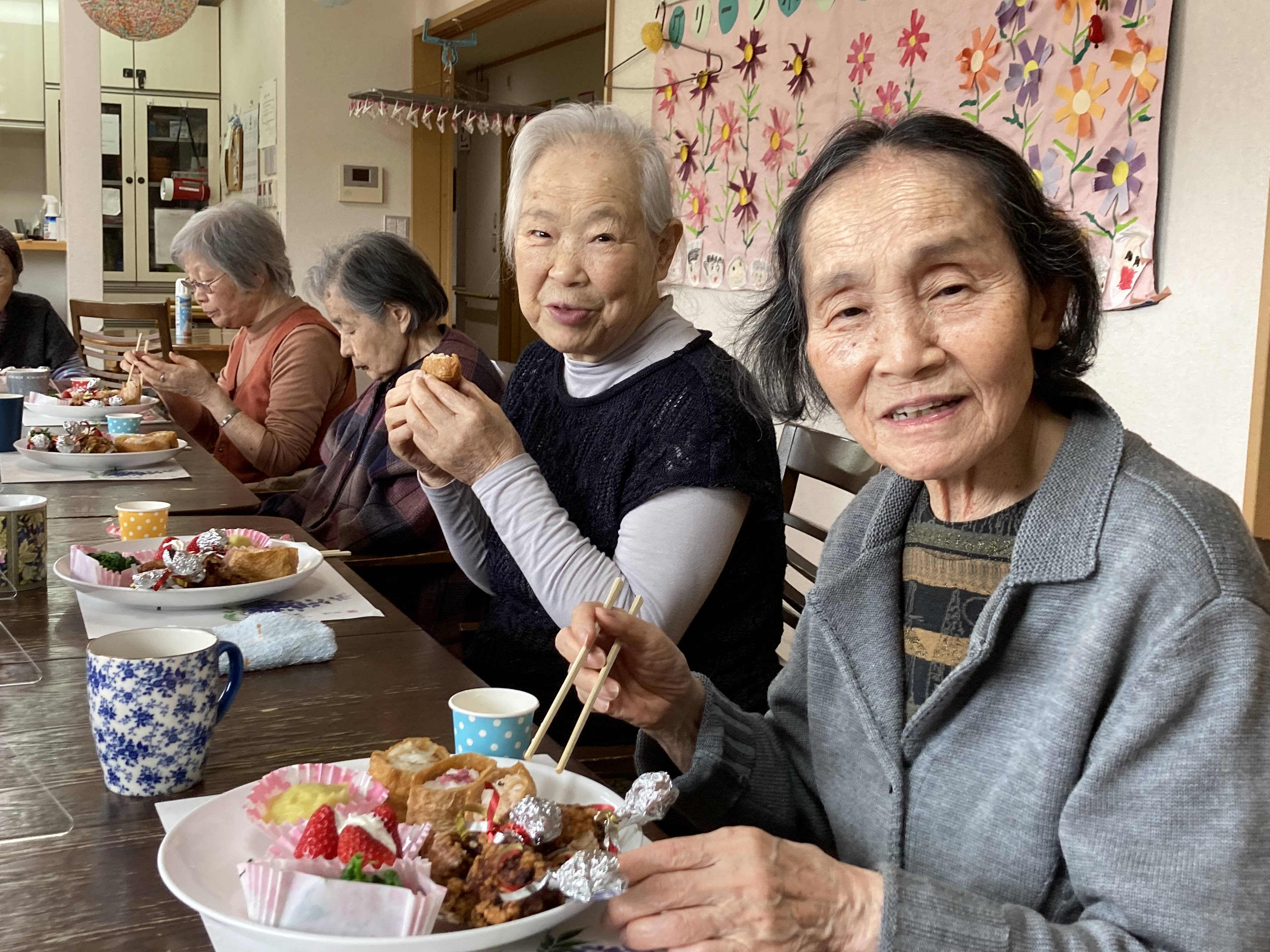 4月29日(金)、春の味覚を取り入れたメニューで食事会を開きました。 今回は、入居者の皆様から『いなり寿司が食べたい』とのリクエストがあってメニューに取り入れさせて頂きました。 「美味しい」ととても喜んで頂きました。これからも美味しいものを沢山作って喜んで頂きたいと思います。
