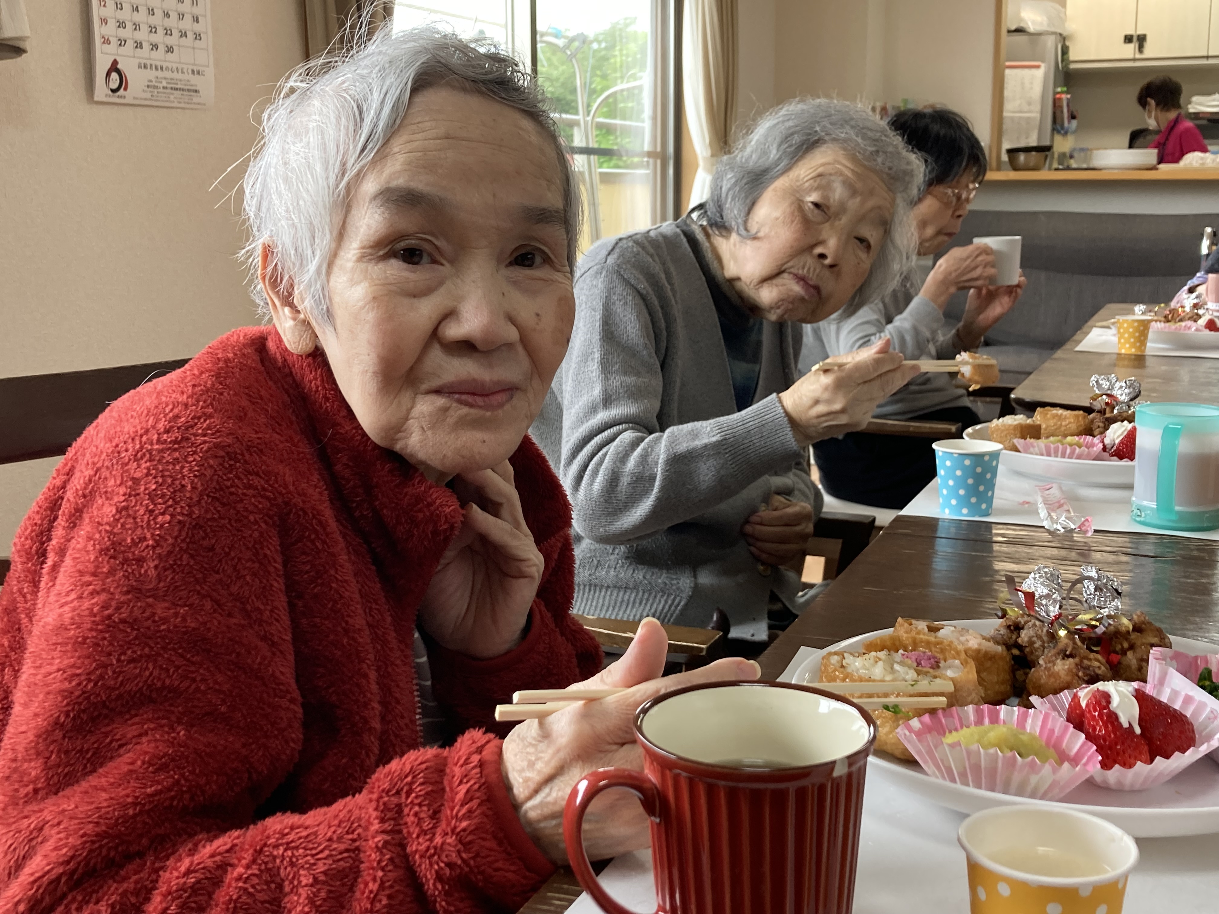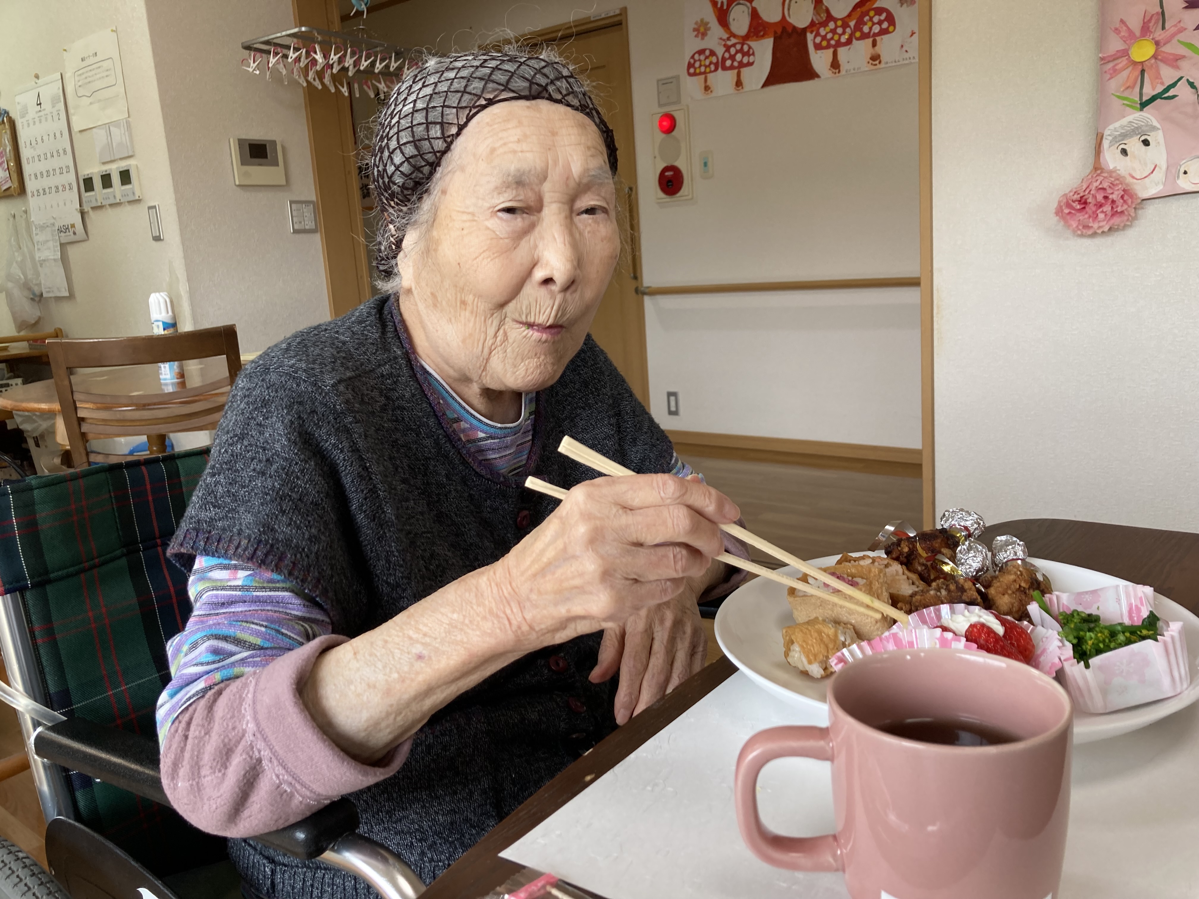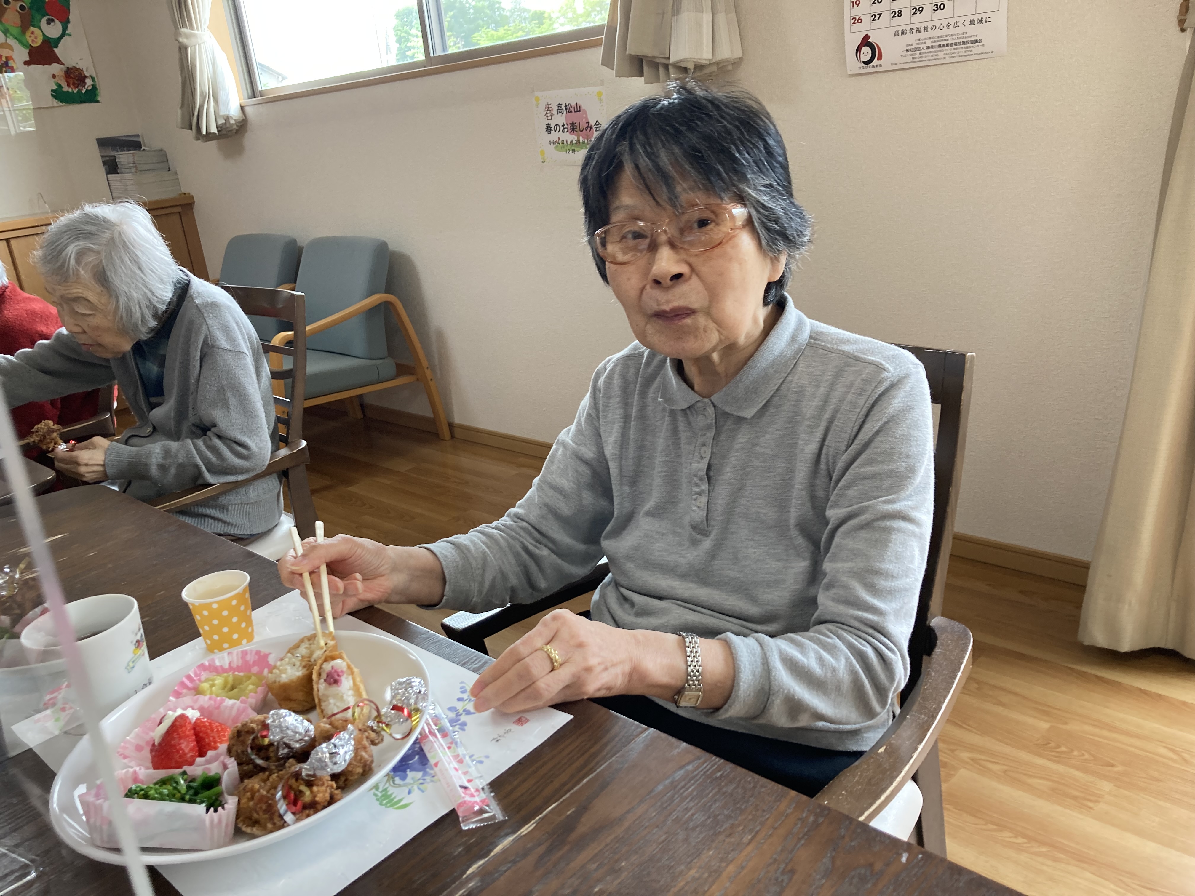 4月29日(金)、春の味覚を取り入れたメニューで食事会を開きました。 今回は、入居者の皆様から『いなり寿司が食べたい』とのリクエストがあってメニューに取り入れさせて頂きました。 「美味しい」ととても喜んで頂きました。これからも美味しいものを沢山作って喜んで頂きたいと思います。