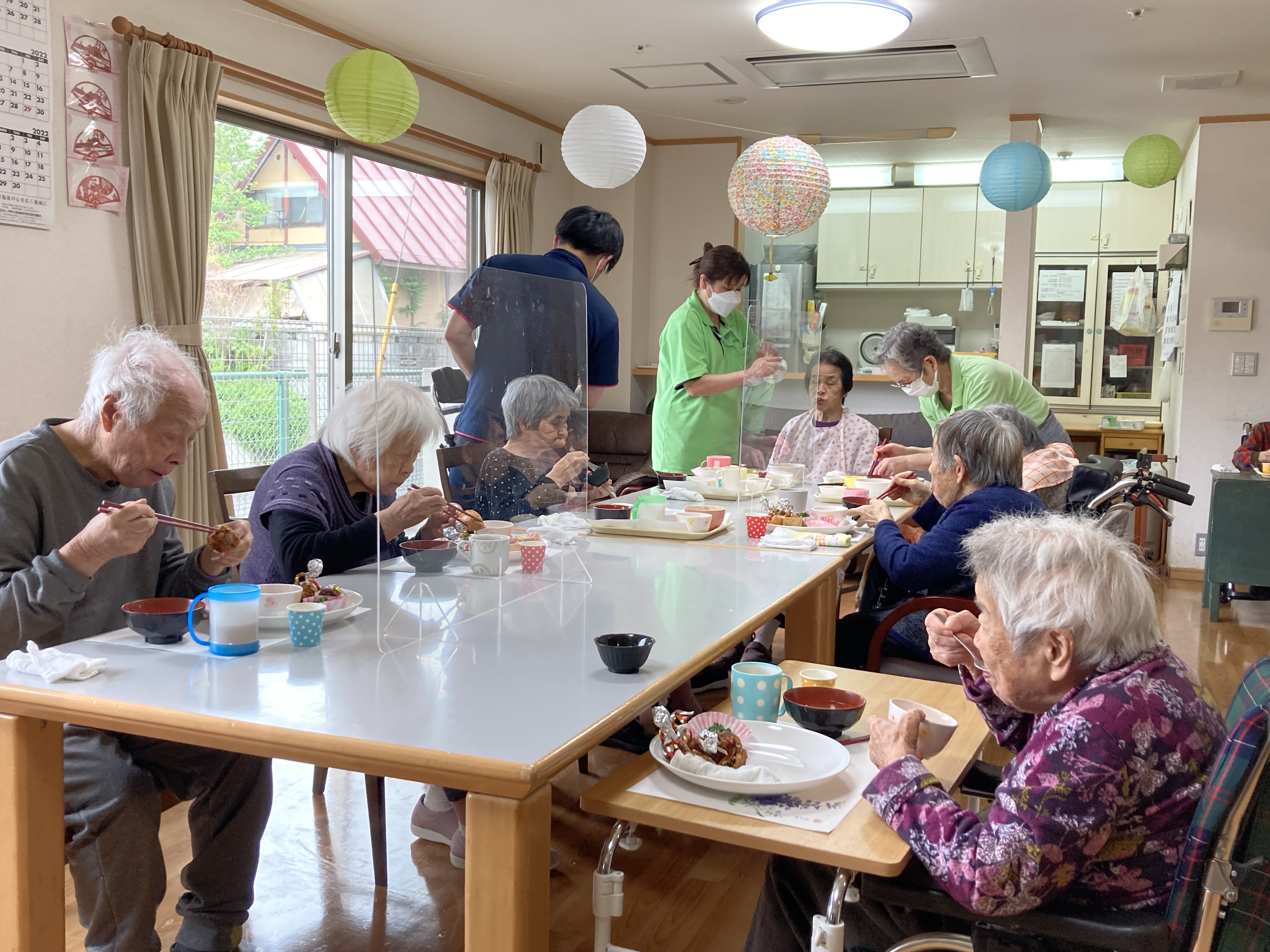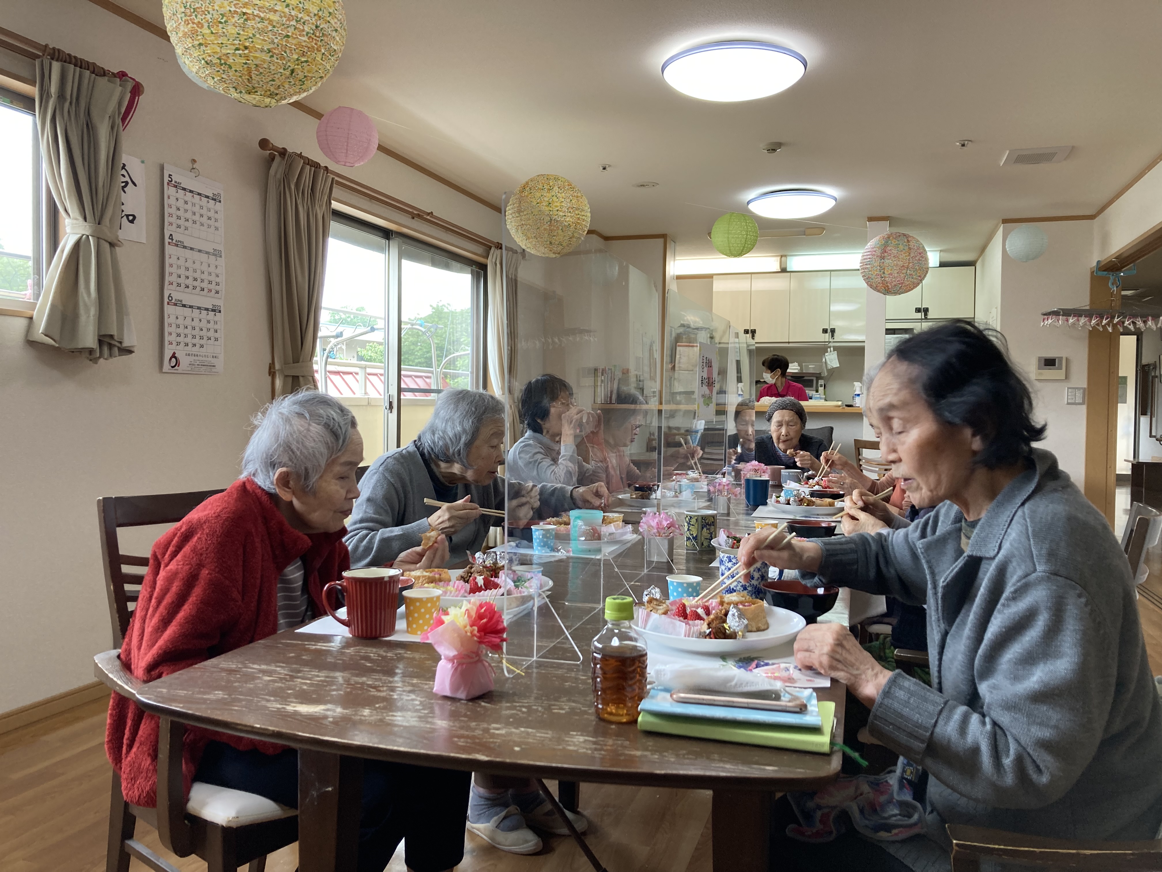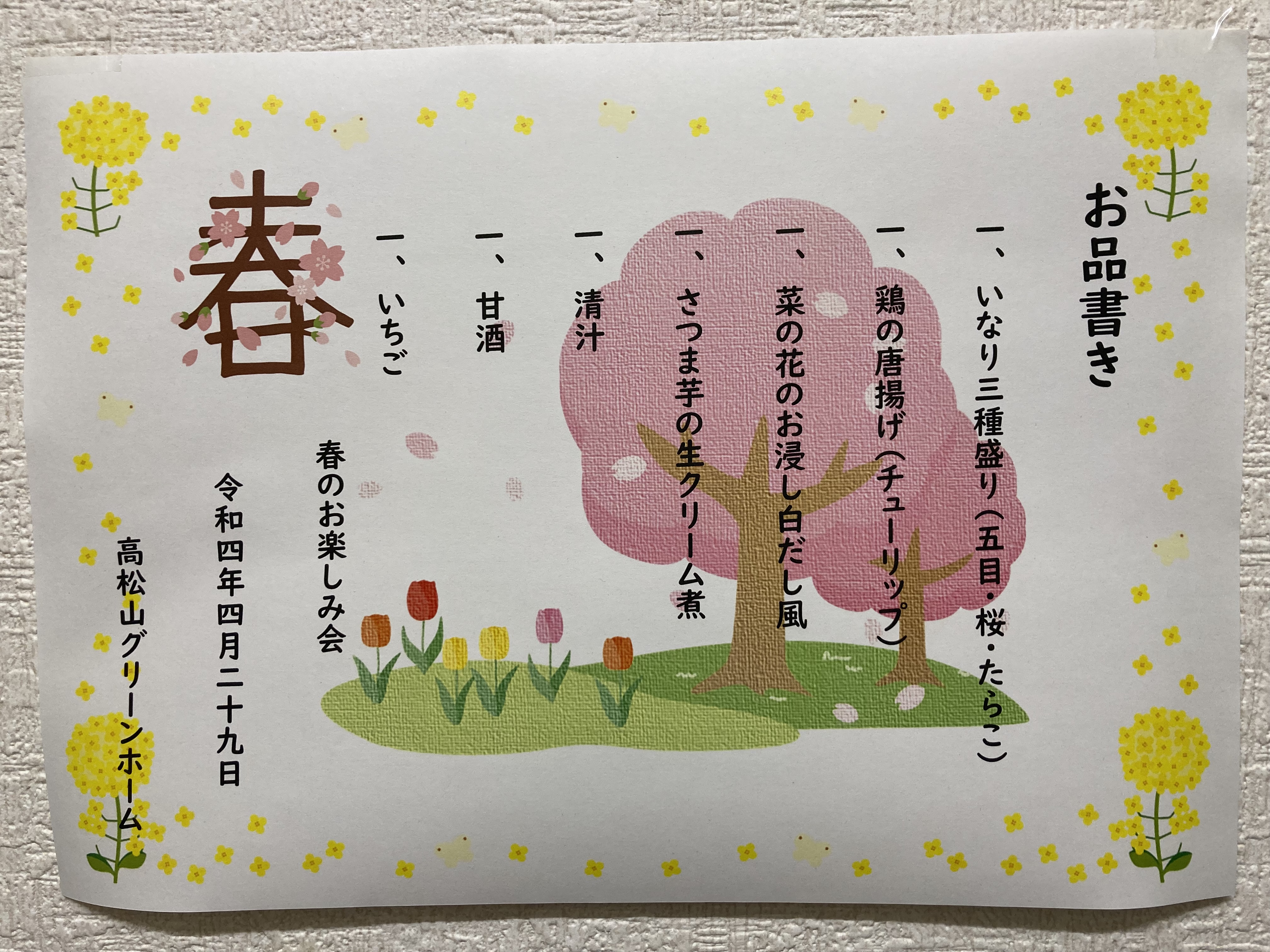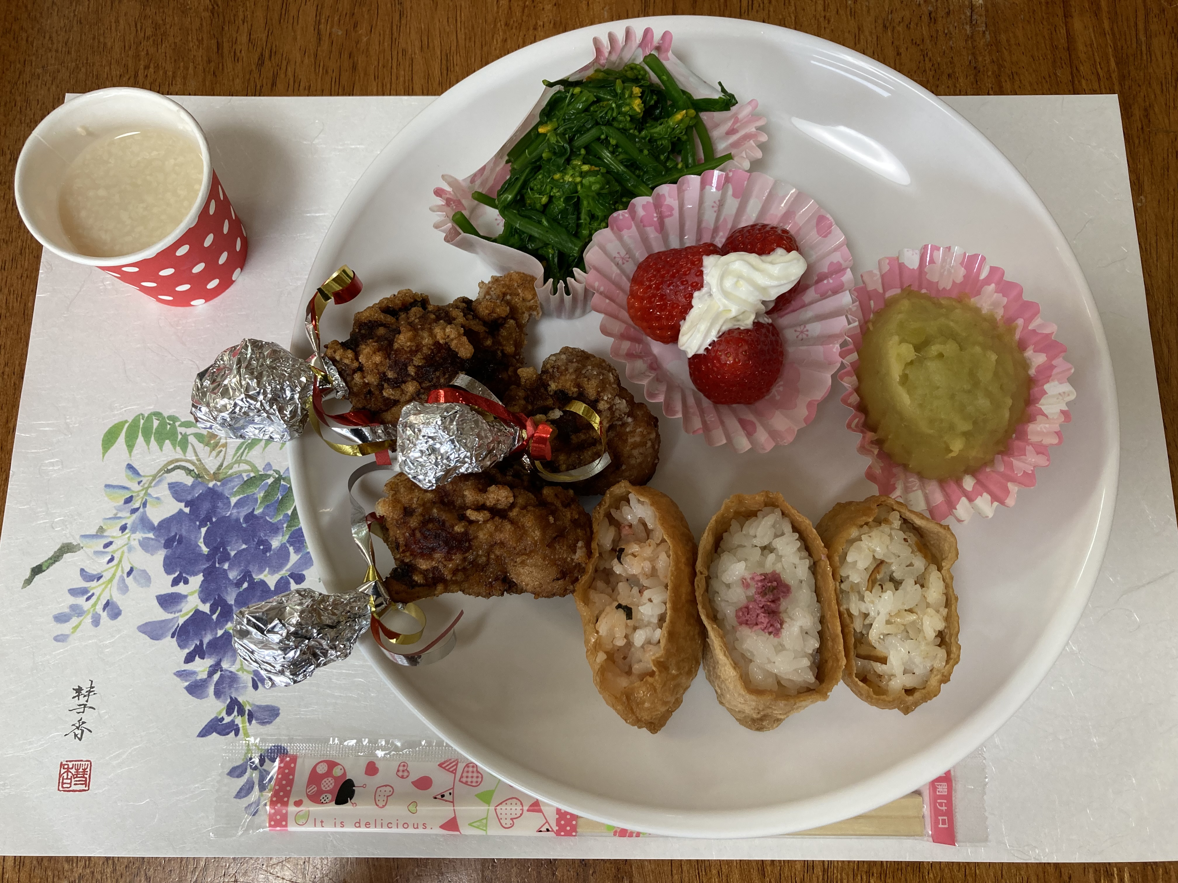 4月29日(金)、春の味覚を取り入れたメニューで食事会を開きました。 今回は、入居者の皆様から『いなり寿司が食べたい』とのリクエストがあってメニューに取り入れさせて頂きました。 「美味しい」ととても喜んで頂きました。これからも美味しいものを沢山作って喜んで頂きたいと思います。