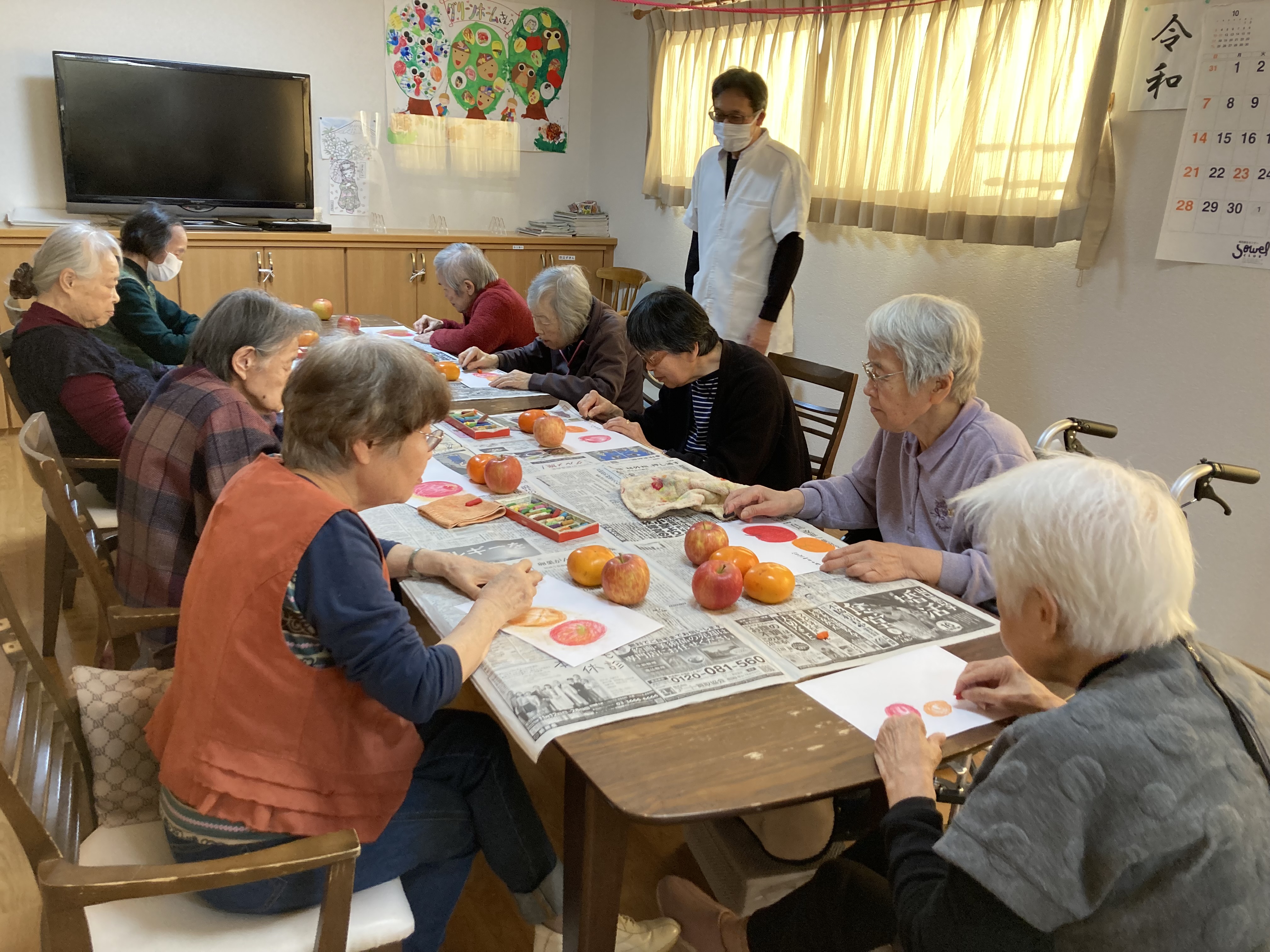 11月13日午後より、落合医院の片山先生指導による臨床絵画を行いました。 今回は『季節の果物を描く』ということで、柿とリンゴを題材にクレヨンを使って 自由に描いて頂きました。 それぞれ個性豊かな作品が出来上がりました。