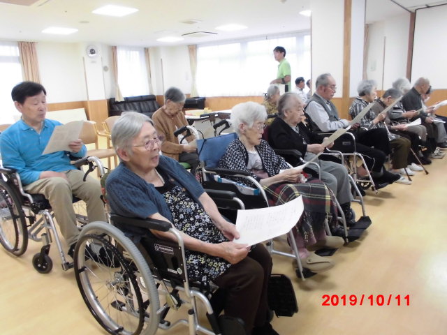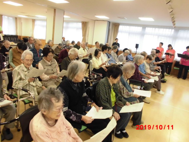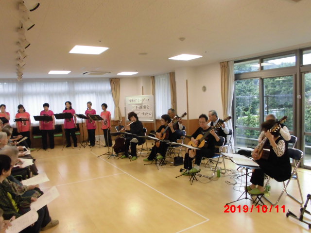 10月11日小町山グリーンホームでは、ギターアンサンブル・トレモロアミーゴスとレディースボディパーカッションの慰問ありました。素晴らしいギターの合奏を披露してくださいました。会場合唱の際にはフルート伴奏もあり、美しい音色と共に懐かしい曲を合唱しました。また、レディースボディパーカッションはJAあつぎ女性部の趣味別同好会の皆様で音楽に合わせ手拍子やリズムカルなパフォーマンスで会場は大盛り上がり。アンコール合唱も行われ、楽しいひと時を過ごすことが出来ました。