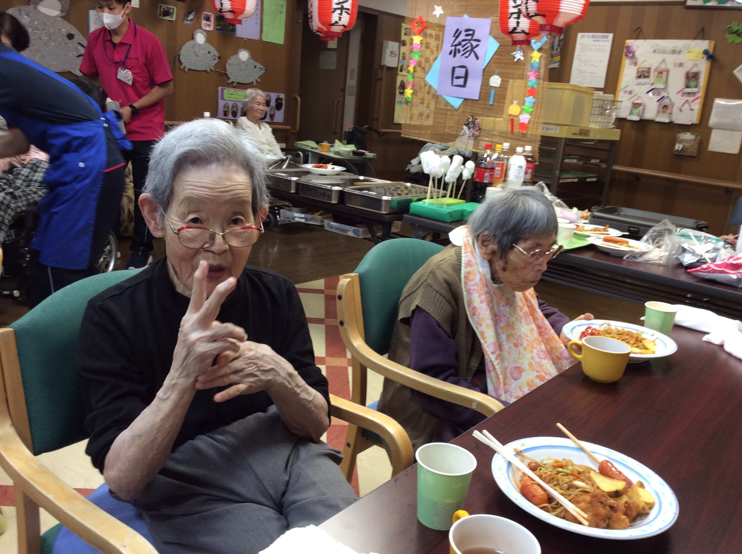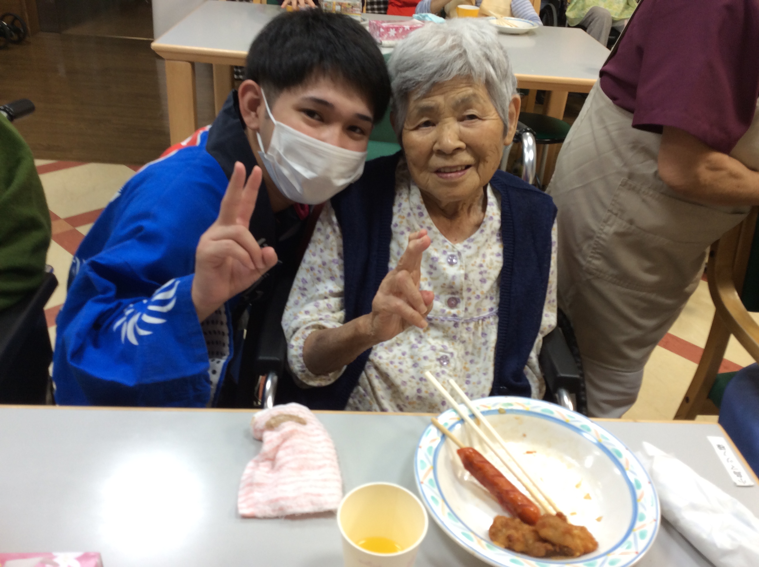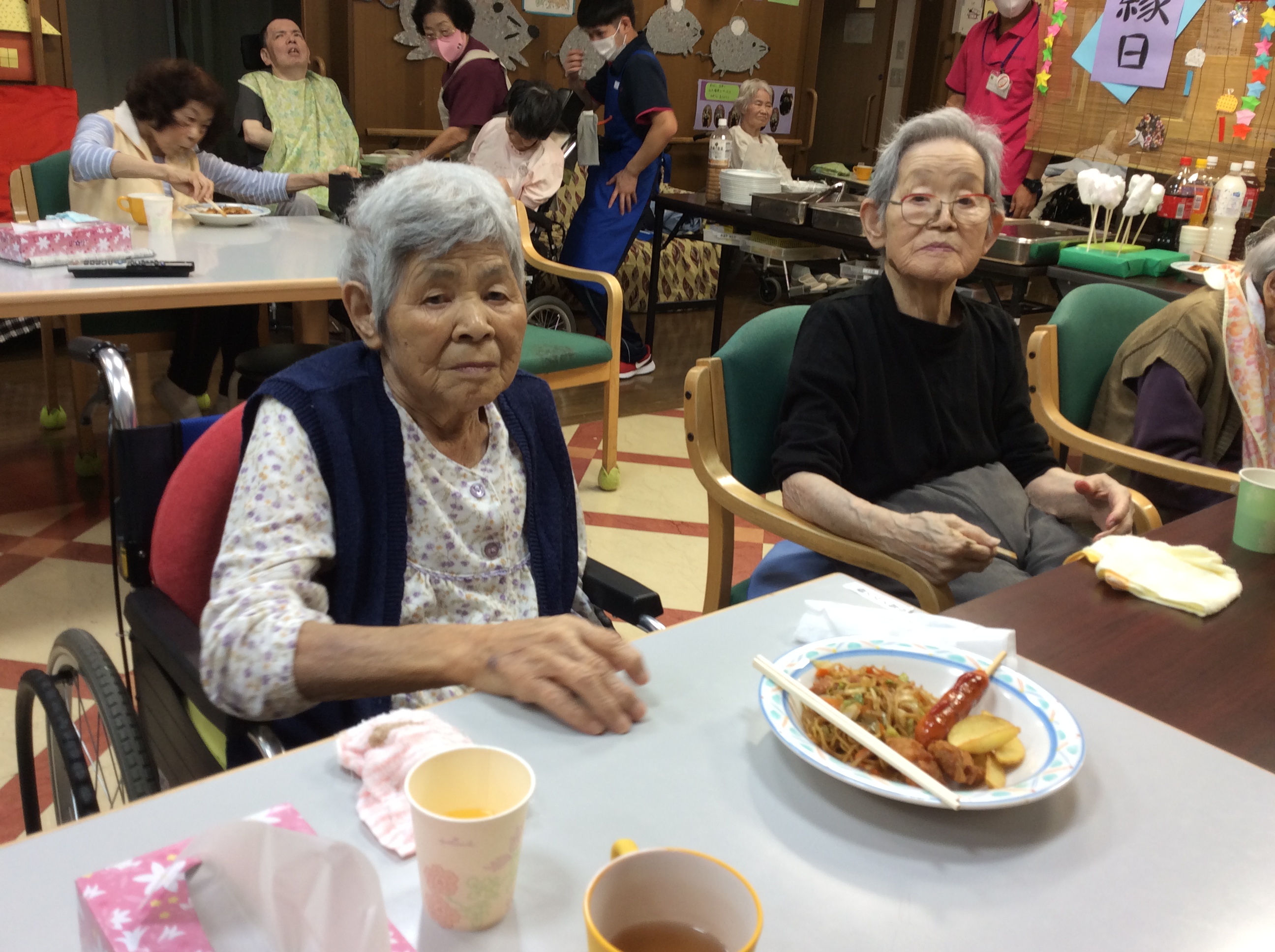 ⦿納涼祭が中止となり、10月5日ショートステイでは縁日イベントを開催しました。 ・普段とは違った雰囲気を作り、美味しい食べ物や盆踊りの音楽でお祭りの雰囲気がでて、ご利用者様同士で昔話や歌を歌われている様子が見られました。 ・「おいしい」「ほっぺた落っこちちゃうわ」などの声が聞かれ普段とは違った表情を見ることができました。 ・ご利用者様と一緒に職員も美味しい食事を頂き、コミュニケーションを図ってより良い関係を築けました。 ・昔の縁日の話にも花をさかせておりました。