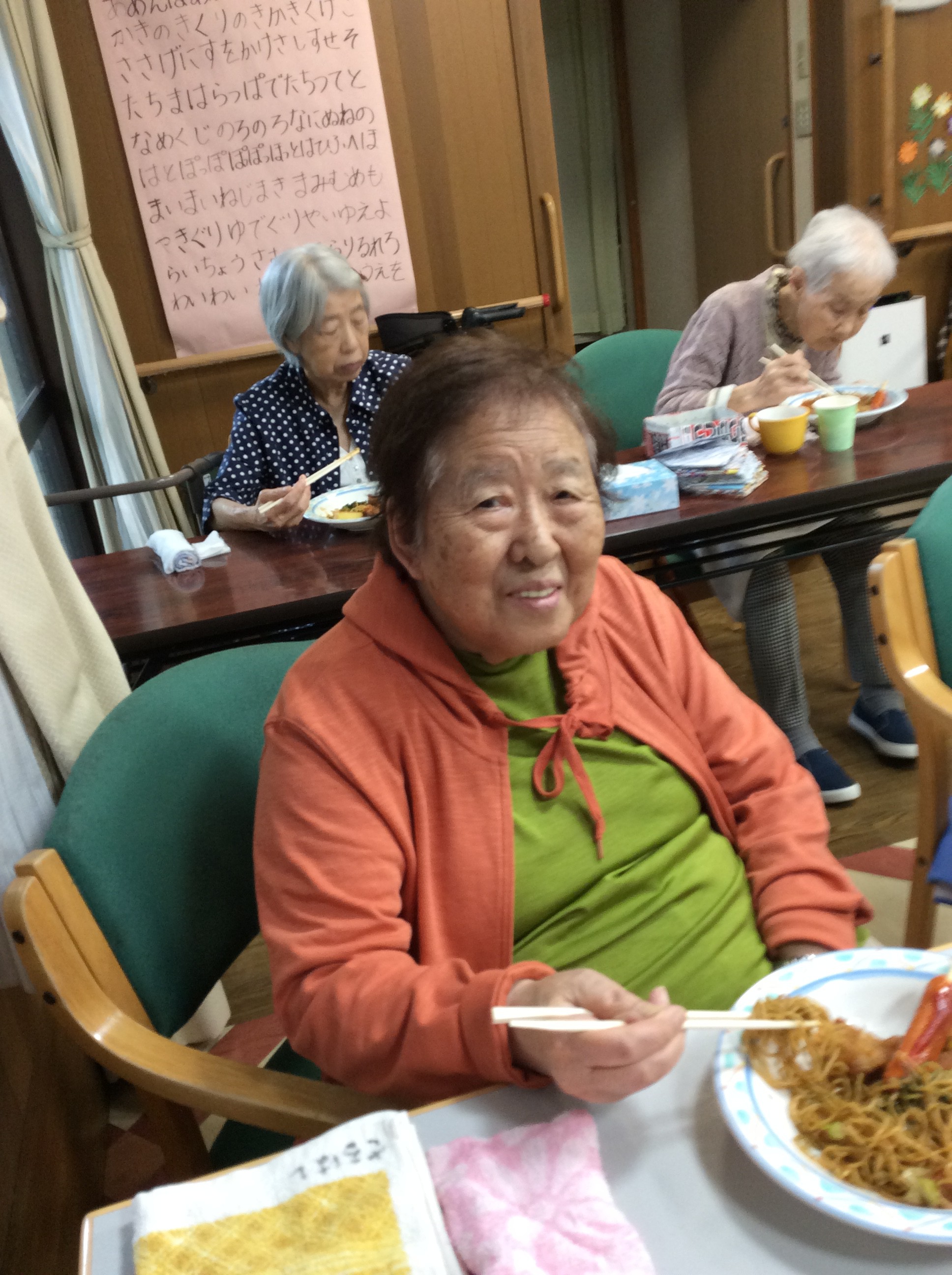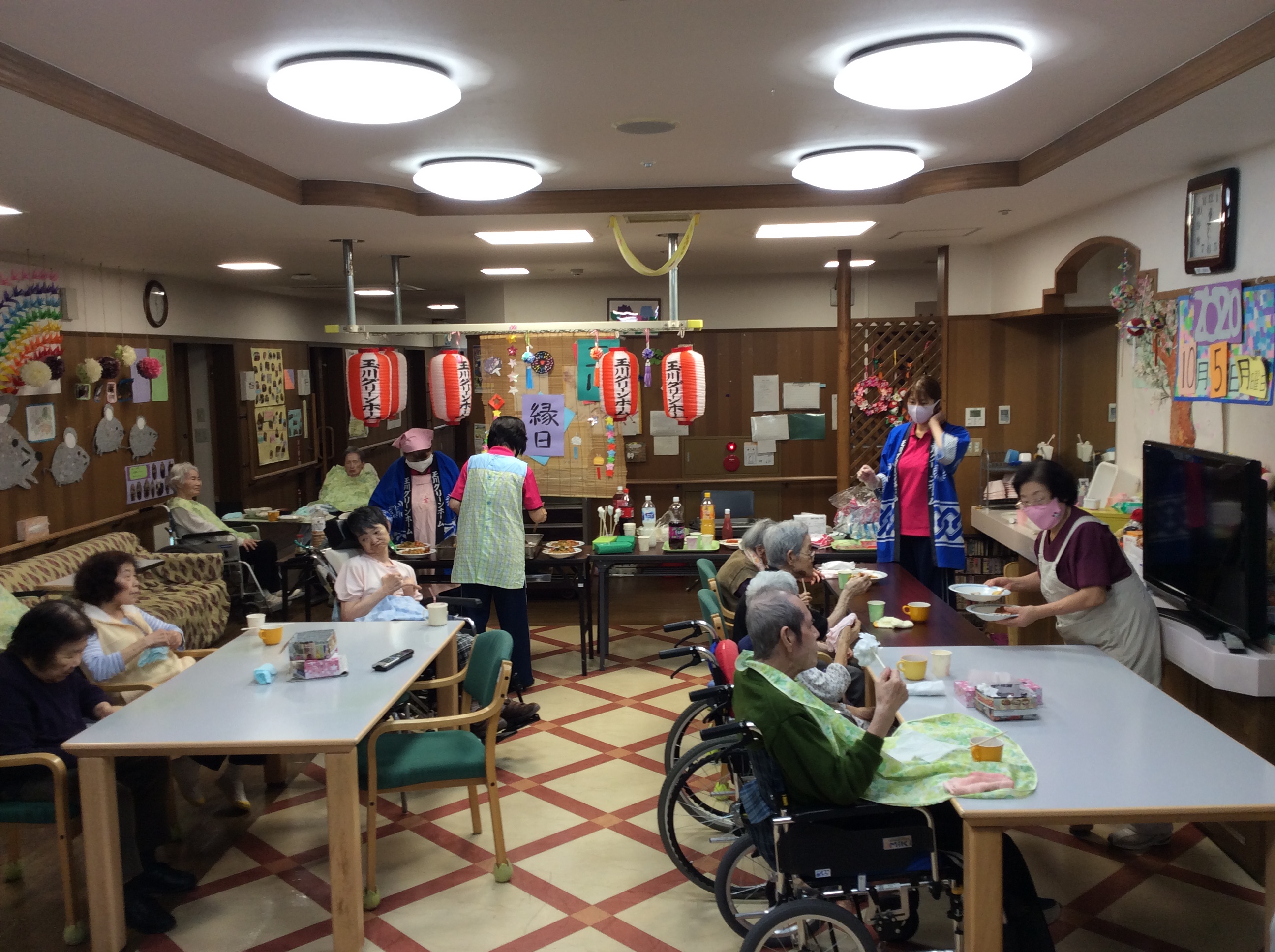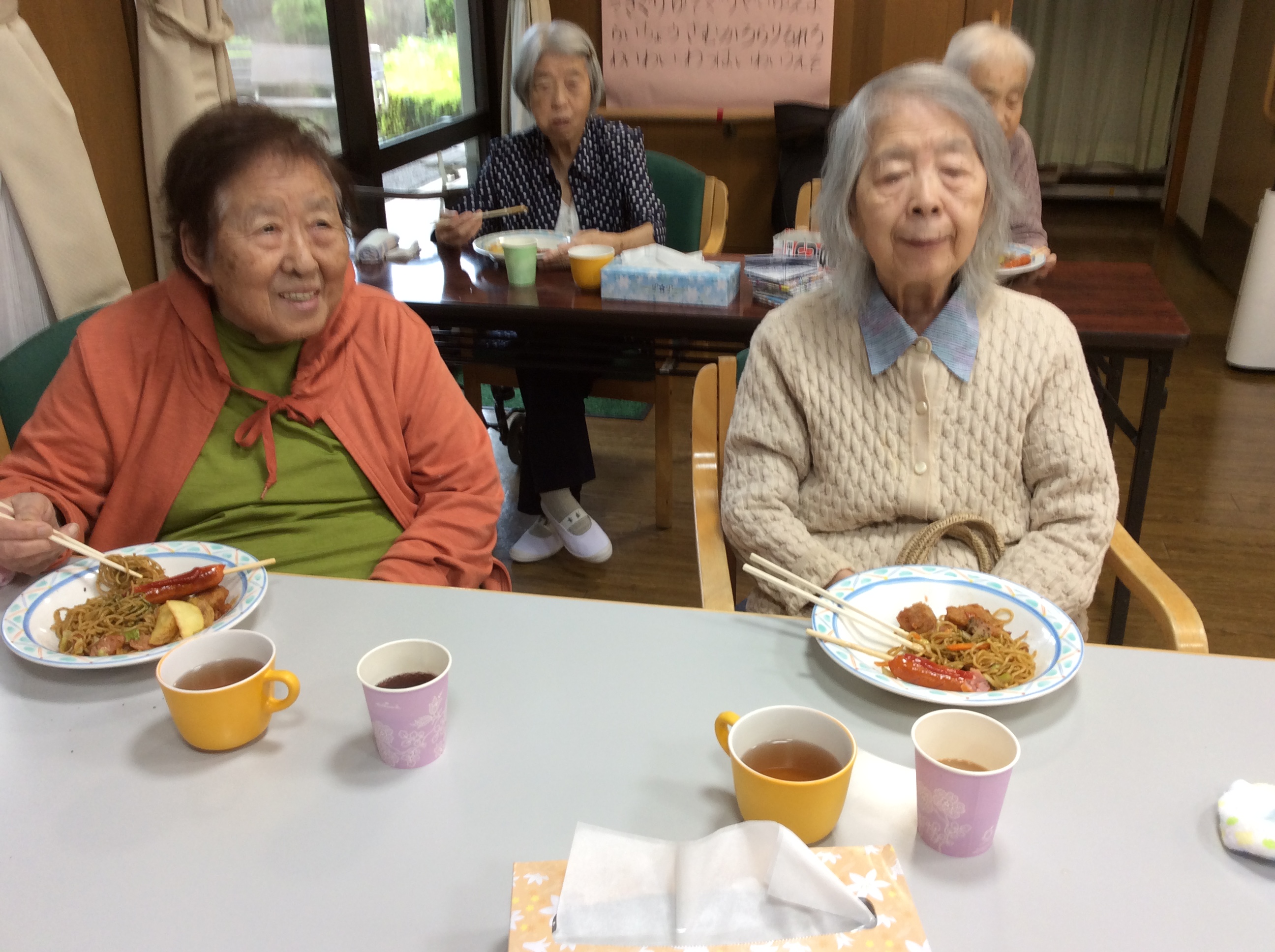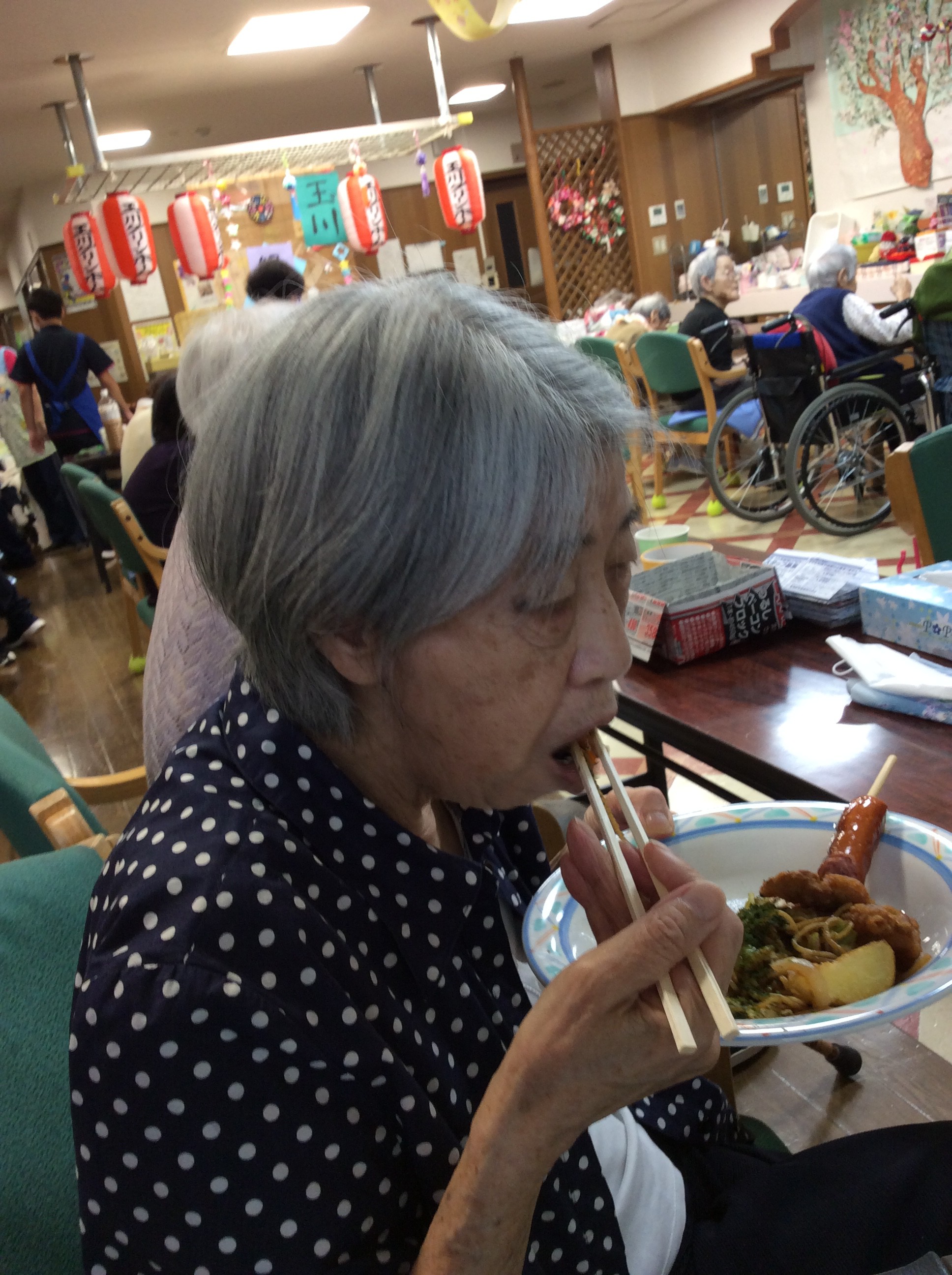 ⦿納涼祭が中止となり、10月5日ショートステイでは縁日イベントを開催しました。 ・普段とは違った雰囲気を作り、美味しい食べ物や盆踊りの音楽でお祭りの雰囲気がでて、ご利用者様同士で昔話や歌を歌われている様子が見られました。 ・「おいしい」「ほっぺた落っこちちゃうわ」などの声が聞かれ普段とは違った表情を見ることができました。 ・ご利用者様と一緒に職員も美味しい食事を頂き、コミュニケーションを図ってより良い関係を築けました。 ・昔の縁日の話にも花をさかせておりました。