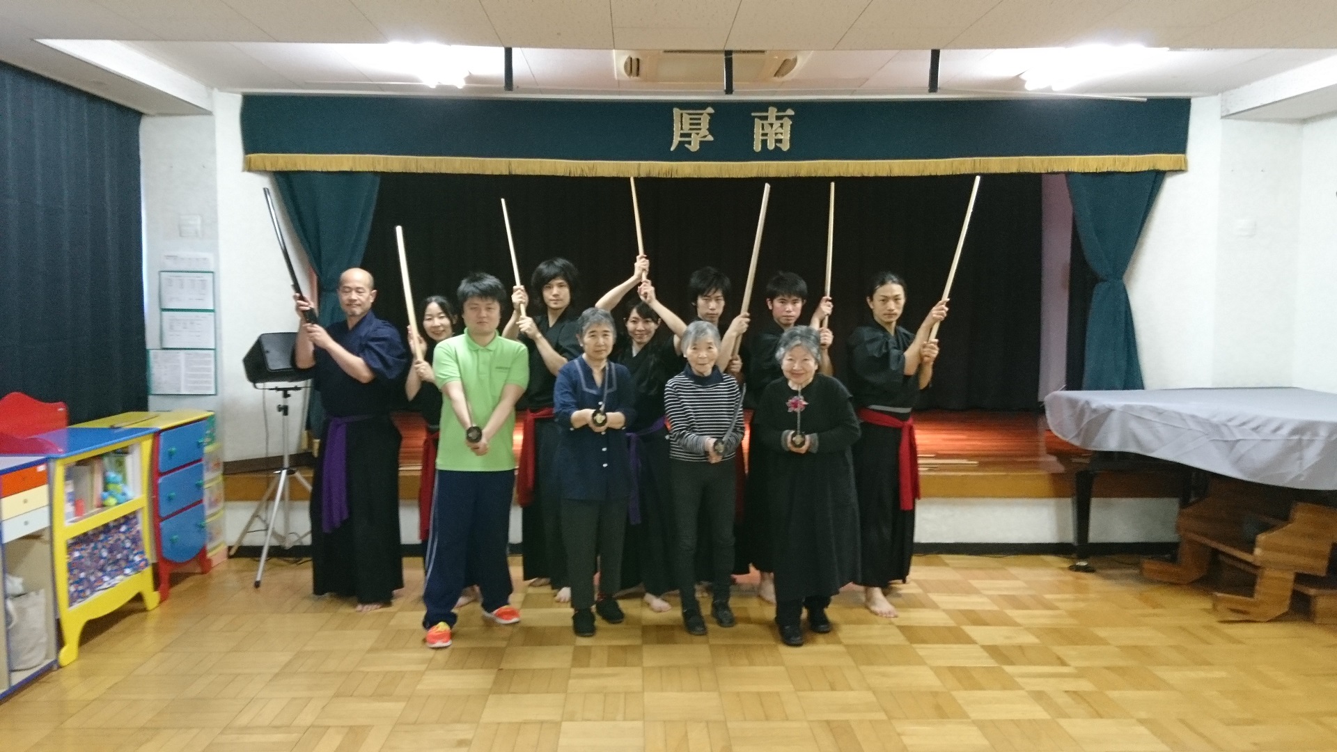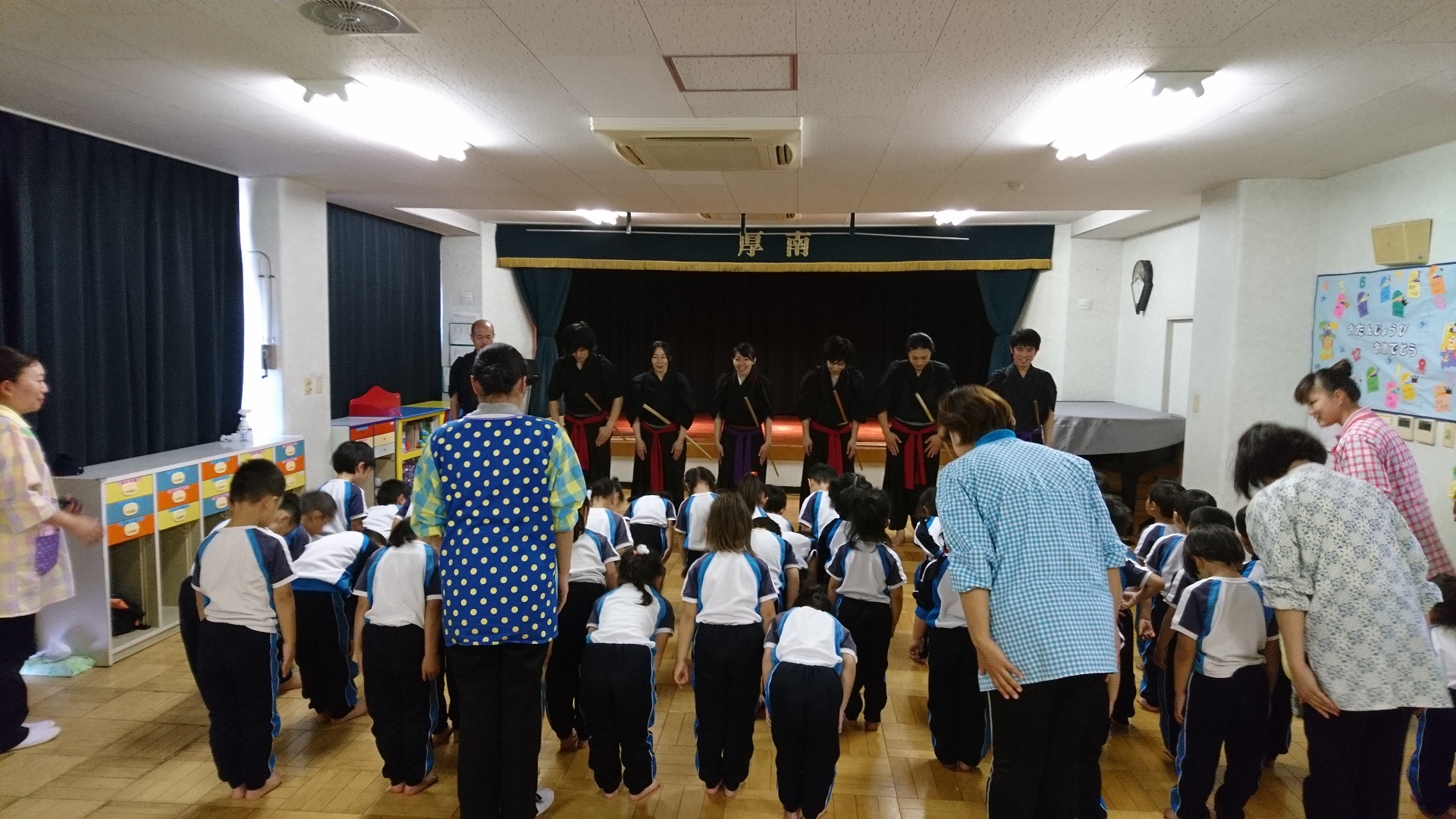 5月15日(火)、ご近所の厚南幼児園からご招待を受け、釼技会鑑賞に行ってきました。 園児のみなさんは、指導をしてくれる先生の話をよく聞いて、 とても真剣に取り組んでいました。 そんな子供たちの姿を目にすると、なんだか気持ちが高ぶってしまいました。 最後はみなさんと記念撮影です。 招待していただきありがとうございました。 とても楽しかったです。
