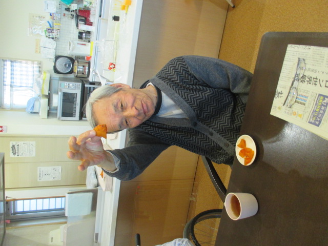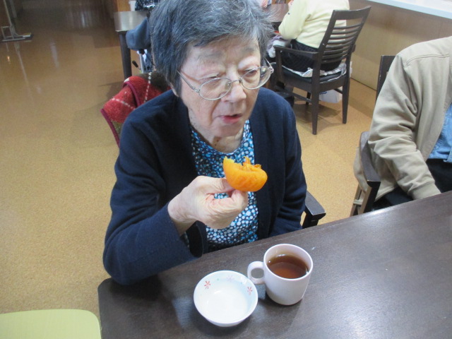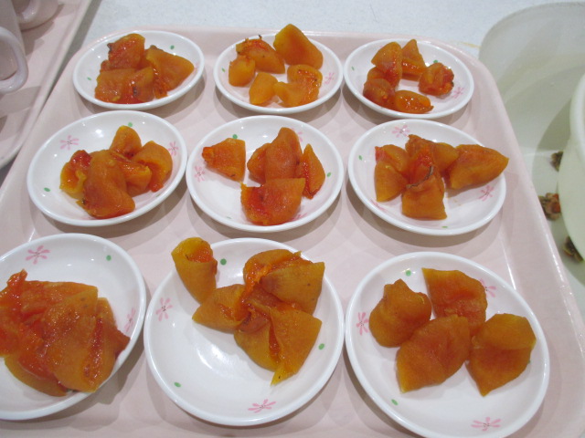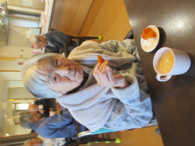 秋は過ごしやすい季節ですね。 入居者のみなさんに、何をおやつに召し上がりたいかお聞きしました。 栗 干し柿 サツマイモ と、秋の美味しいものが挙がりました。 リクエストにお応えして、あんぽ柿をおやつに提供させていただきました。 甘くておいしい♪と喜ばれました。 また近々秋のおやつを提供させていただきますね! 乞うご期待!!