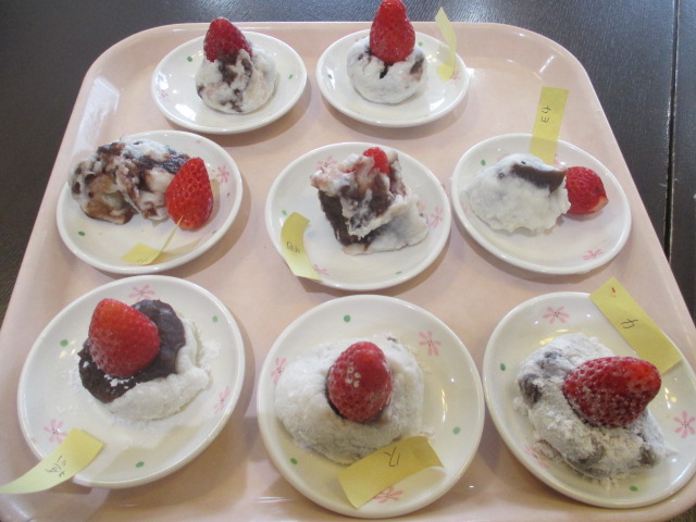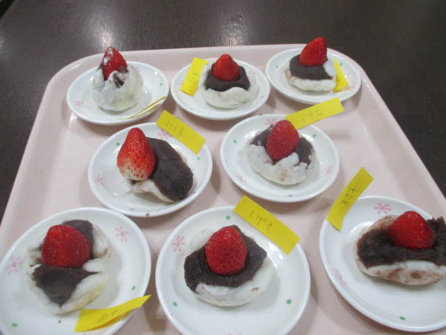 愛甲グリーンホームでは、 春のお楽しみおやつ作りを実施しました。 メニューは『イチゴ大福』です。 みなさんの大好きなあんこを丸めて、求肥で包み、イチゴをトッピング♪ 可愛いイチゴ大福ができました♪ よくみるとなかなか個性豊かですね。 温かいお茶を入れて、みなさんとおやつに 美味しく召し上がることができました。 楽しかったです。