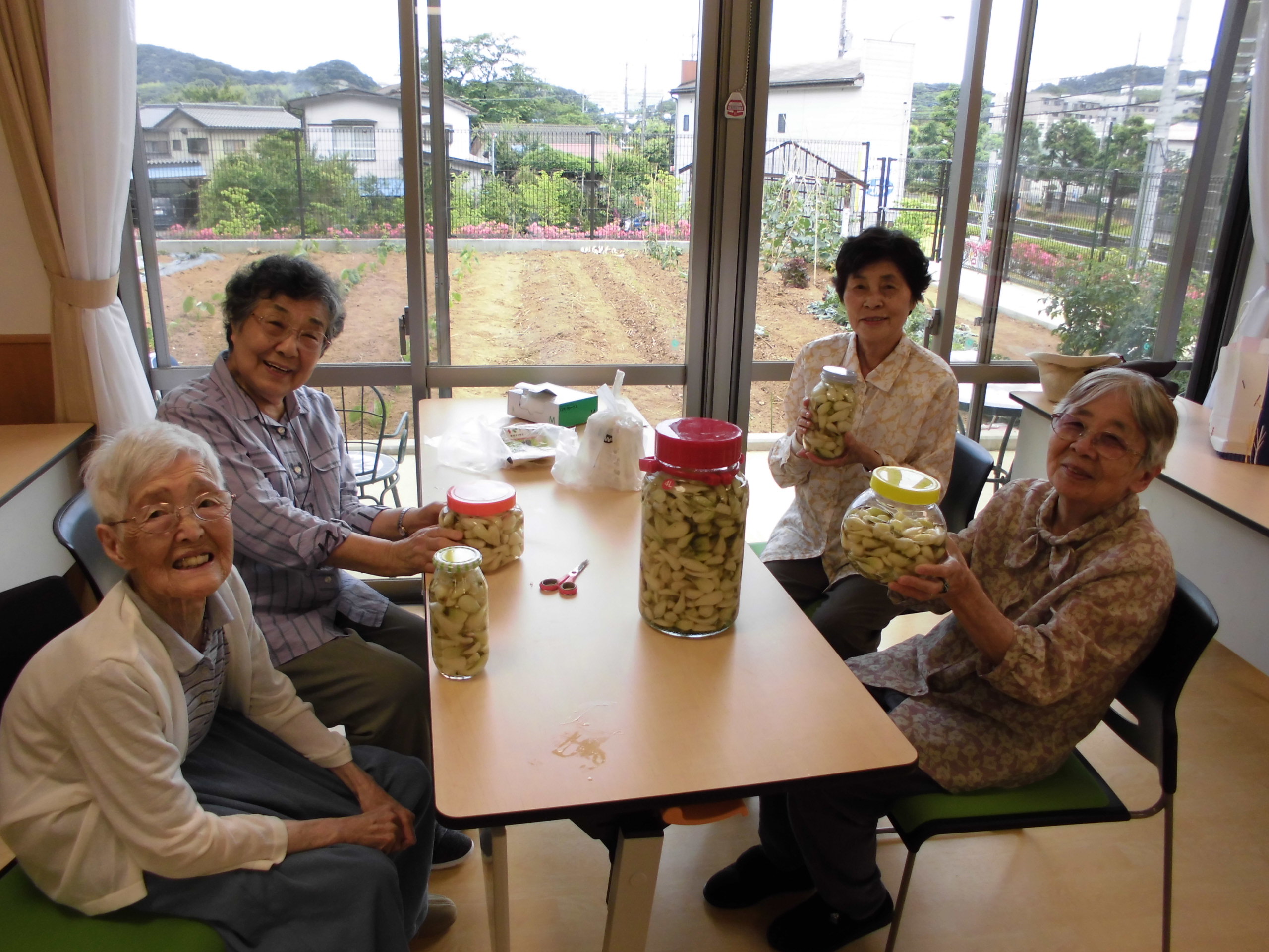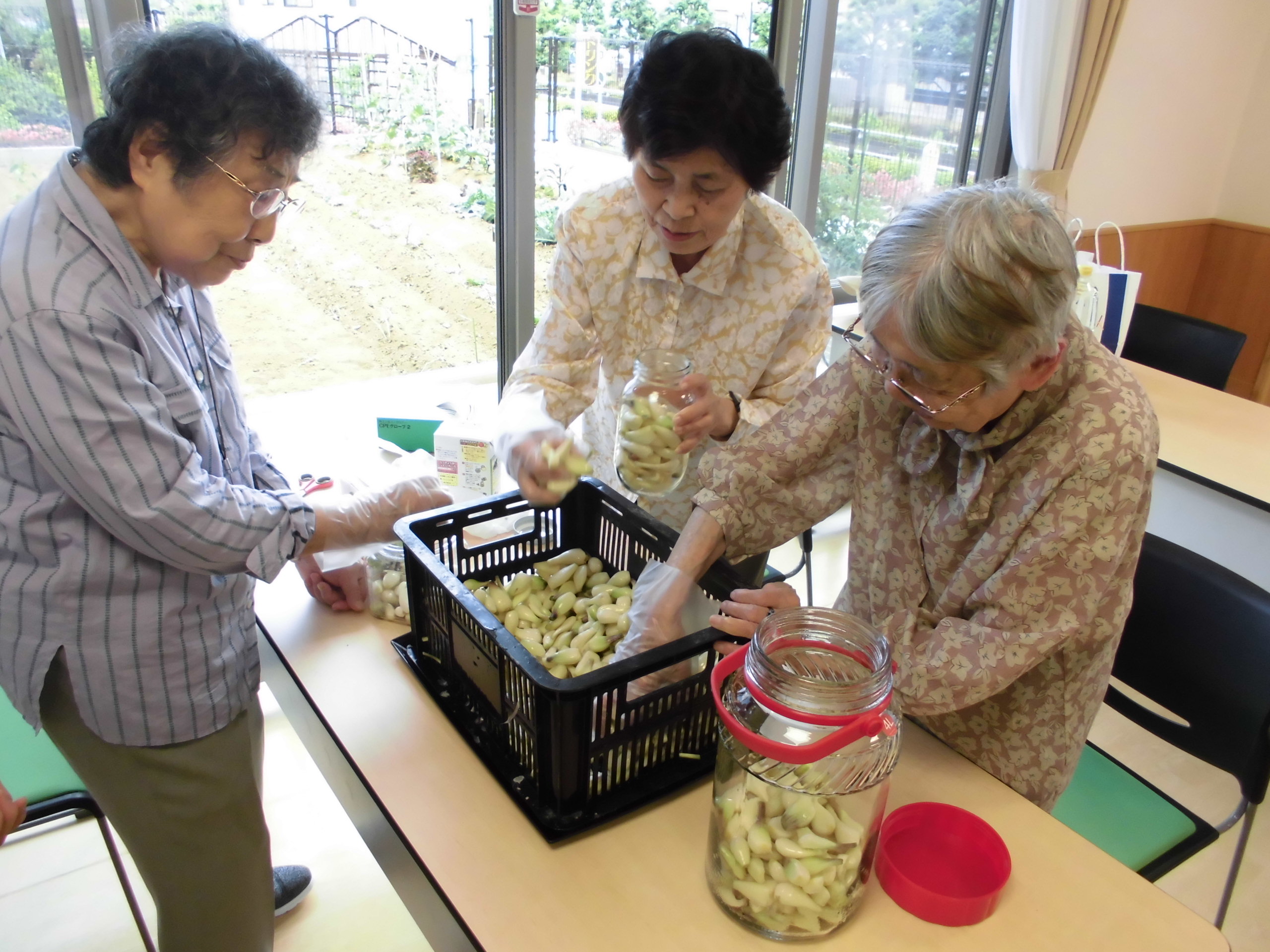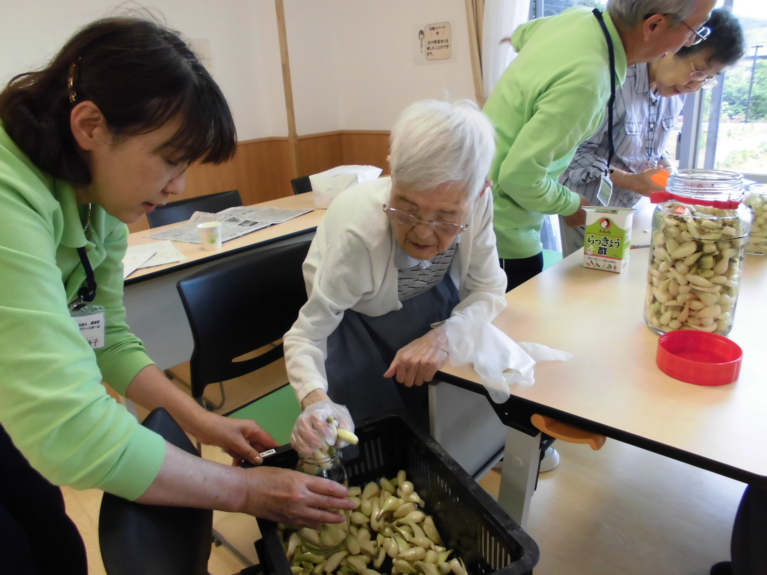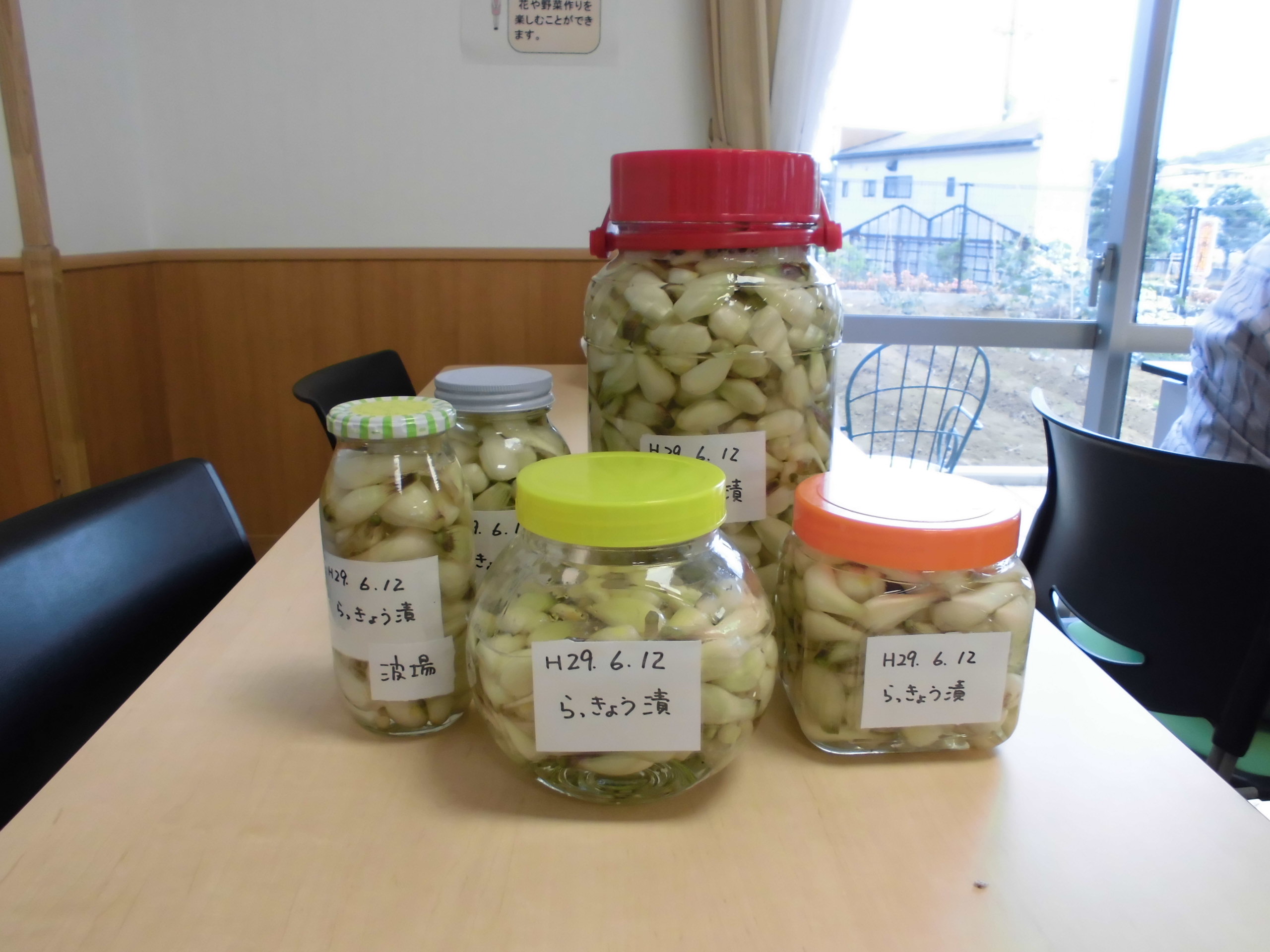 平成29年6月12日 小町山グリーンホーム らっ きょう漬け 小町山の畑にらっきょうが沢山。 おしゃべりしながら、作業開始。 あたまと根っこを切ります。 初めてだけど、楽しいわよ~。 薄皮をむいてきれいに洗いましたら… 瓶にいれて、 らっきょう酢を入れて。 完成しました。 2,3週間後の味見が楽しみです。