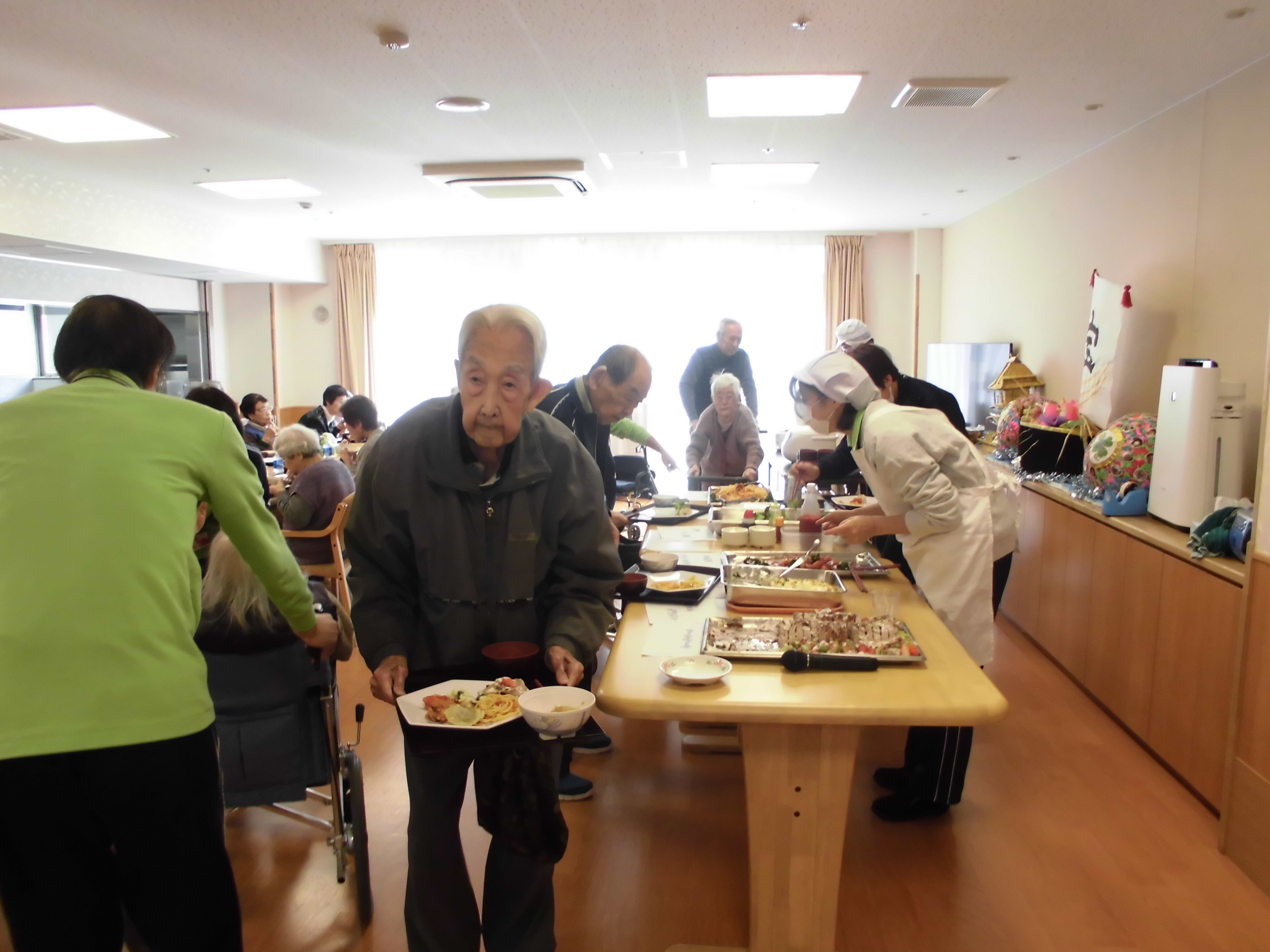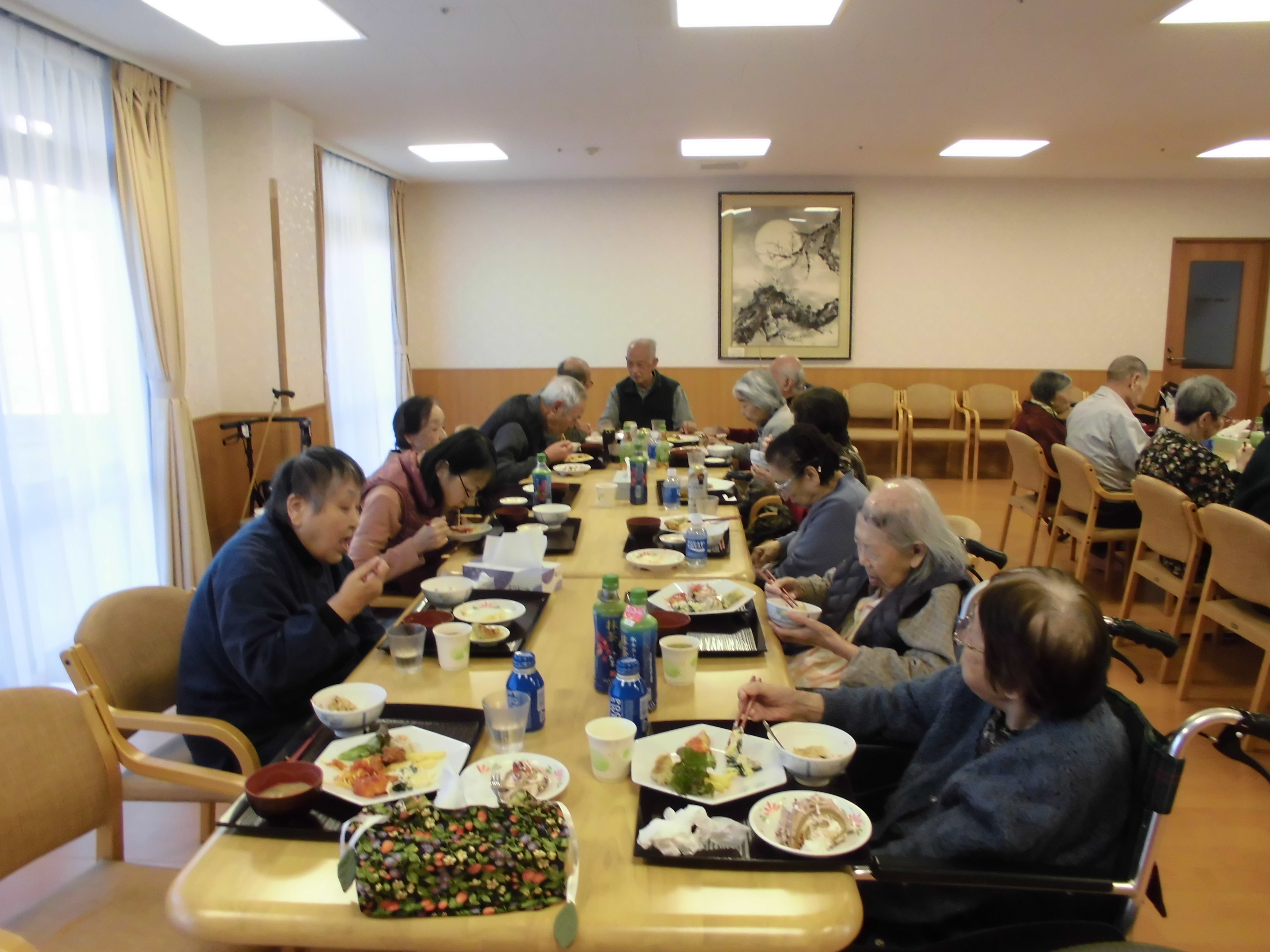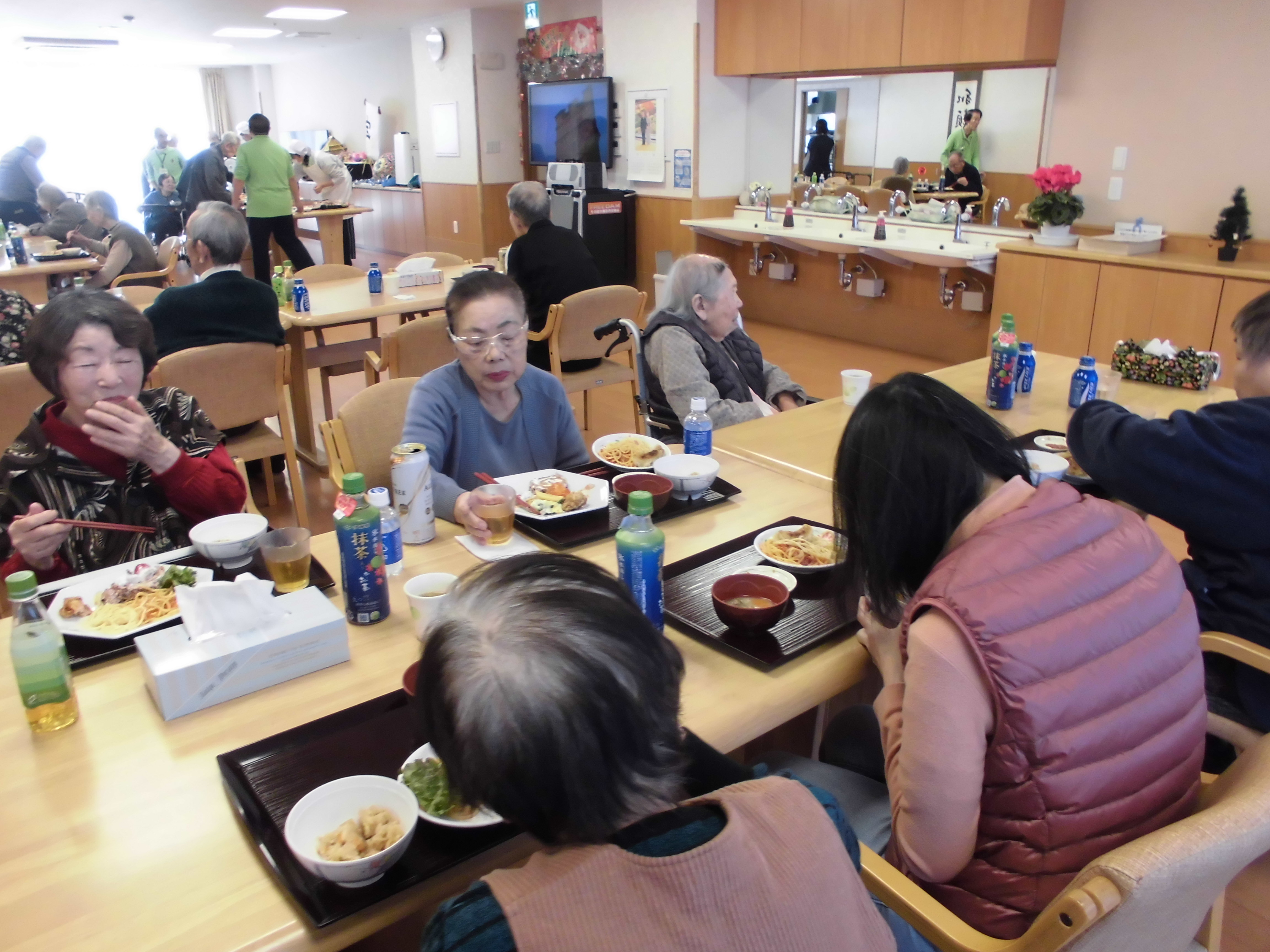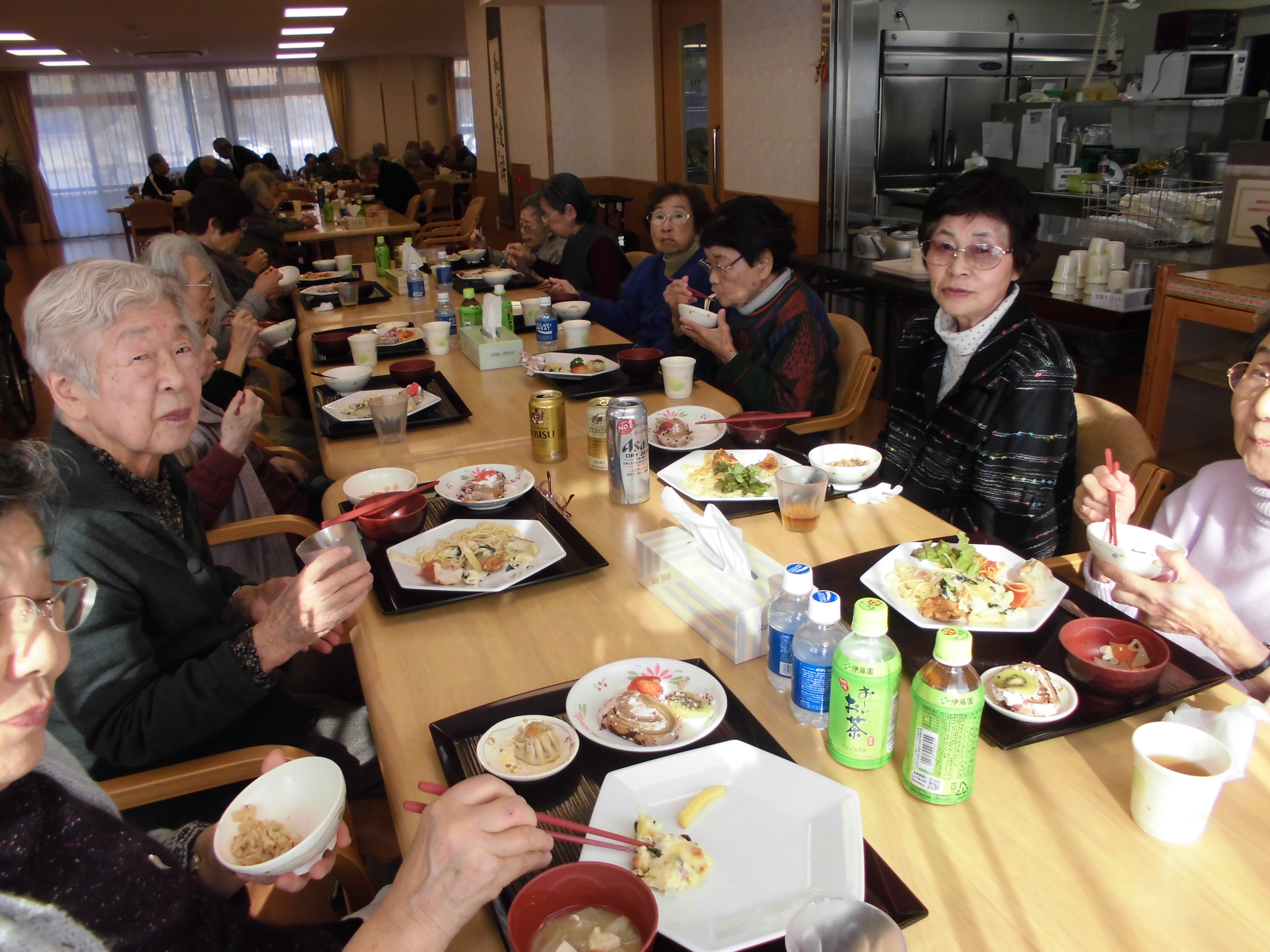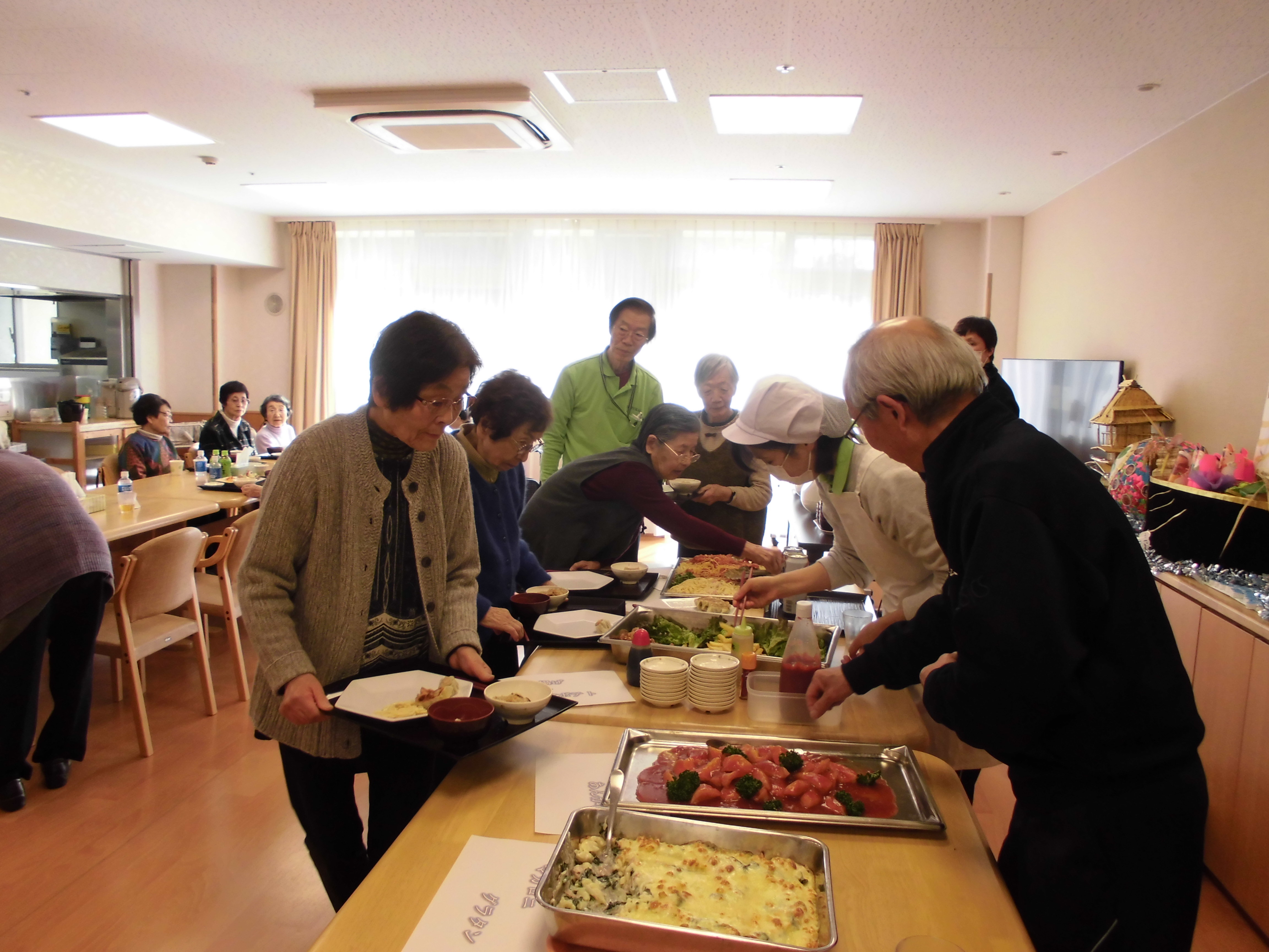 平成29年12月19日 小町山グリーンホームでクリスマス会・忘年会を開催しました。 厨房の星野さん、萩原さん、内藤さんが腕を振るって作ってくれた料理をバイキング式で好きなものをゆっくりとおいしくいただきました。