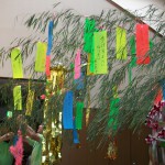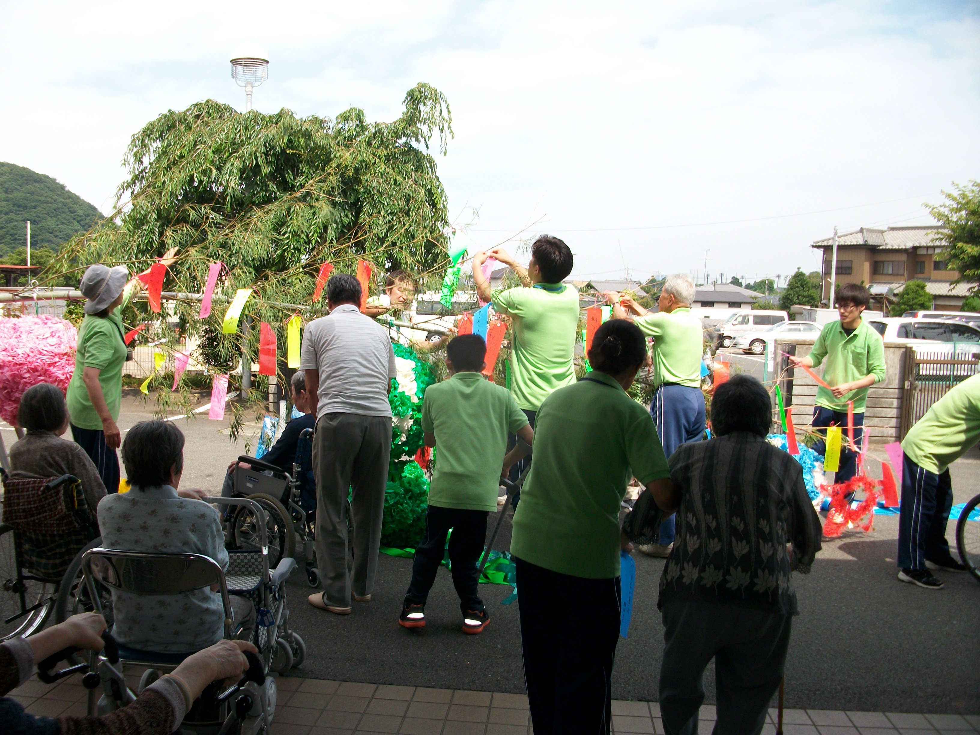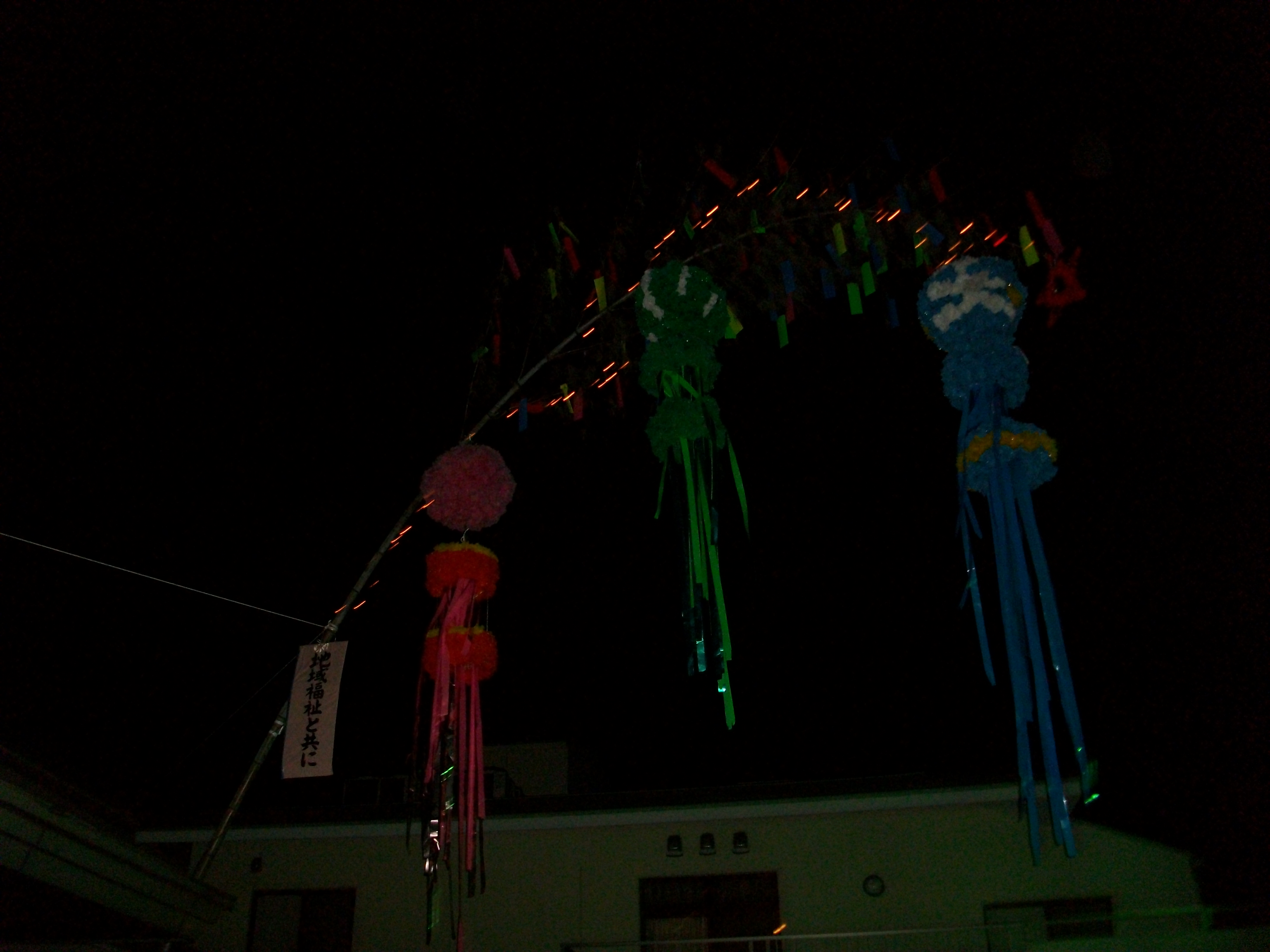 毎年恒例の七夕飾り。飾りつけの為に大きな竹を職員が取ってきます。 男性職員8人で運びました。 短冊は風で飛ばされないようにしっかり結びます(#^.^#) 夜は、ライトアップします。皆さんの願い事が叶いますようにm(__)m