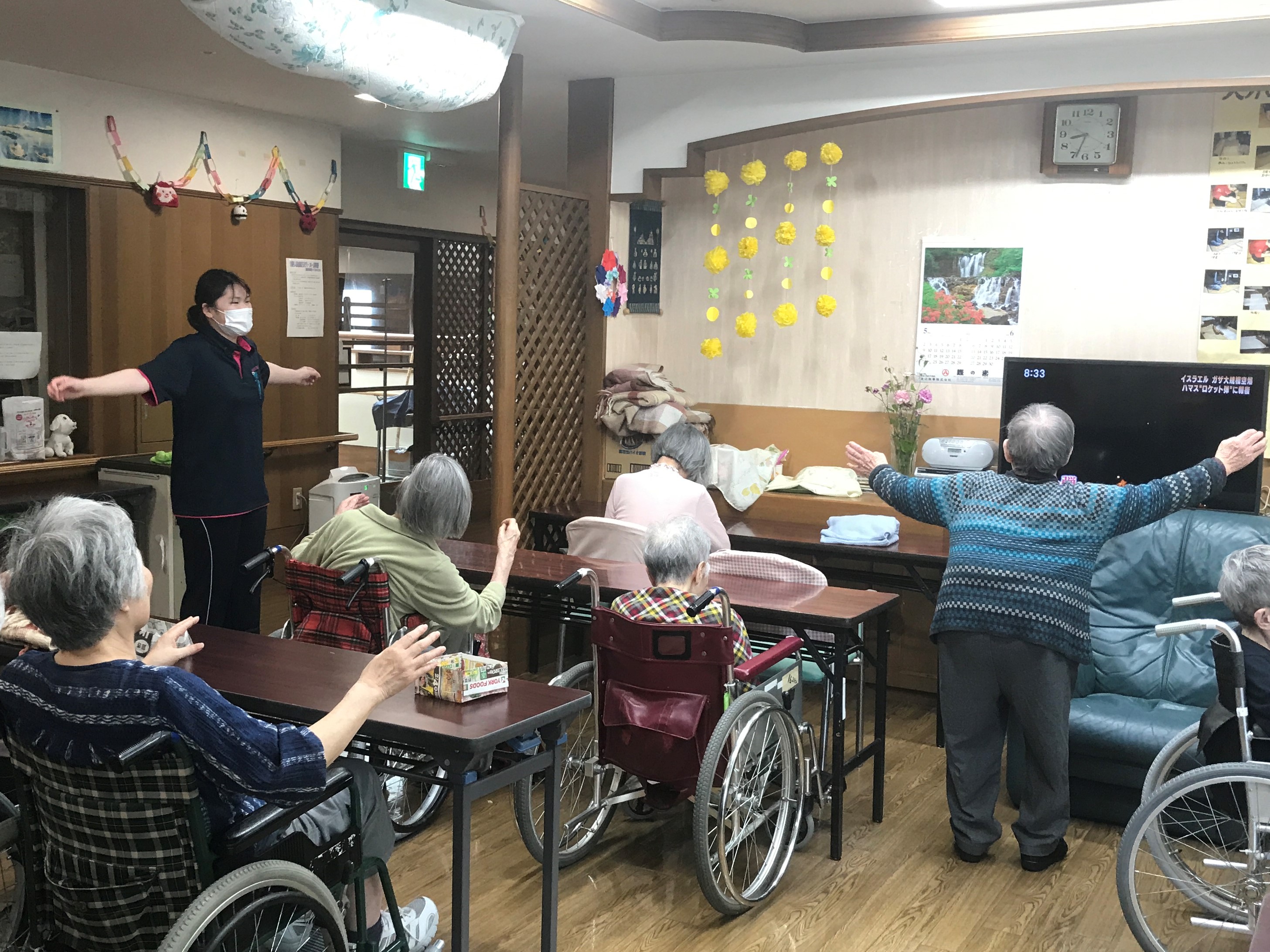1、2! 1,2! 朝といえばラジオ体操ですね。 玉川グリーンホームでは8時30分になるとラジオ体操の曲が流れてきます♪ 新館特養でも毎日行っております。 今日も一日元気に過ごしましょう! ジャンプする所は足踏みで♪