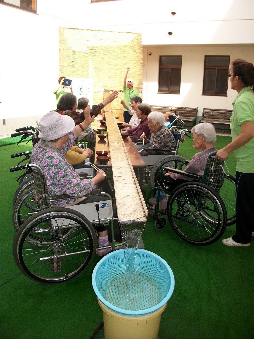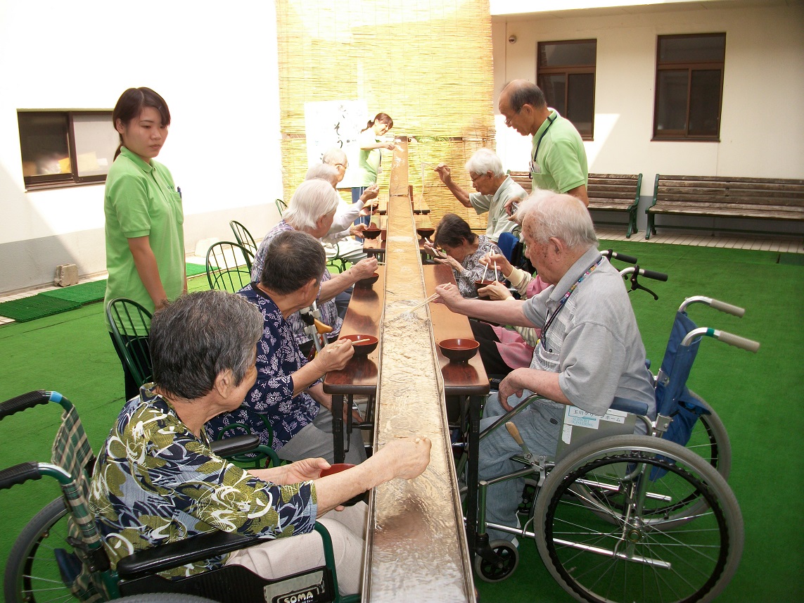 今年も、夏の風物詩、大好評のそうめん流しを行いました。 皆さん、楽しみにされており、おおいに盛り上がりました。 暑くて食欲がなくてもこれなら食べれます! 早く流してーいっぱい食べるわよ 美味しくて何杯でも食べれるわ! みんなで美味しくいただきました。ごちそう様!!