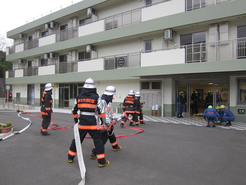 今回は、厚木市消防本部玉川分署、厚木消防団第6分団の皆様の合同訓練も併せて実施され、建物の構造、避難経路なども確認して頂きました。
