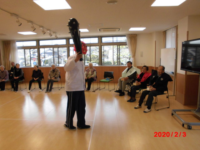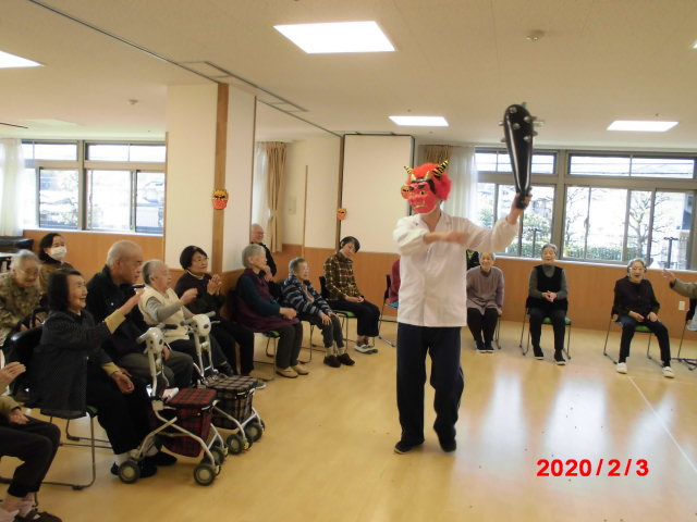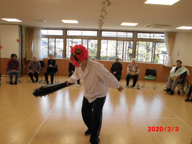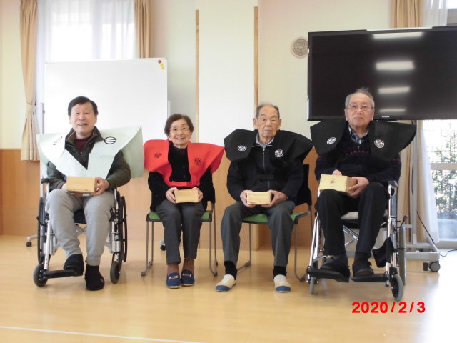 2/3小町山グリーンホームでは、福男・福女4名が中心となり、現れた大きな赤鬼に豆を投げつけました。