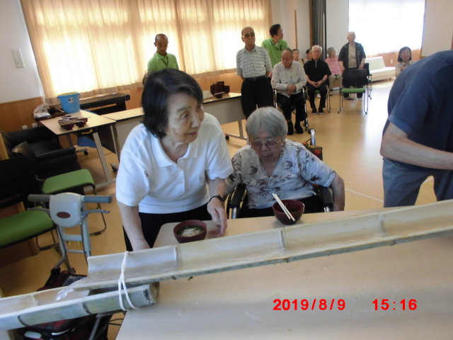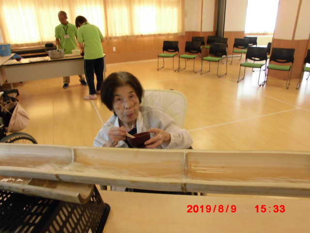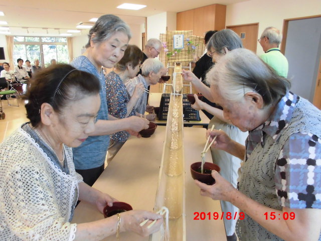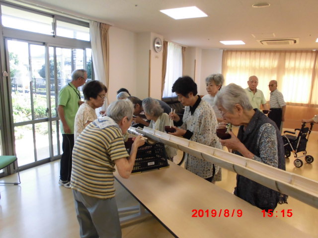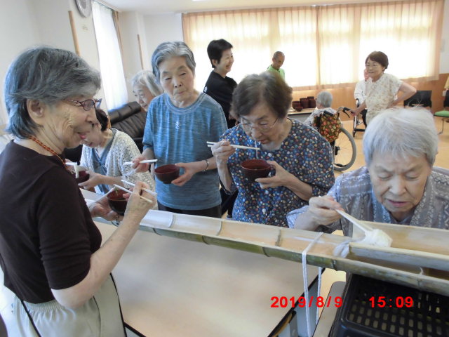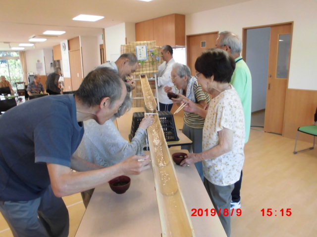 8/9(金)小町山グリーンホームでは恒例の流しそうめんが行われました。 高千穂峡が発祥の地の流しそうめんは野良仕事の合間に青竹と岩清水を使い そうめんを食していたのが始まりと言われています。 小町山グリーンホームでは毎年8月に青竹を使い、入居者の皆さんと流し そうめんを楽しみます。見た目の清涼感があり昼食後のイベントでしたが、 そうめんは食べやすいため皆さんお腹いっぱい召し上がられ、大満足の ご様子でした。終りの合図にはみかんが流されました。