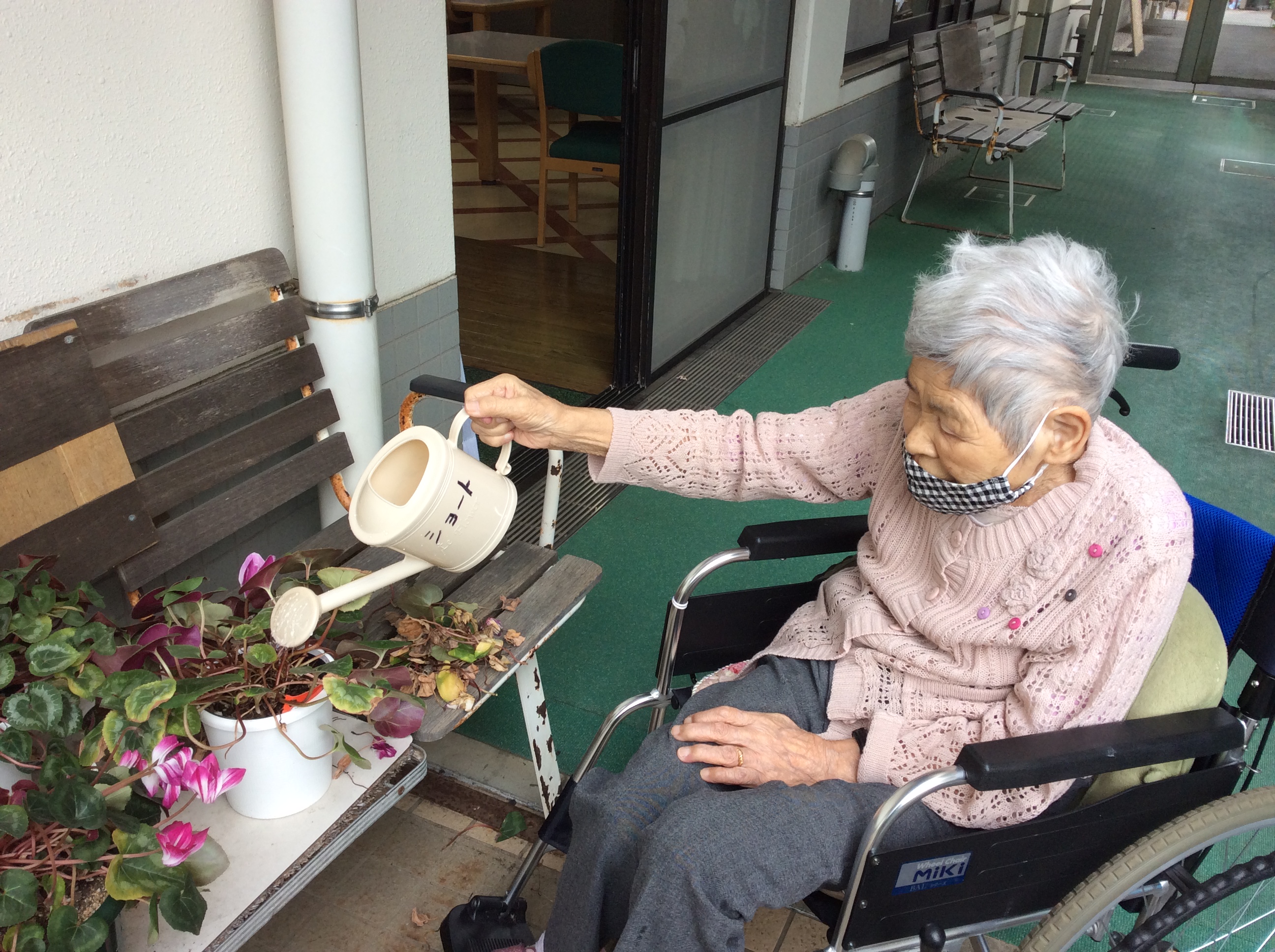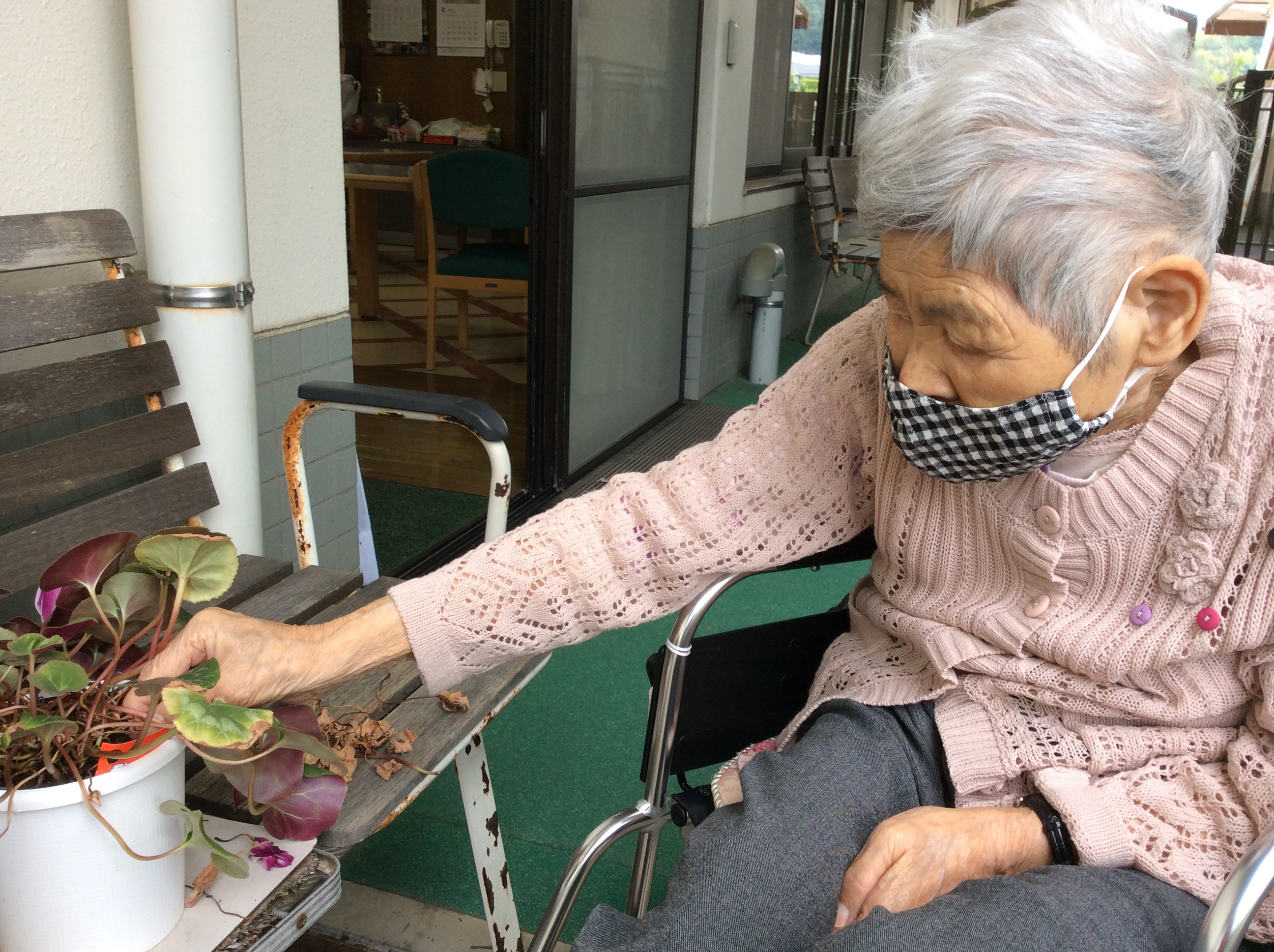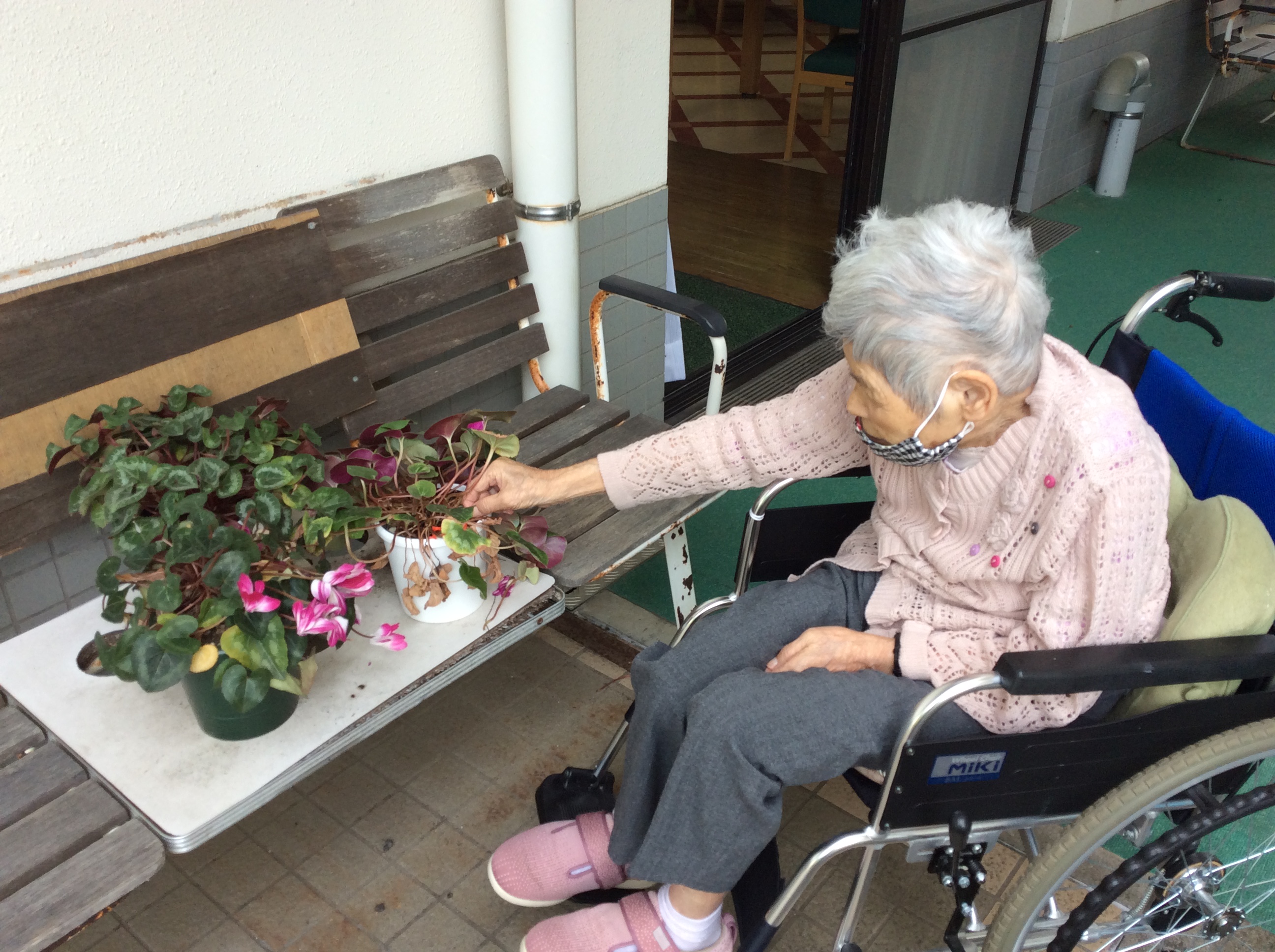 梅雨で雨が続いている中、今朝は天気が良くショートステイご利用者様に、庭で咲いているお花のお手入れや